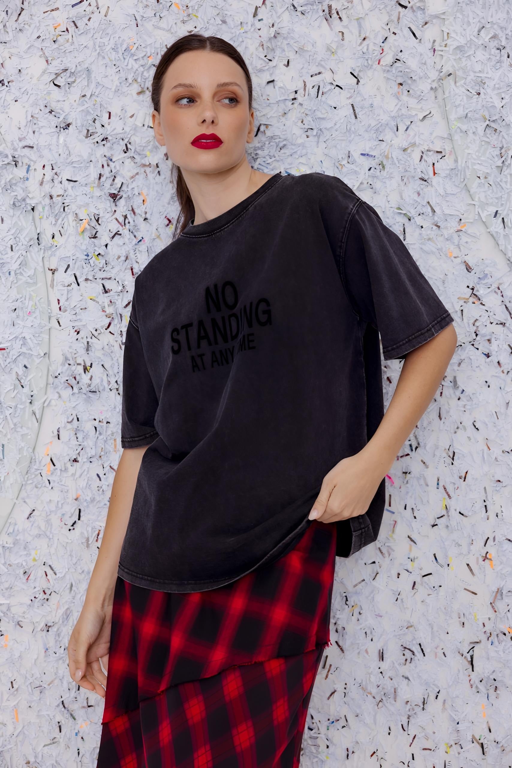 M.A. Dainty’s Horizontal Tee exudes effortless cool with an edgy twist. This straight-cut cotton tee features short sleeves and a faded red wash, finished with a bold red “No Standing at Any Time” print on the front.