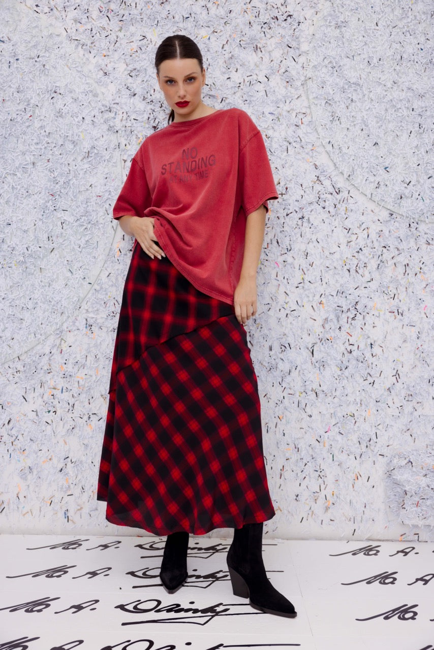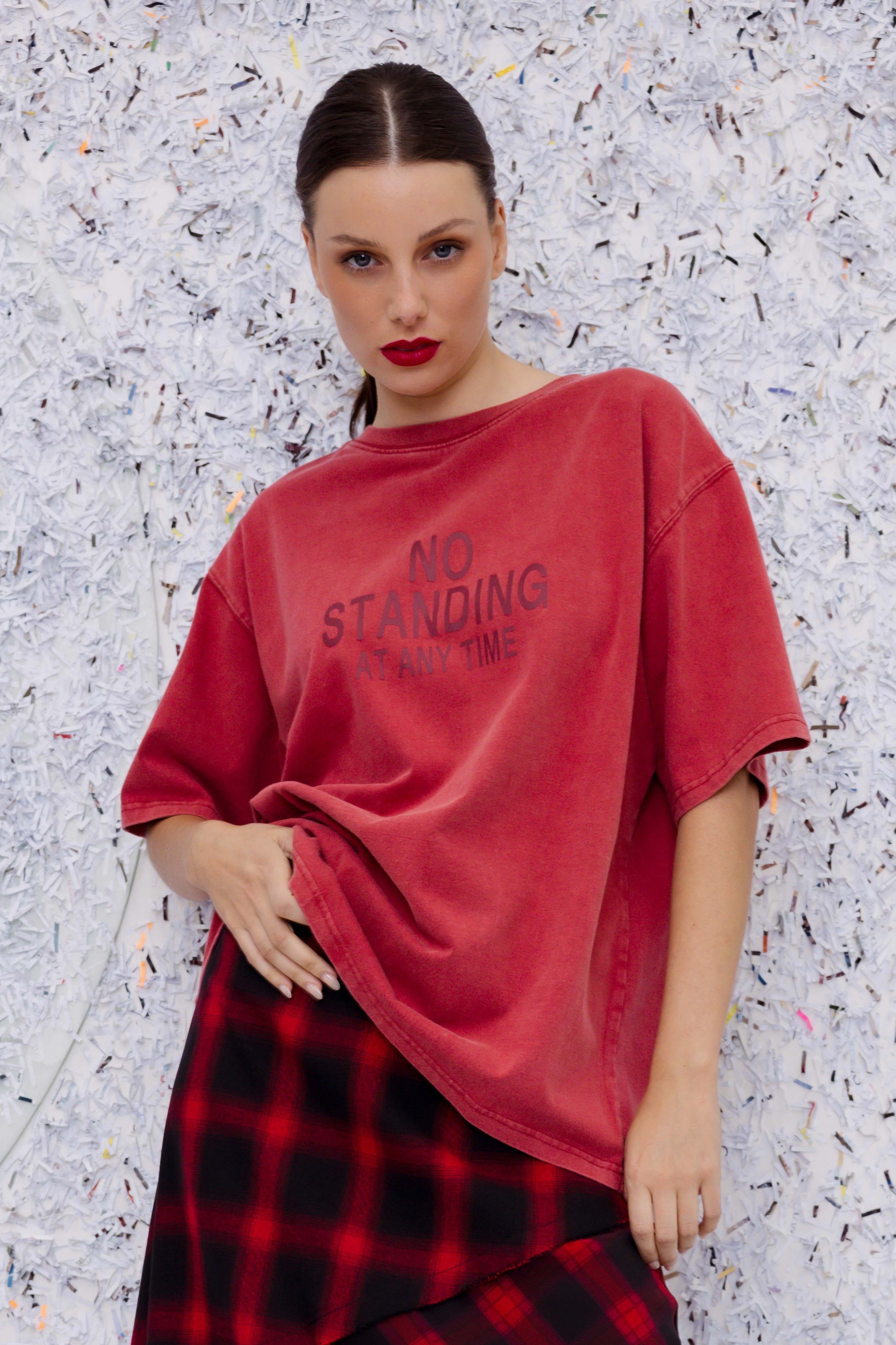 M.A. Dainty’s Horizontal Tee exudes effortless cool with an edgy twist. This straight-cut cotton tee features short sleeves and a faded red wash, finished with a bold red “No Standing at Any Time” print on the front.