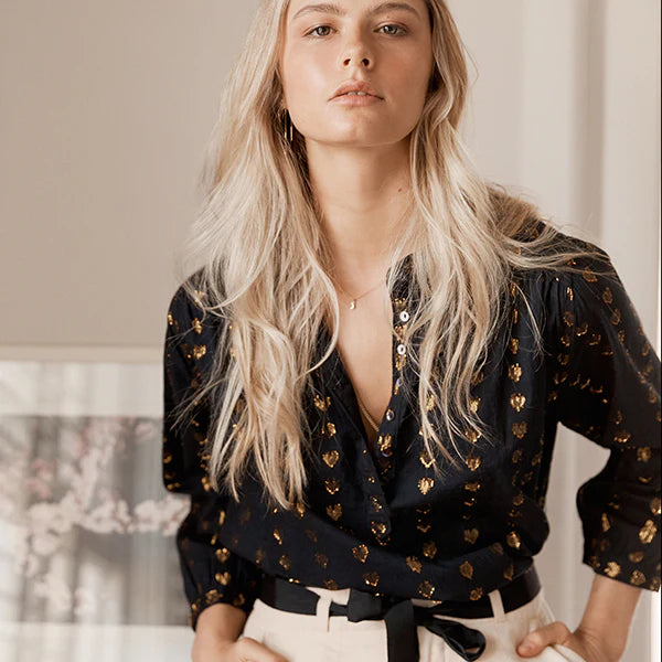 Ines Love Heart Blouse in Black w Silver/Gold Hearts