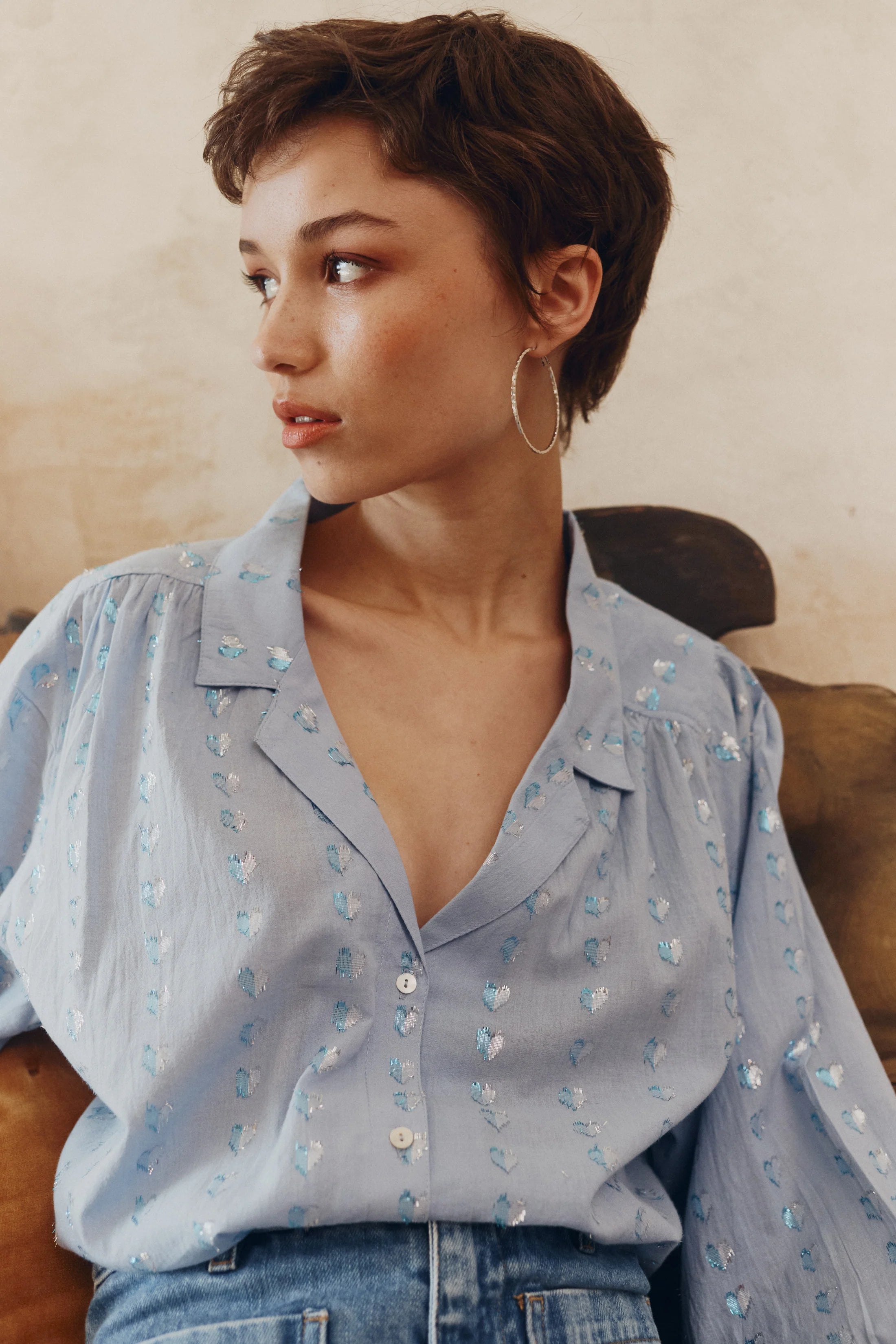 An open collared version of our Ines blouse in baby blue with gold silver hearts, has a delicate lapel collar & flattering v neckline.