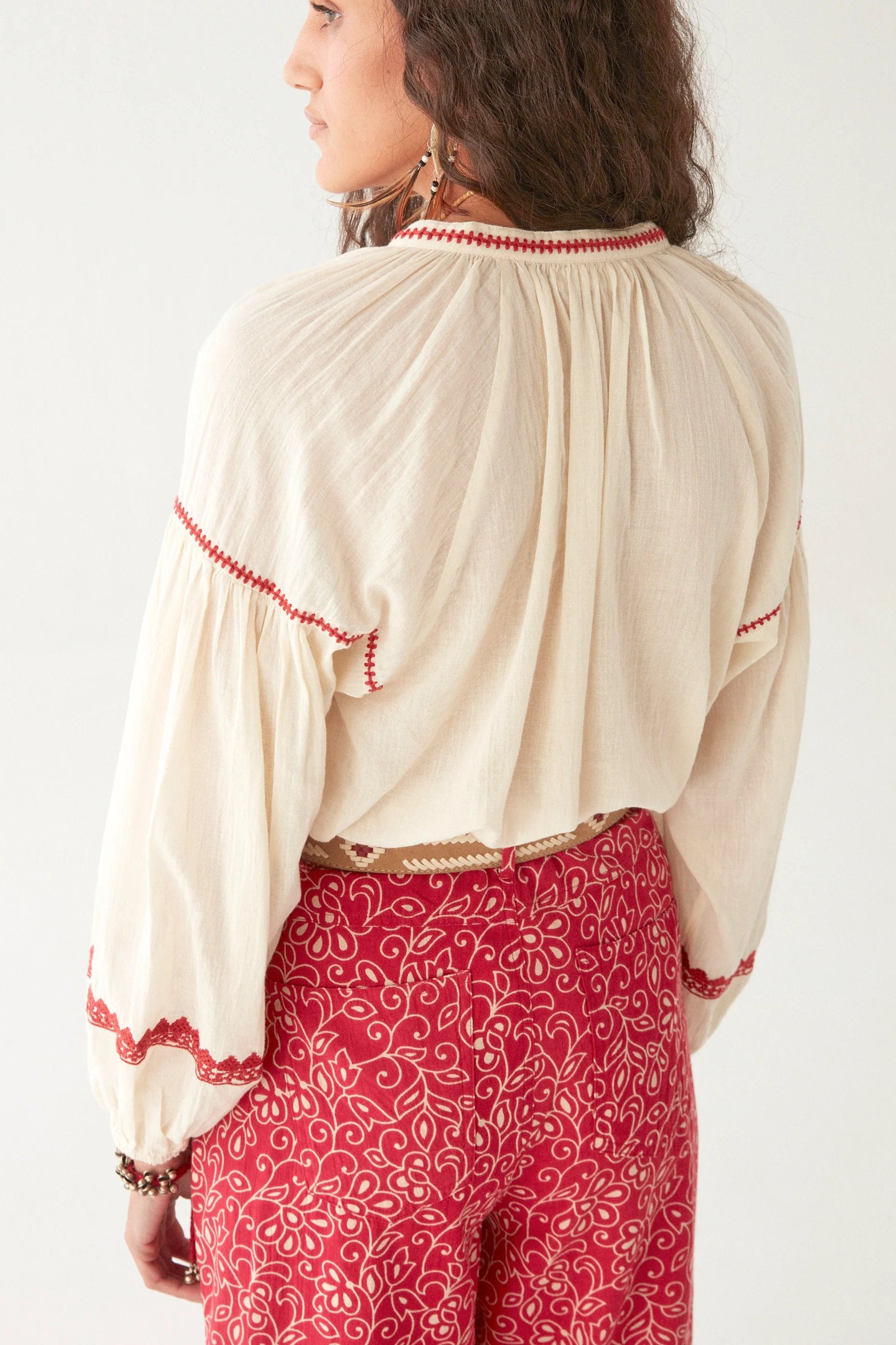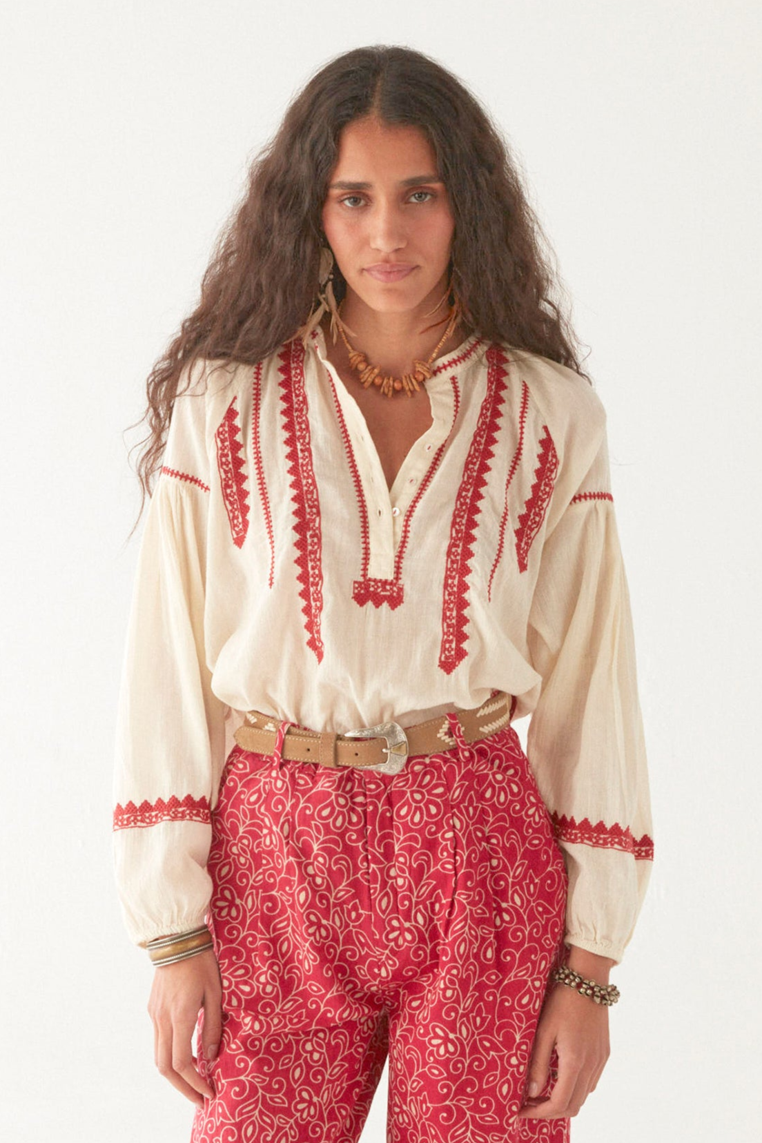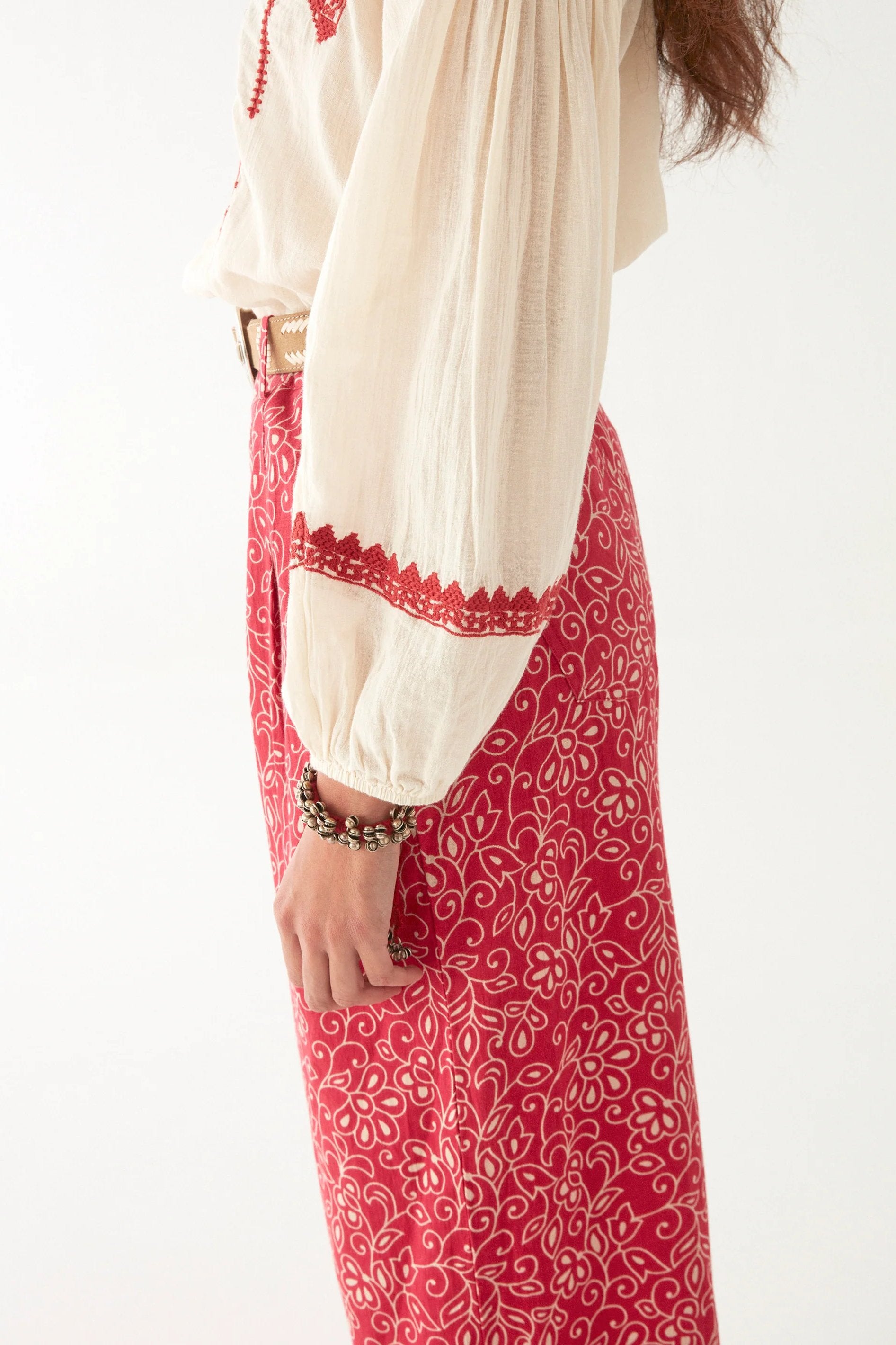 Not your typical white blouse—this one’s got a bite. Cut from light, easy cotton, it’s soft against the skin but hits with a punch of fiery red embroidery. The bold stitching slashes across the front and sleeves like a story half told, raw and untamed.