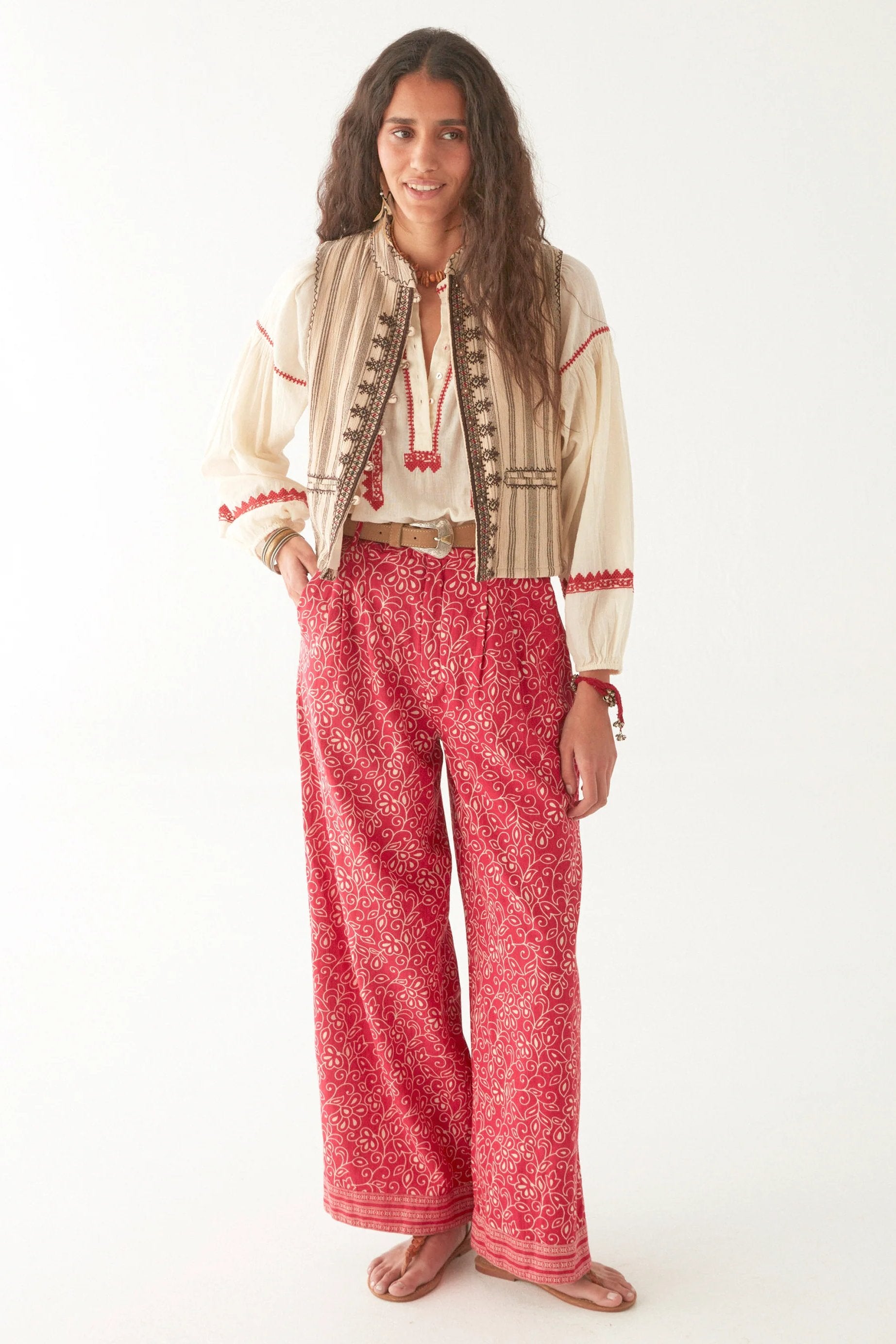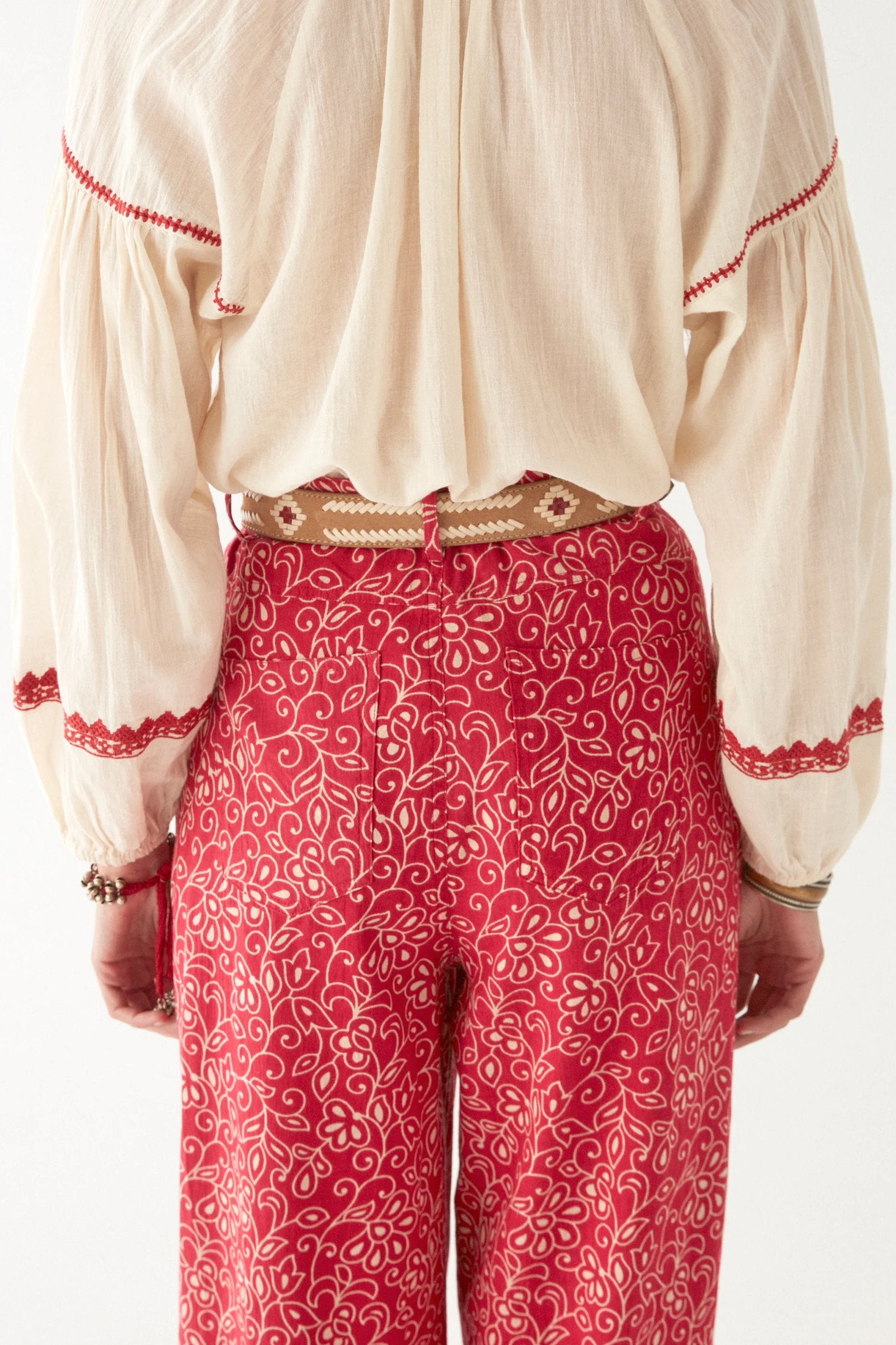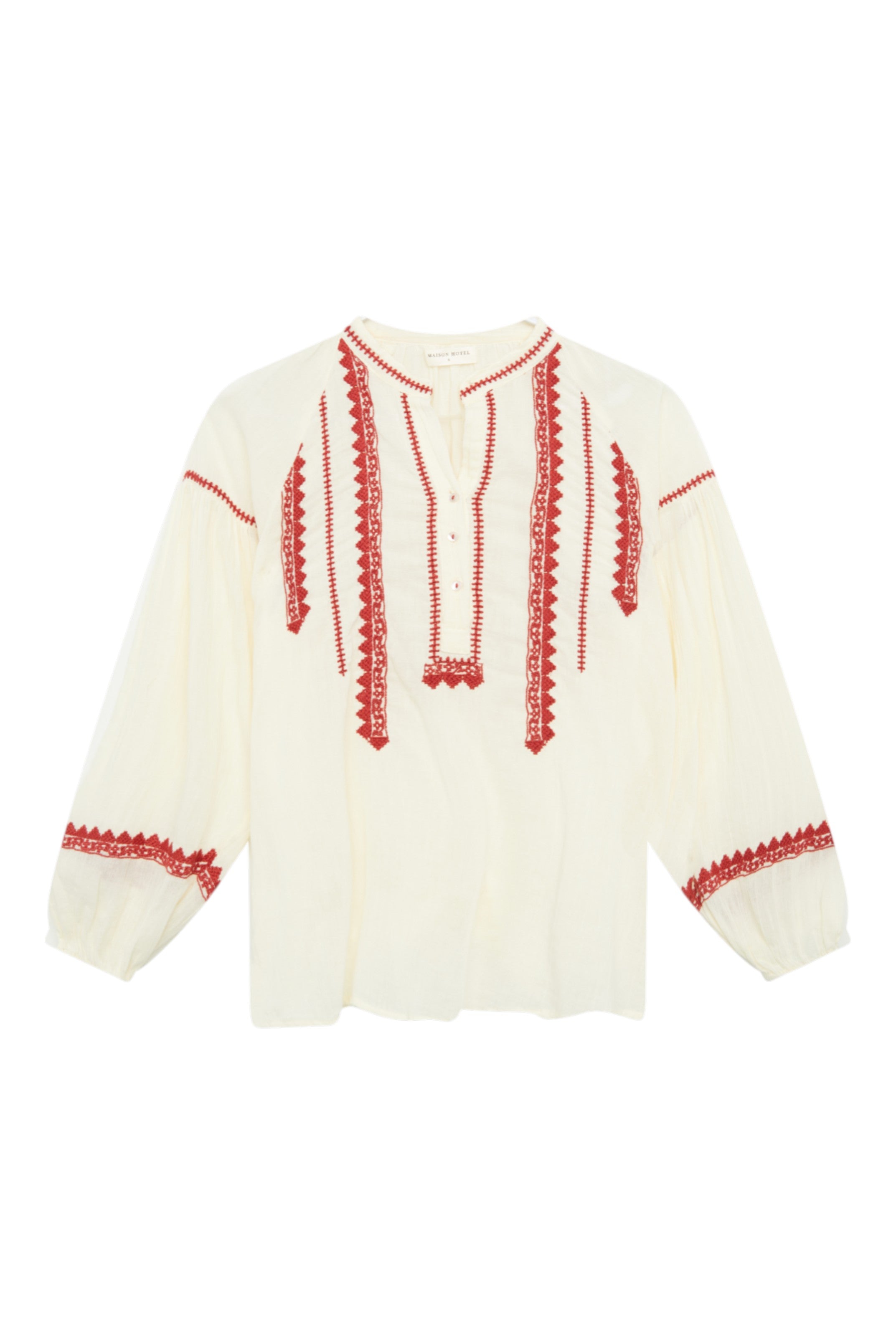 Not your typical white blouse—this one’s got a bite. Cut from light, easy cotton, it’s soft against the skin but hits with a punch of fiery red embroidery. The bold stitching slashes across the front and sleeves like a story half told, raw and untamed.