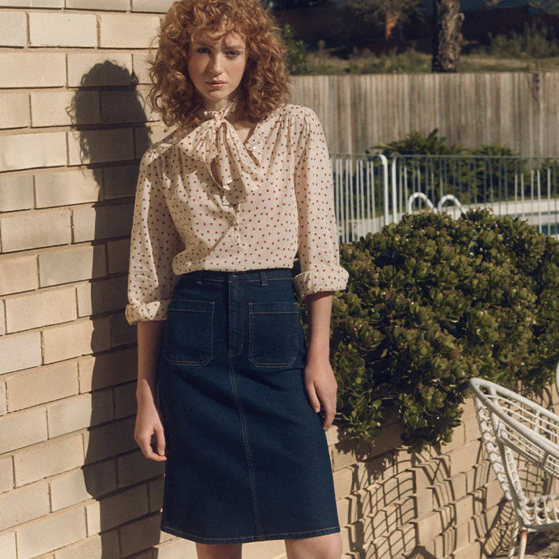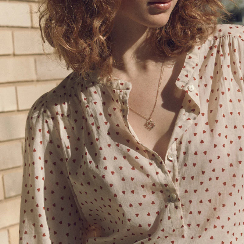 Our classic Amelie blouse in cotton voile with playful red hearts. Features soft gathers at front & back yoke. Belt can also be used tied in a bow around neck for a very french chic look.