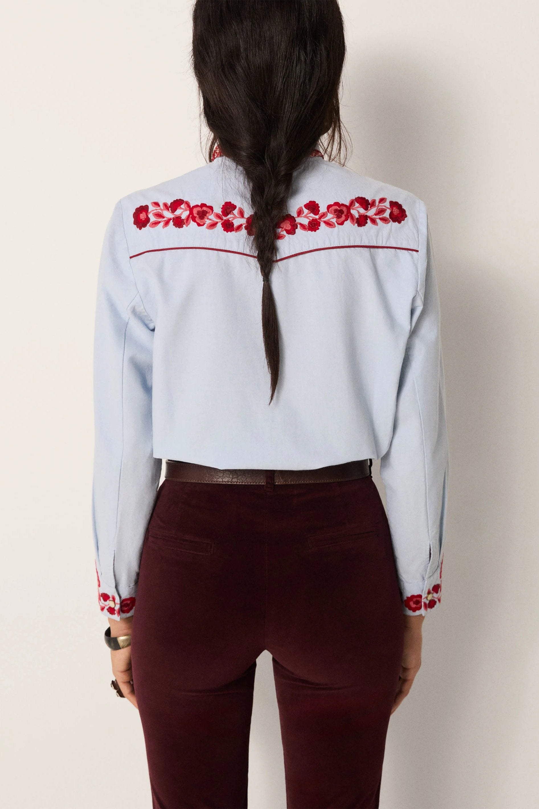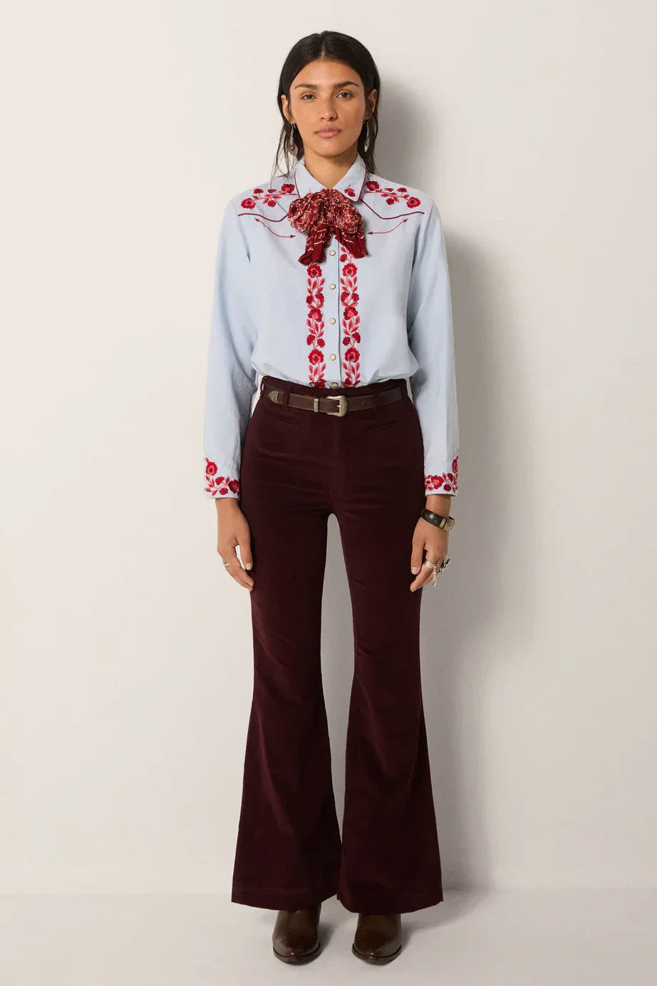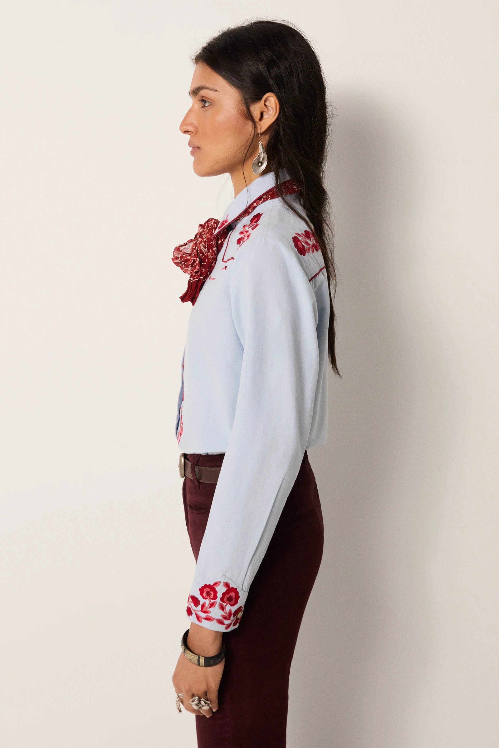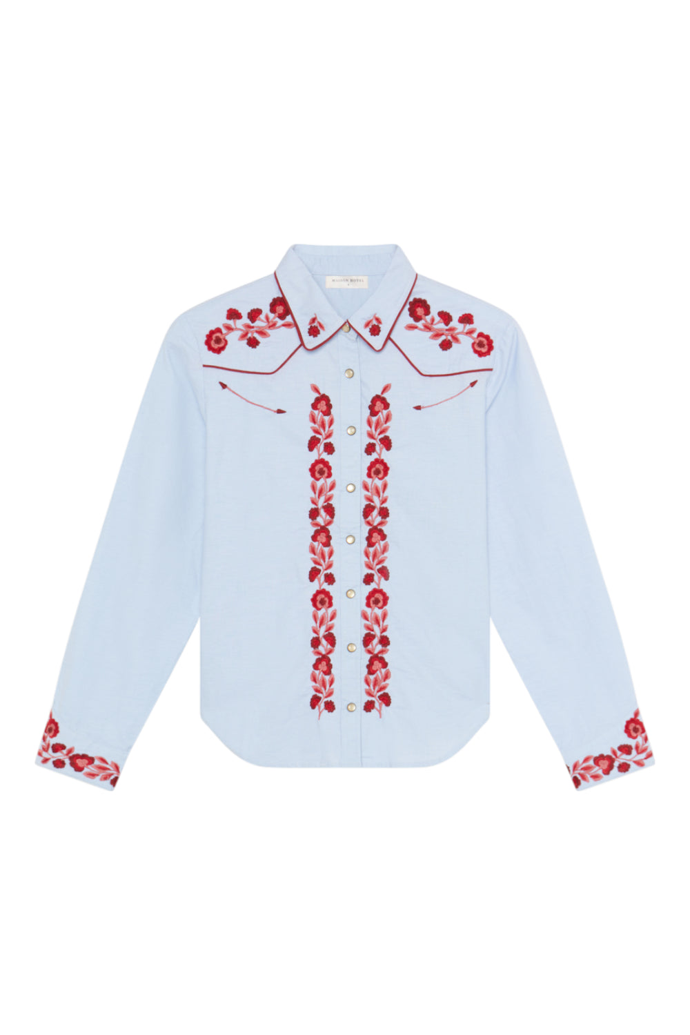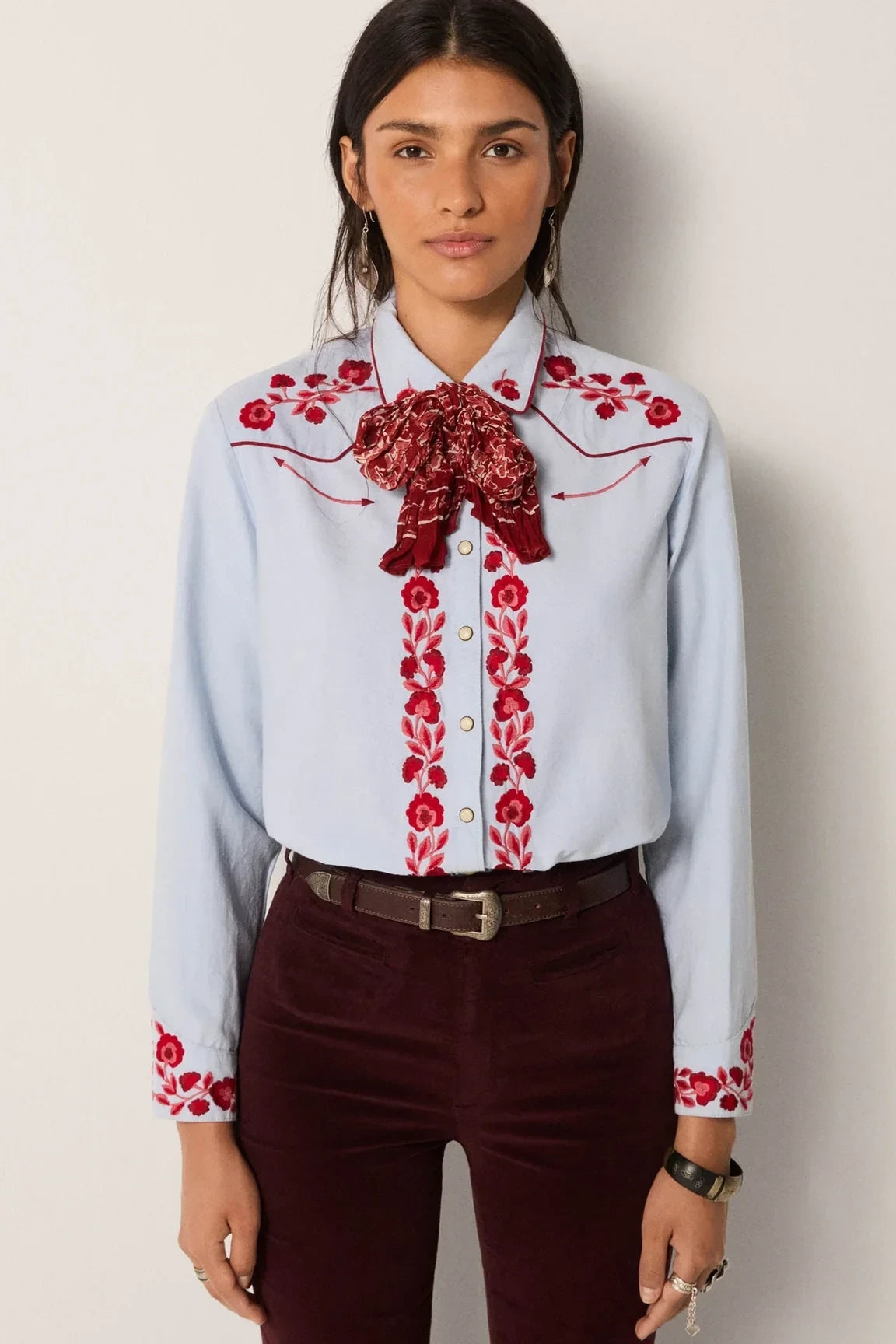 Striking red floral embroidery covers the chest, cuffs and button placket, while snap buttons underline its Western reference. The contrast feels bold yet crafted.