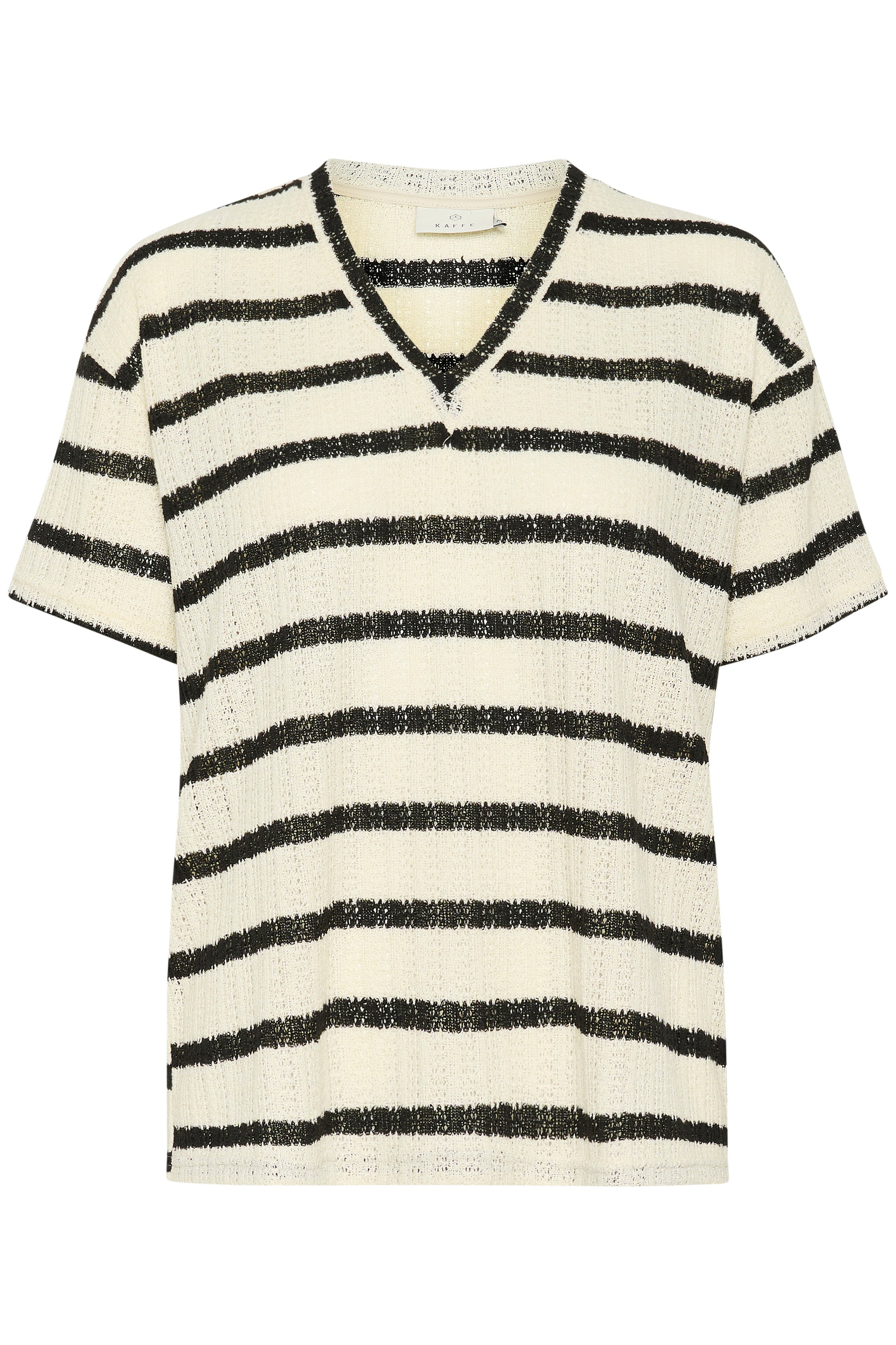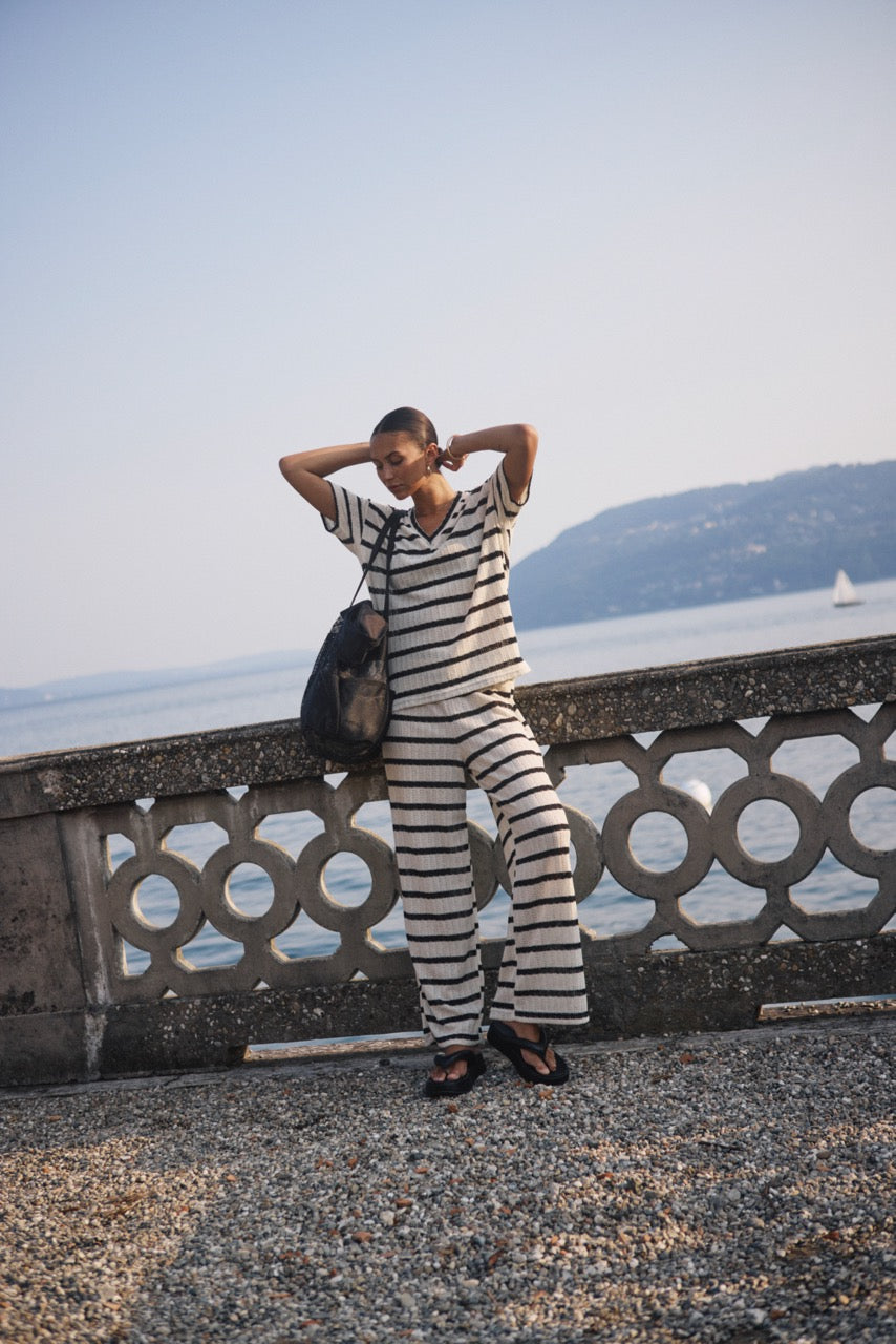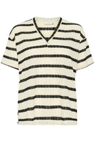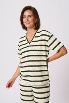 Striped short sleeve top featuring a straight, boxy fit and a distinctive V-neck. The soft, textured knit offers effortless appeal and a breezy silhouette with horizontal stripes adding a bold graphic twist.