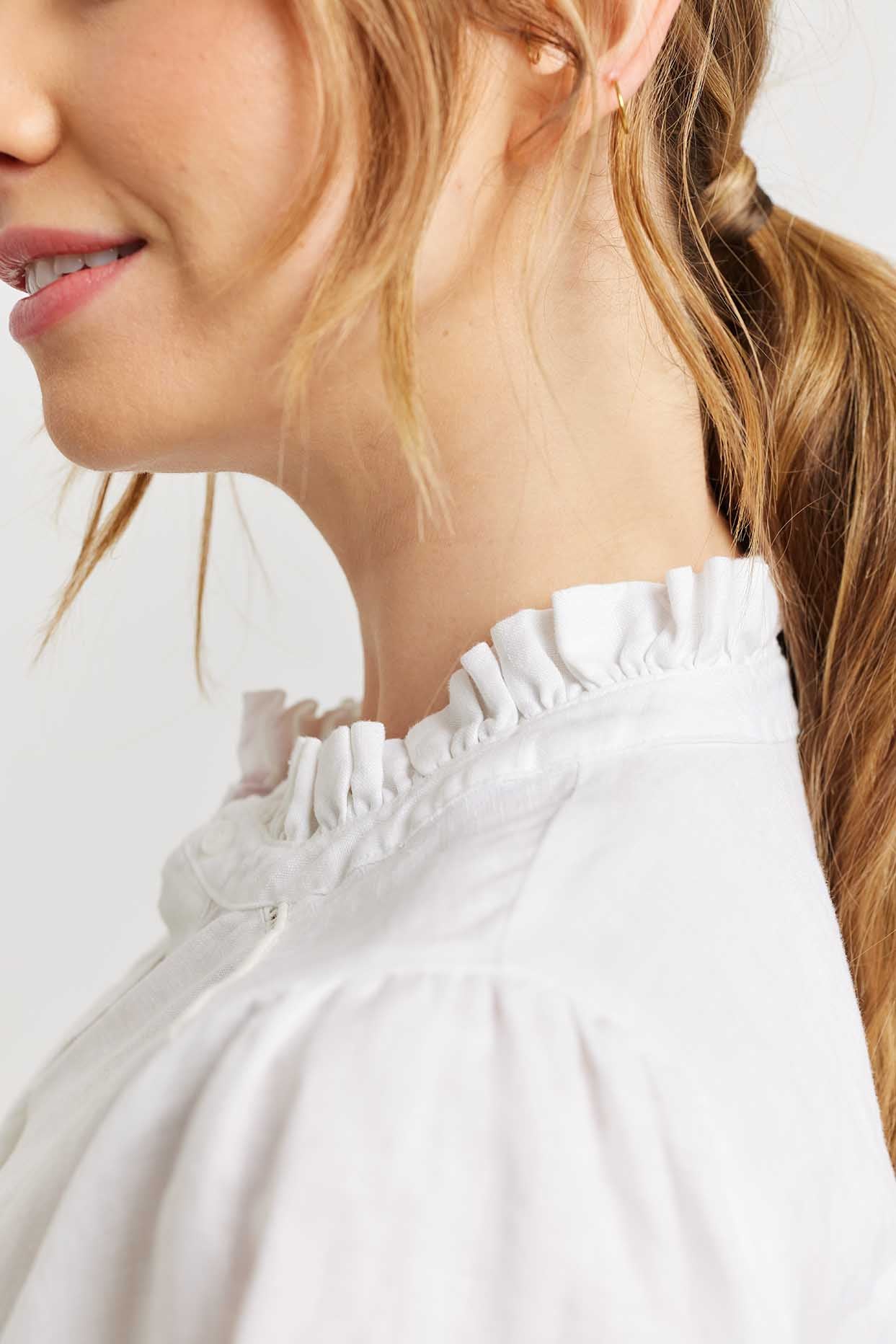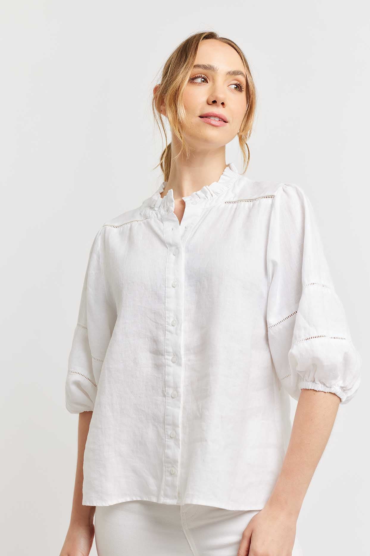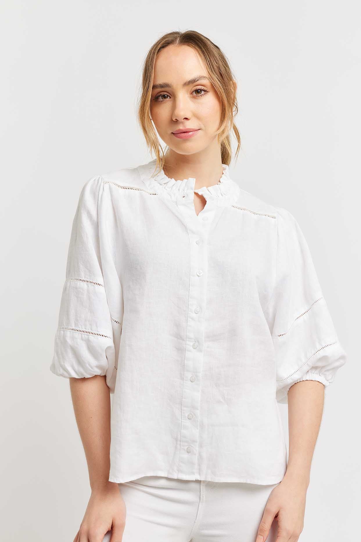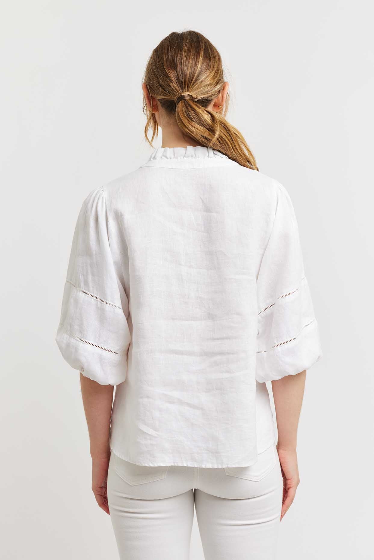 Experience the luxury of Lia Shirt in White, crafted with delicate frills around the neckline and decorative stitching on the sleeves for a sophisticated look. Enjoy the perfect summer silhouette with its collared button down elbow length design. A timelessly exclusive shirt that makes a statement.