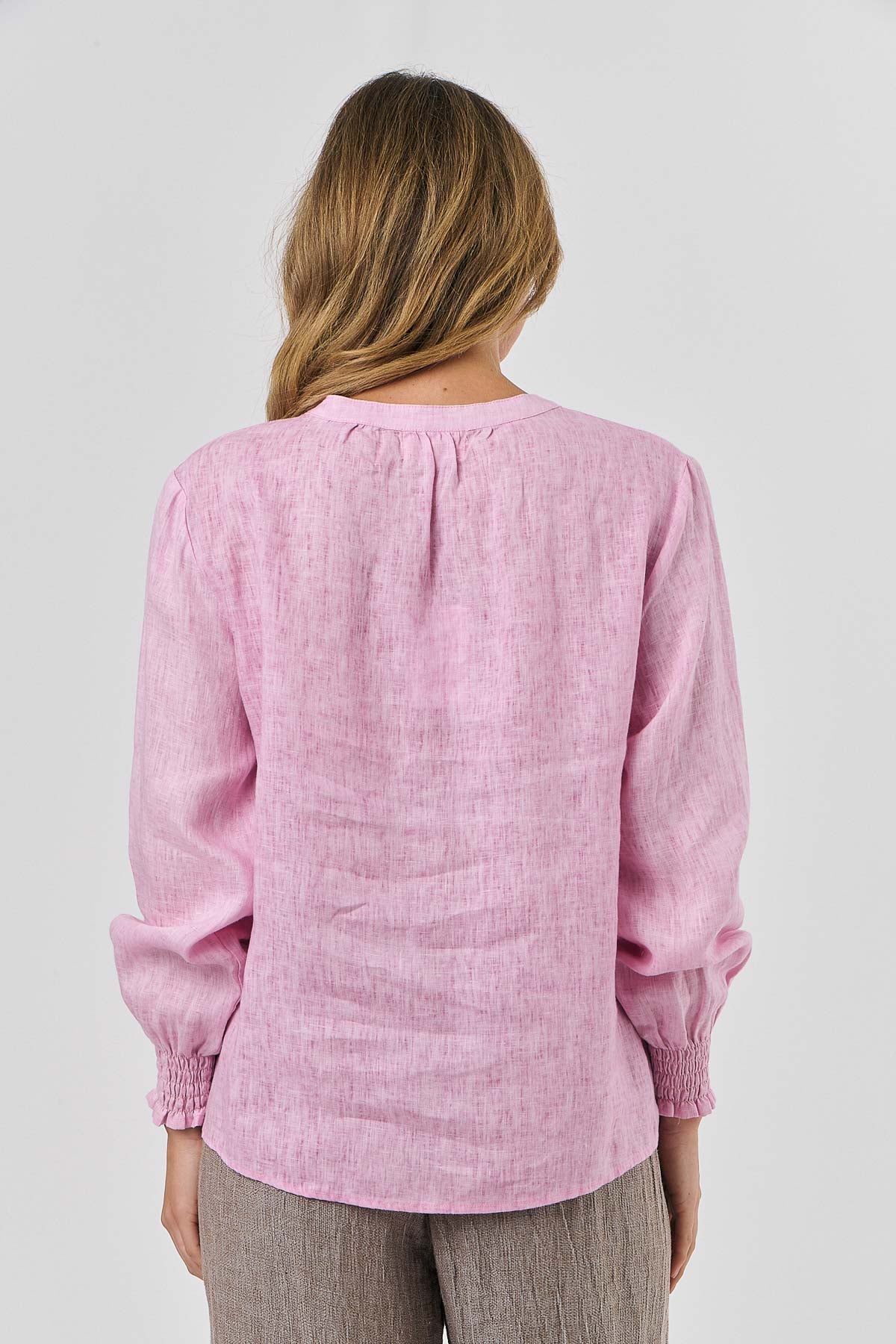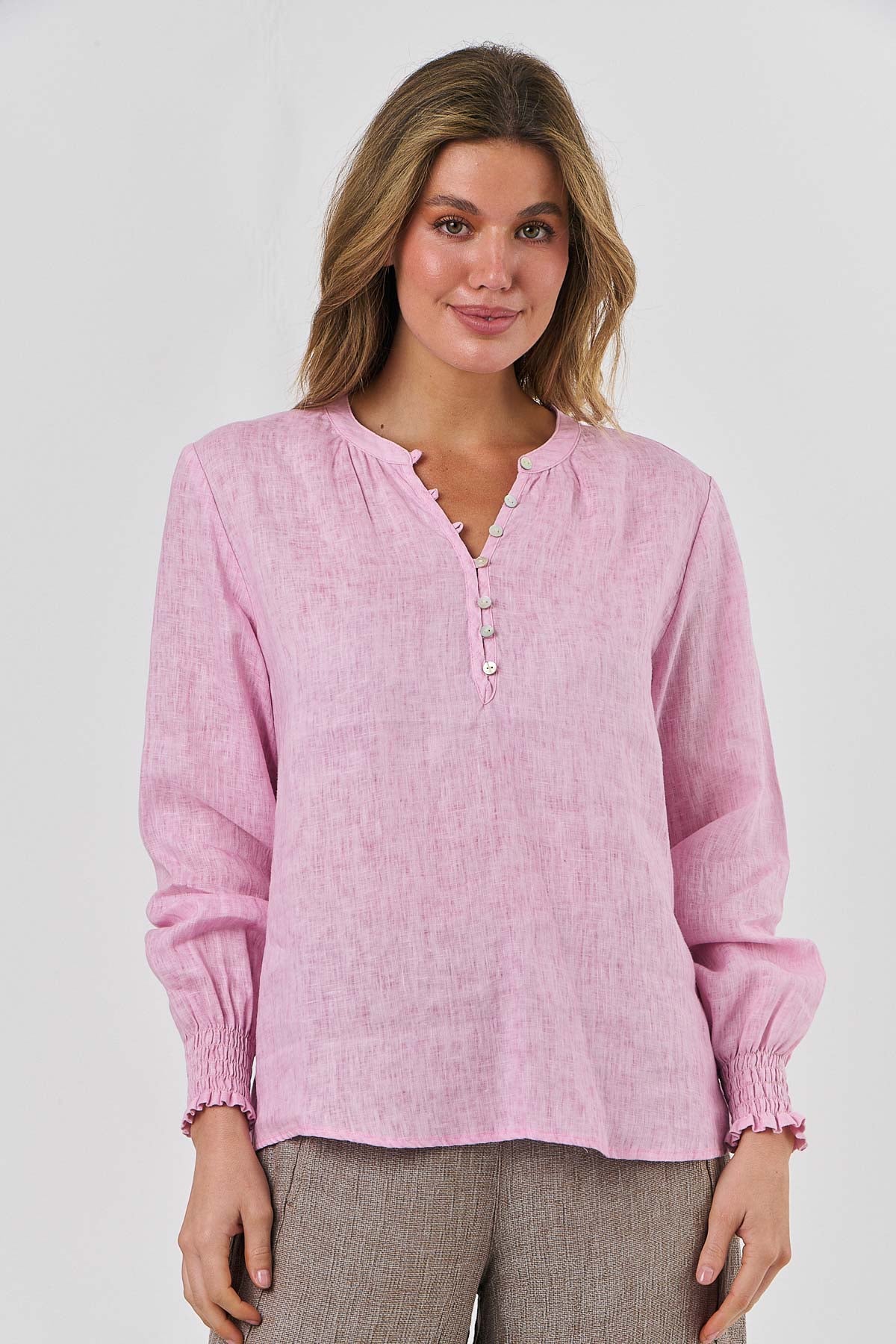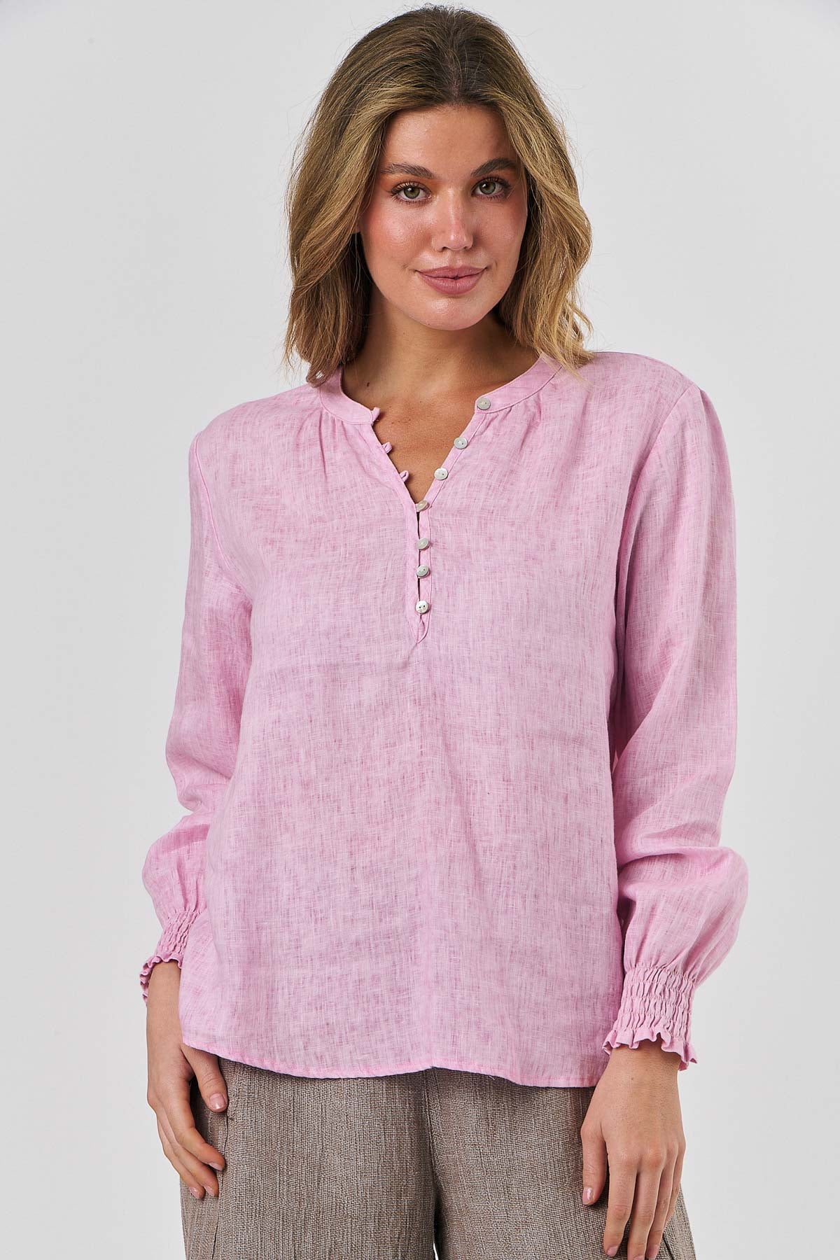 This classic long sleeved top has a split crew v neck that can be worn open for a more relaxed vibe or buttoned up for a more tailored look. Small mother of pearl buttons.
