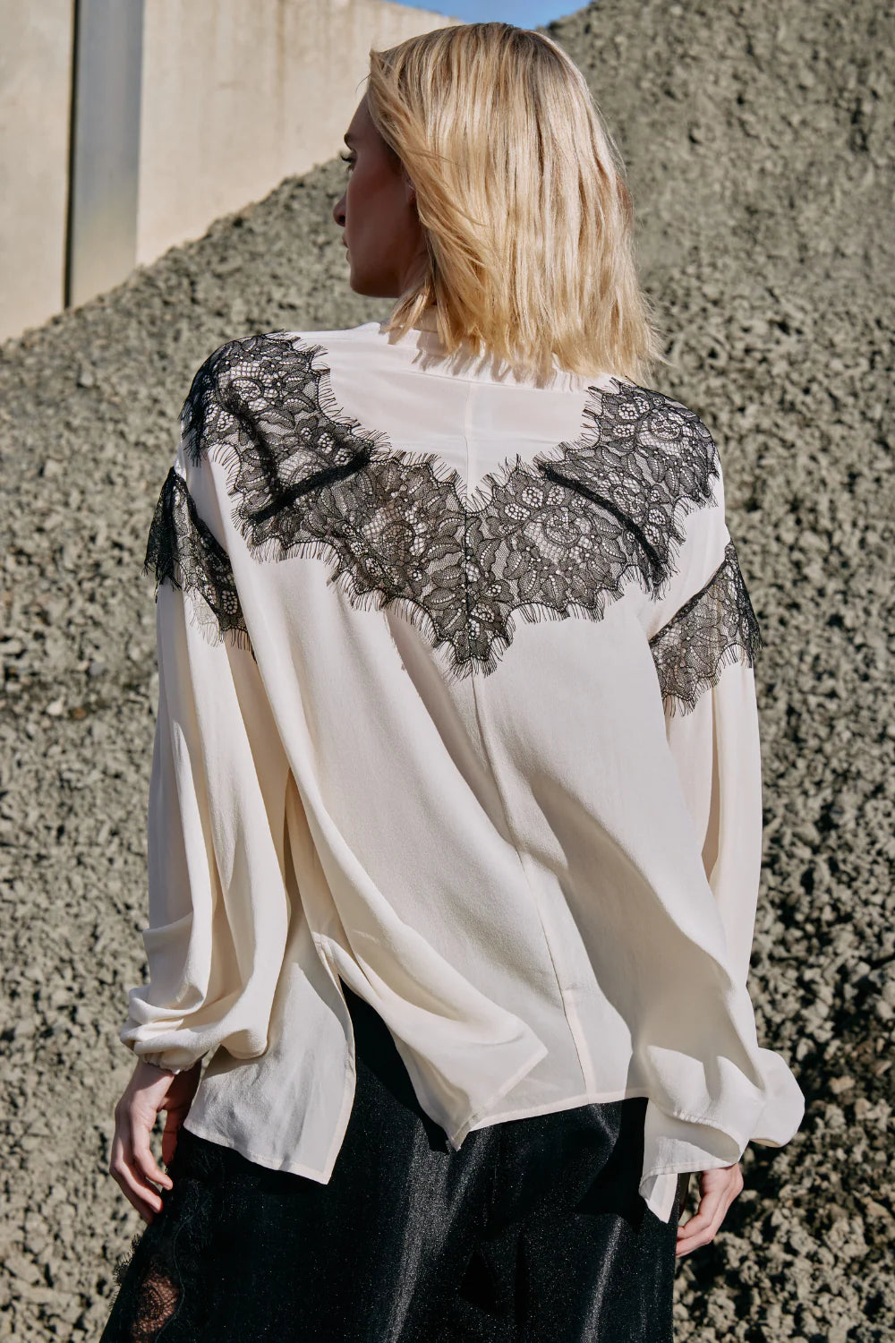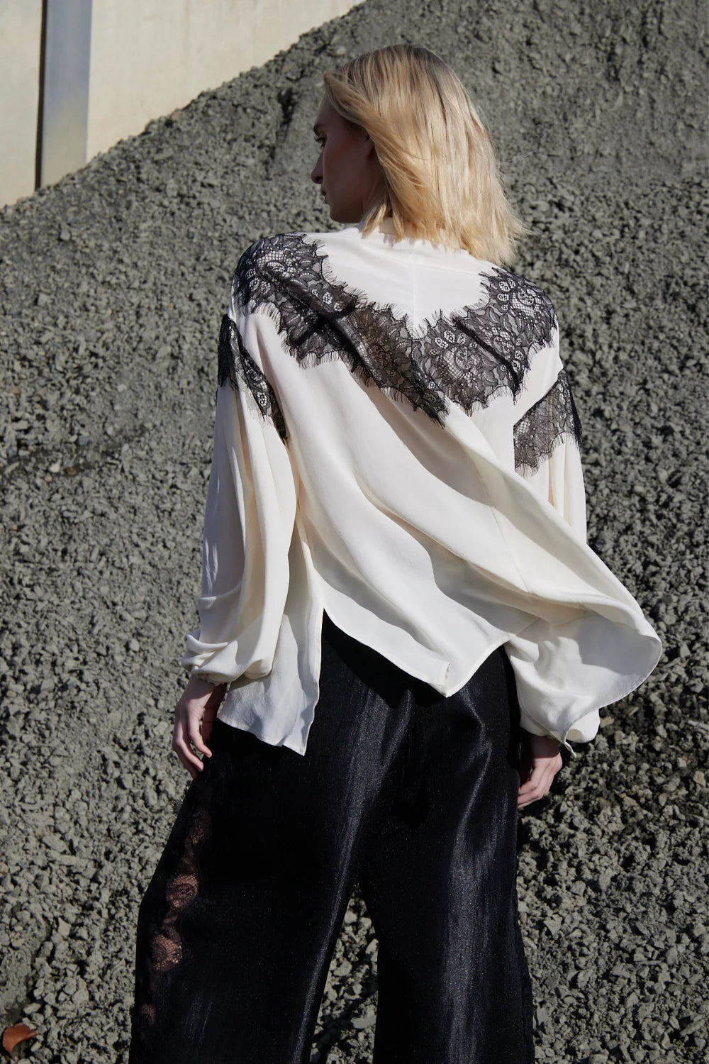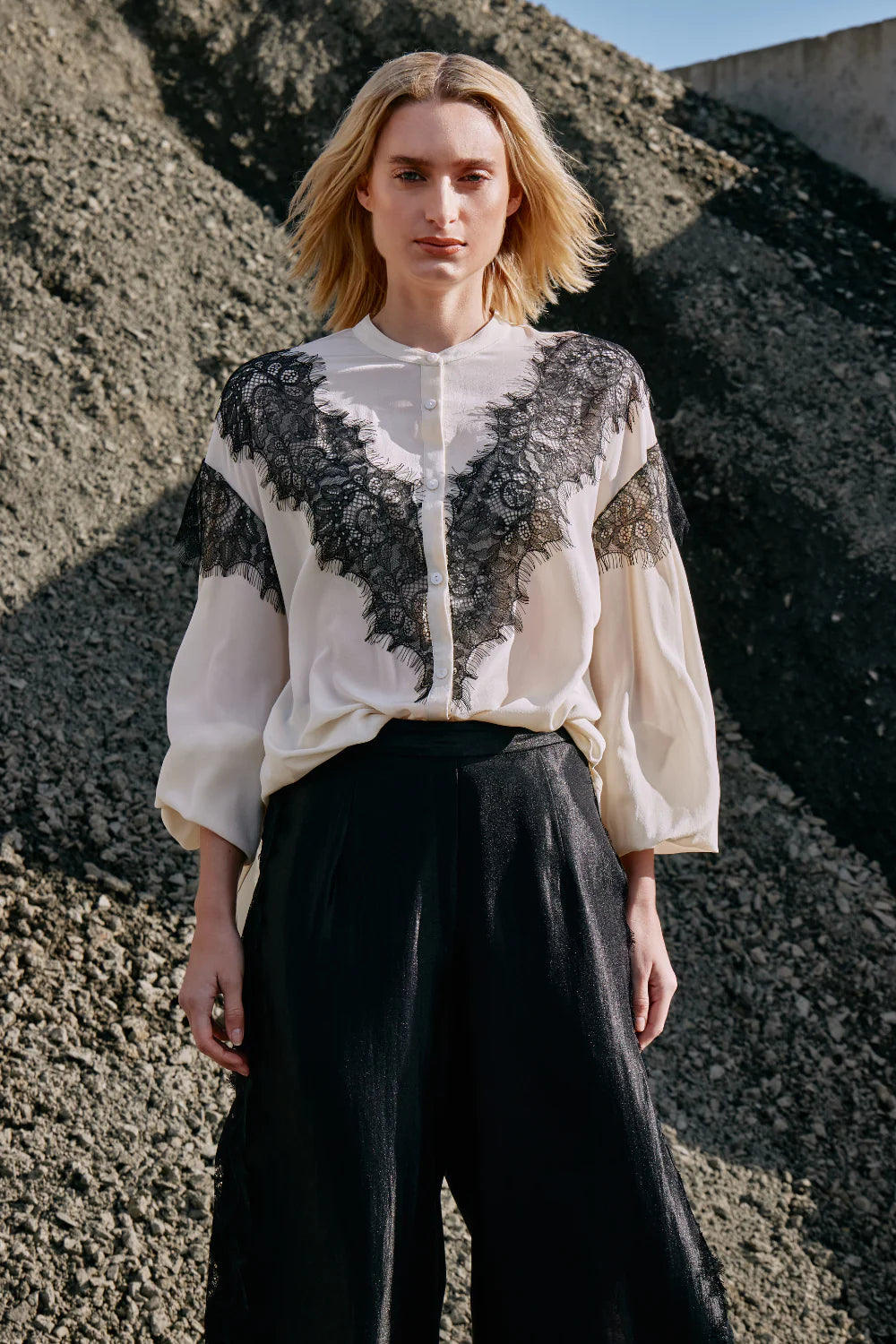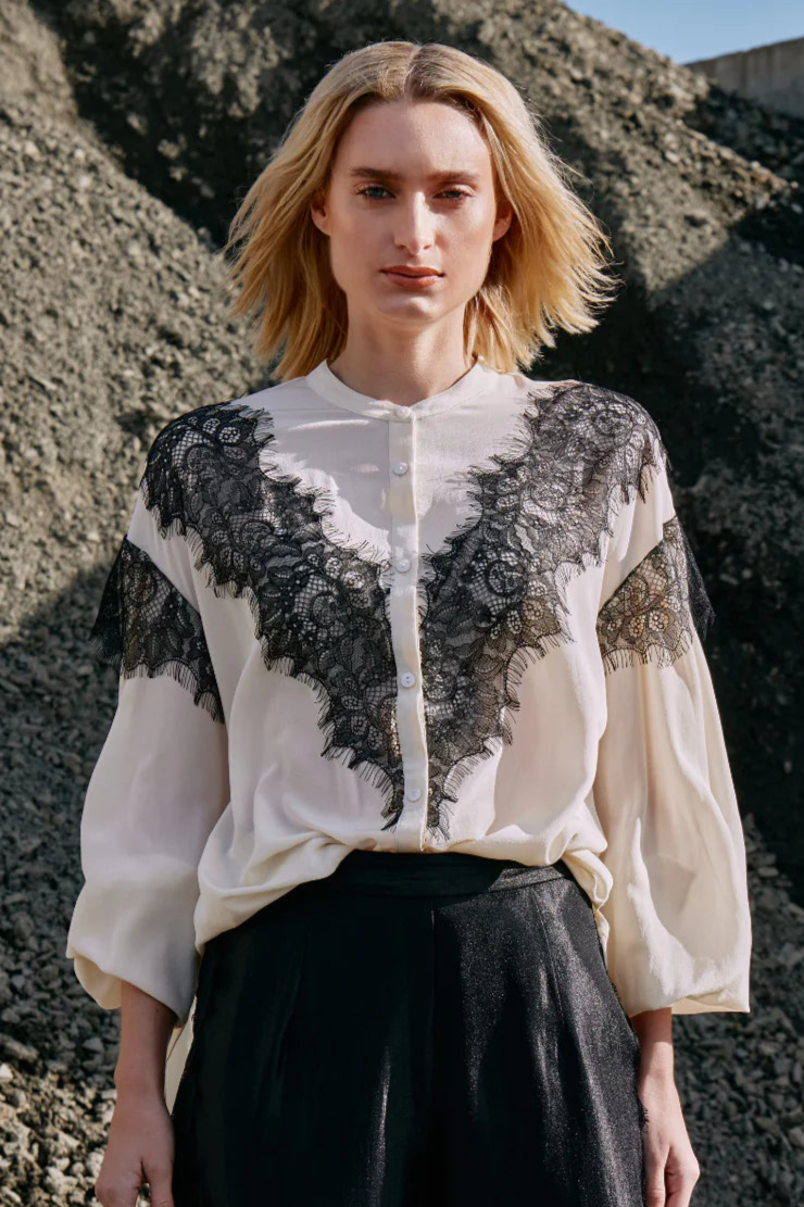 Experience the one-of-a-kind style of the M.A.Dainty Lashes Shirt. Elegant and versatile, this design is perfect for any occasion. Featuring balloon sleeves, elasticated cuffs, contrast lace, and a stand collar.