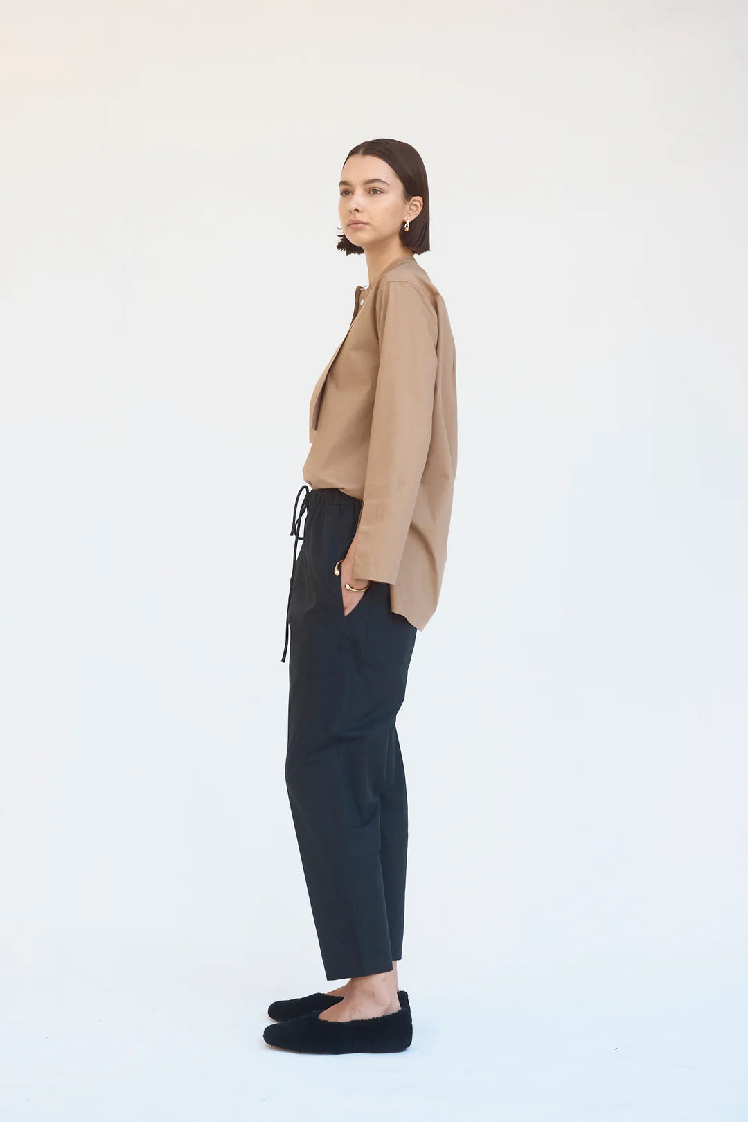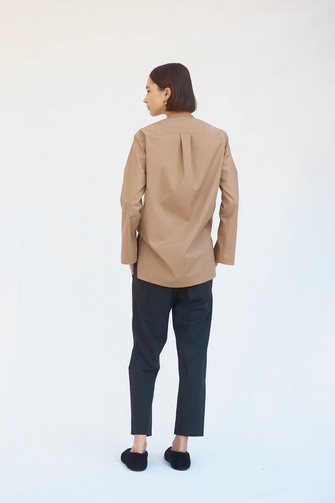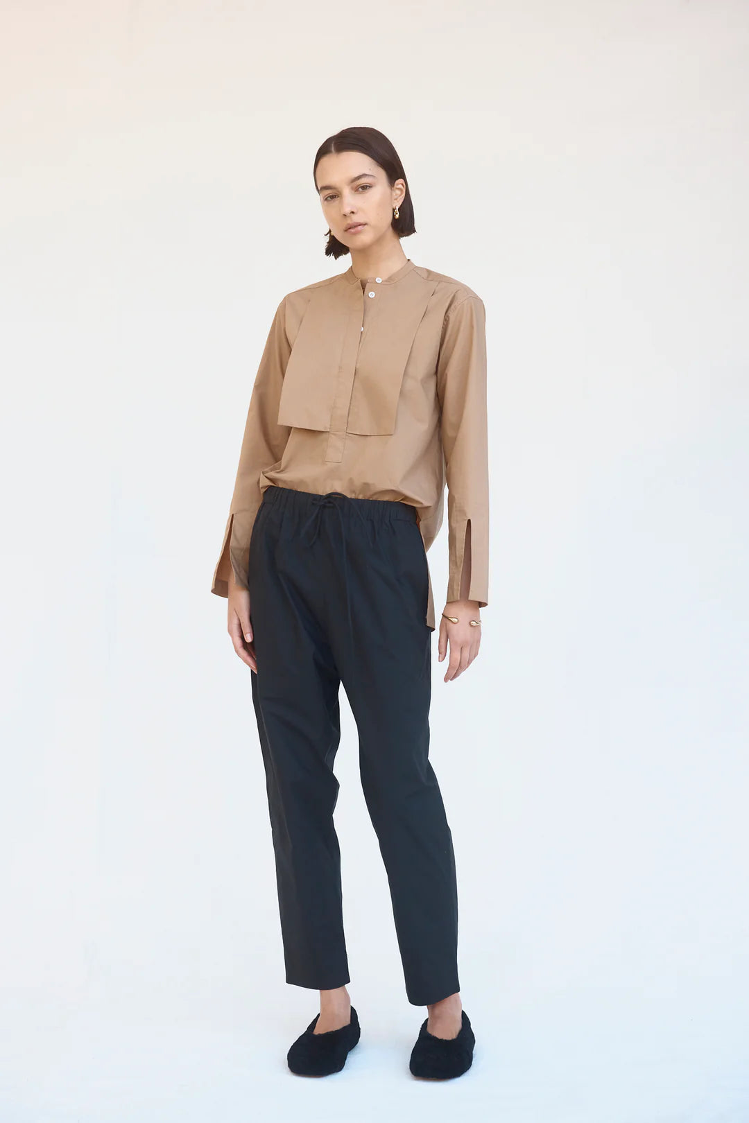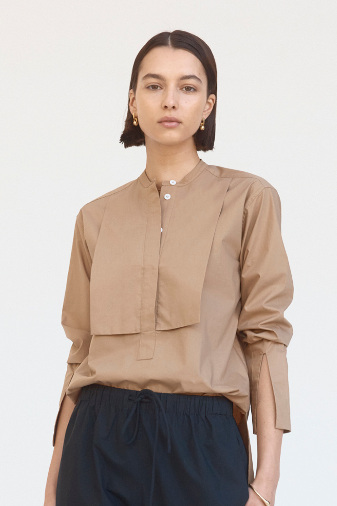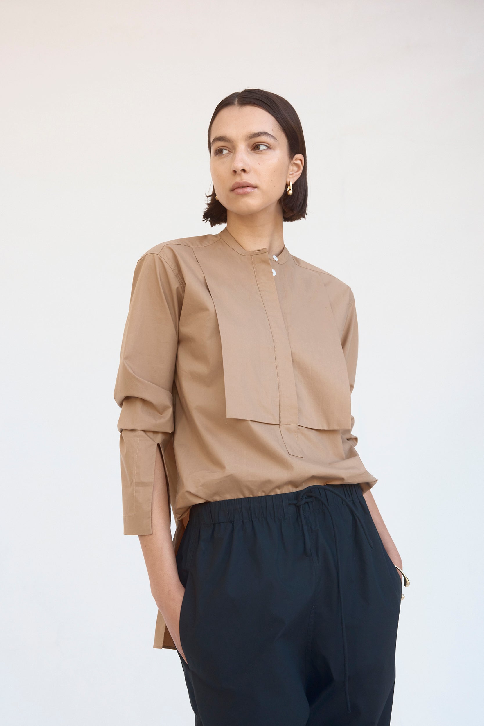 Taking cues from androgynous codes, the Maeve shirt features a grandpa collar, crisp double thickness bib and tidy concealed placket. Subtle glances of wrist via the cuff split instill the silhouettes with a refined feel.