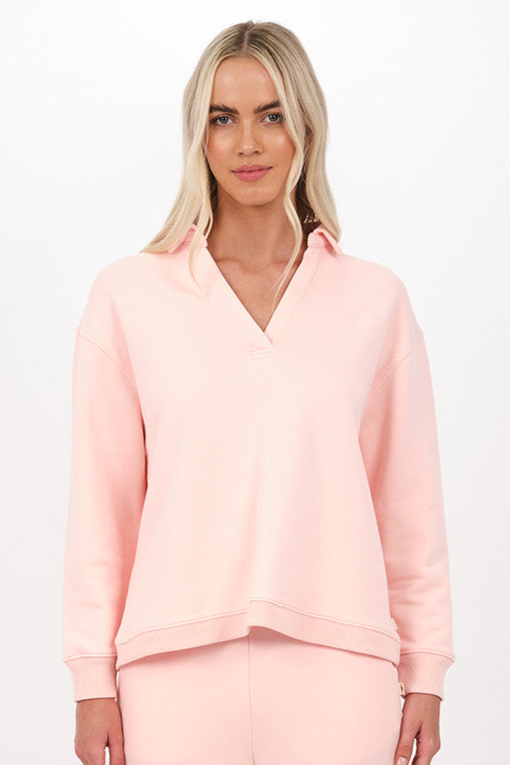 Meet the Titchie. Mela Sweater. A long sleeve, collared sweater with a v-neckline. It features an easy fit throughout and sits just above the hip. Finished with drop shoulder and wide ribbed cuffs. Made from a plush French Terry for extra comfort. It's super soft on the outside and cosy on the inside. Designed to wear with the matching Haze Trackpant.