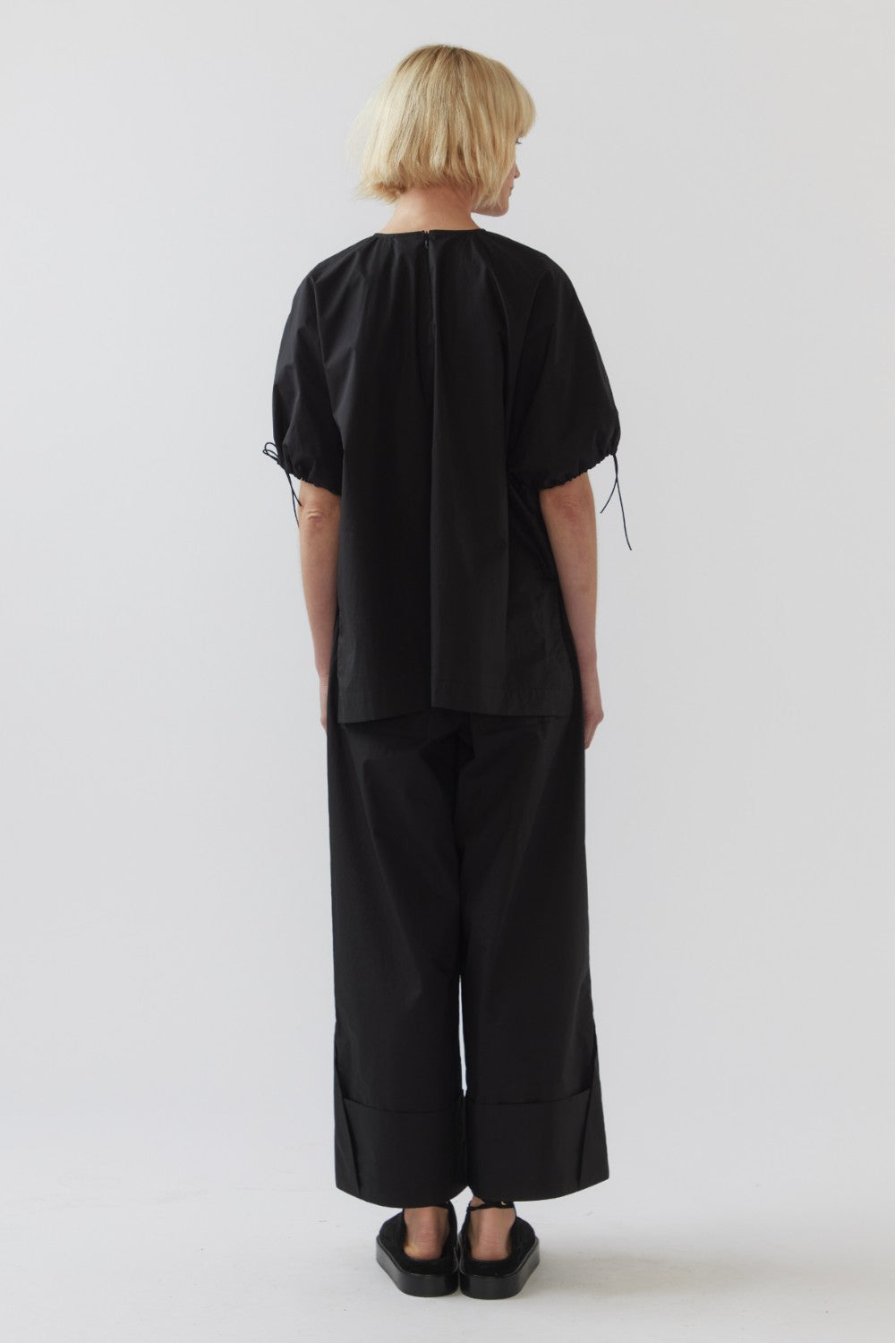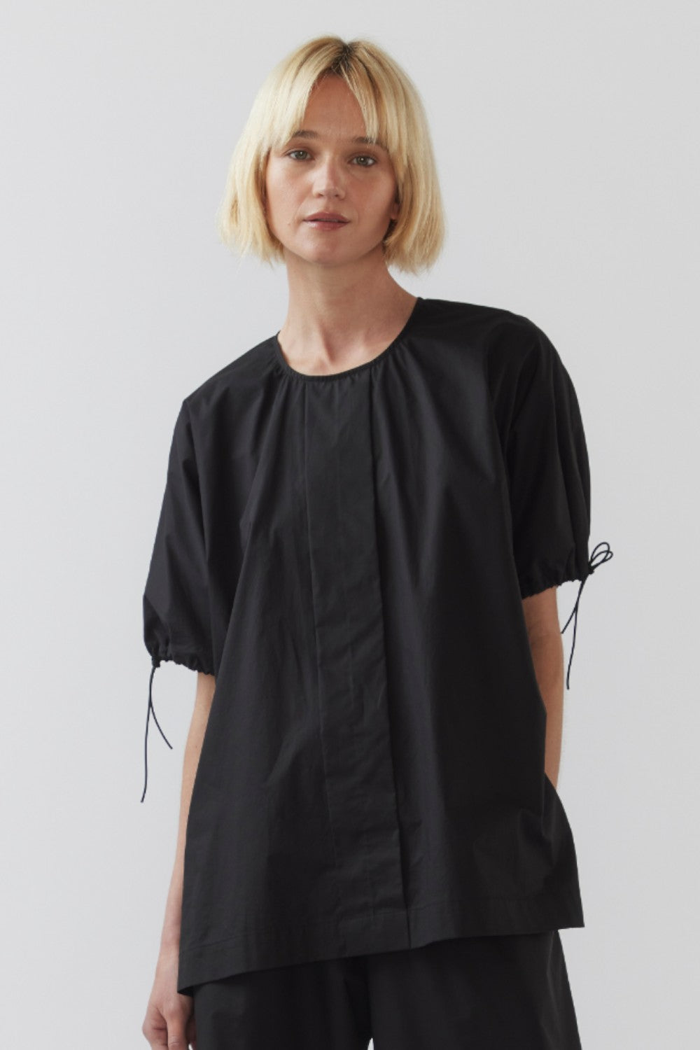 This round neck top effortlessly blends feminine details with modern design. The puff sleeves add a playful, voluminous touch, while the tie detail at the cuff offers an adjustable and unique element. A panel detail at the front creates visual interest, enhancing the top’s flattering shape. Finished with a back neck zip for a clean look and side splits that allow for movement and ease, this top offers both style and comfort.