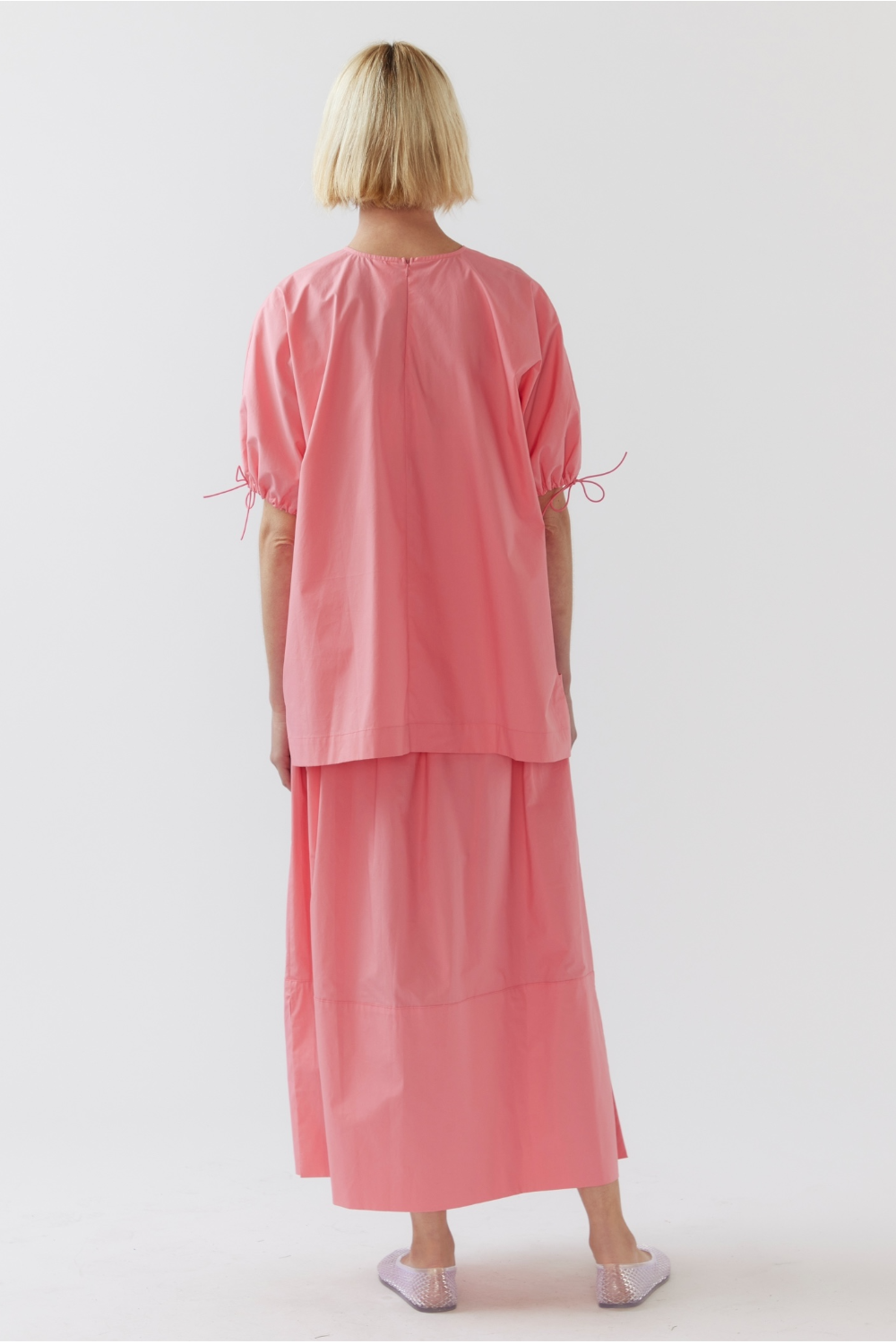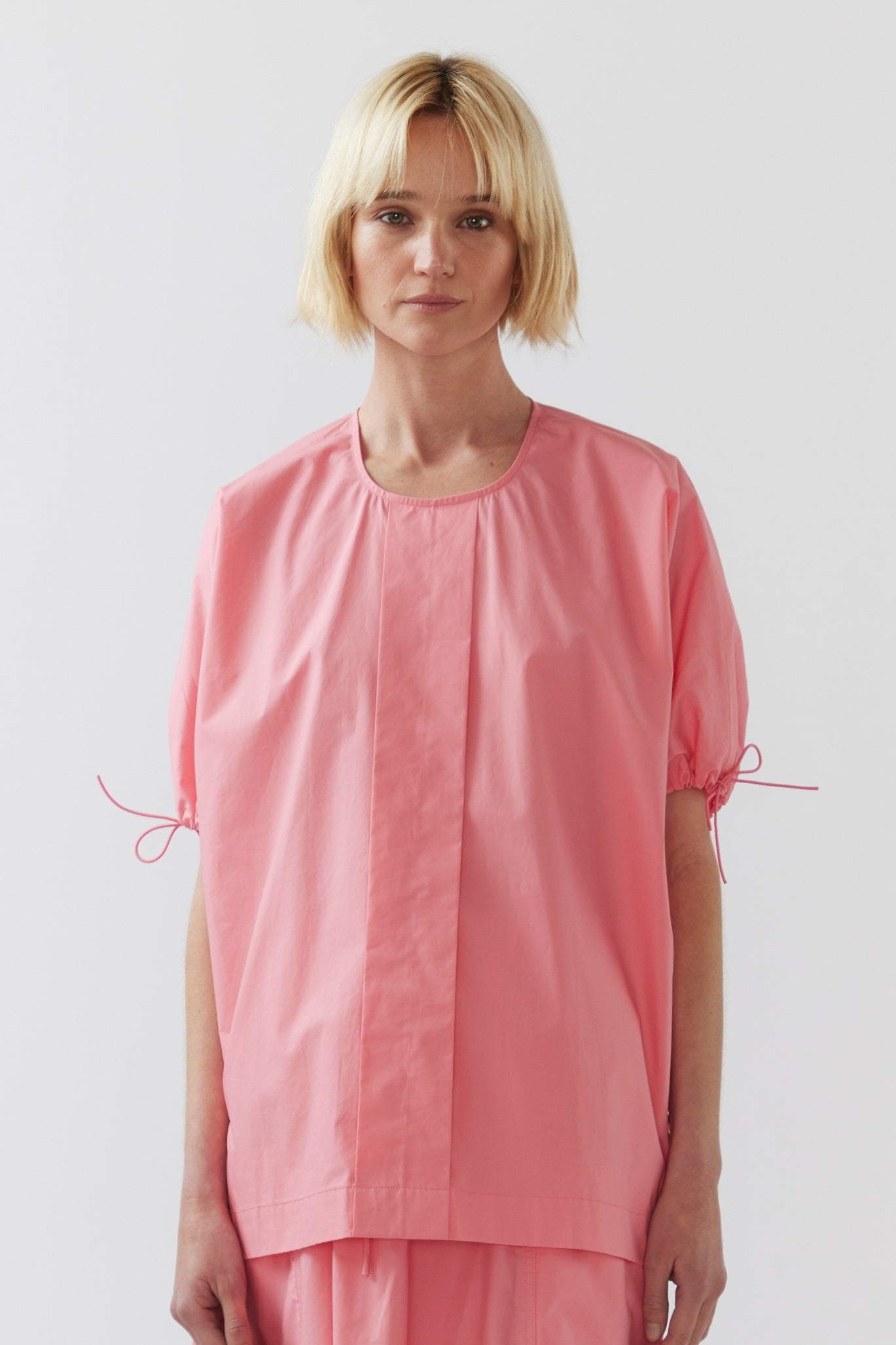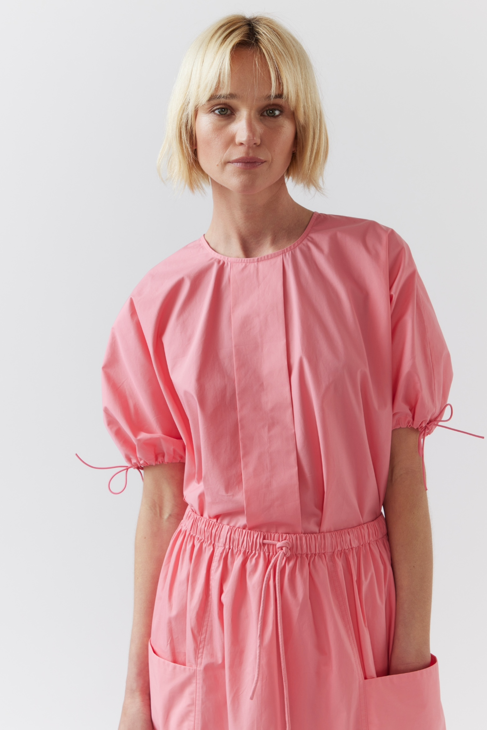This round neck top effortlessly blends feminine details with modern design. The puff sleeves add a playful, voluminous touch, while the tie detail at the cuff offers an adjustable and unique element. A panel detail at the front creates visual interest, enhancing the top’s flattering shape. Finished with a back neck zip for a clean look and side splits that allow for movement and ease, this top offers both style and comfort.
