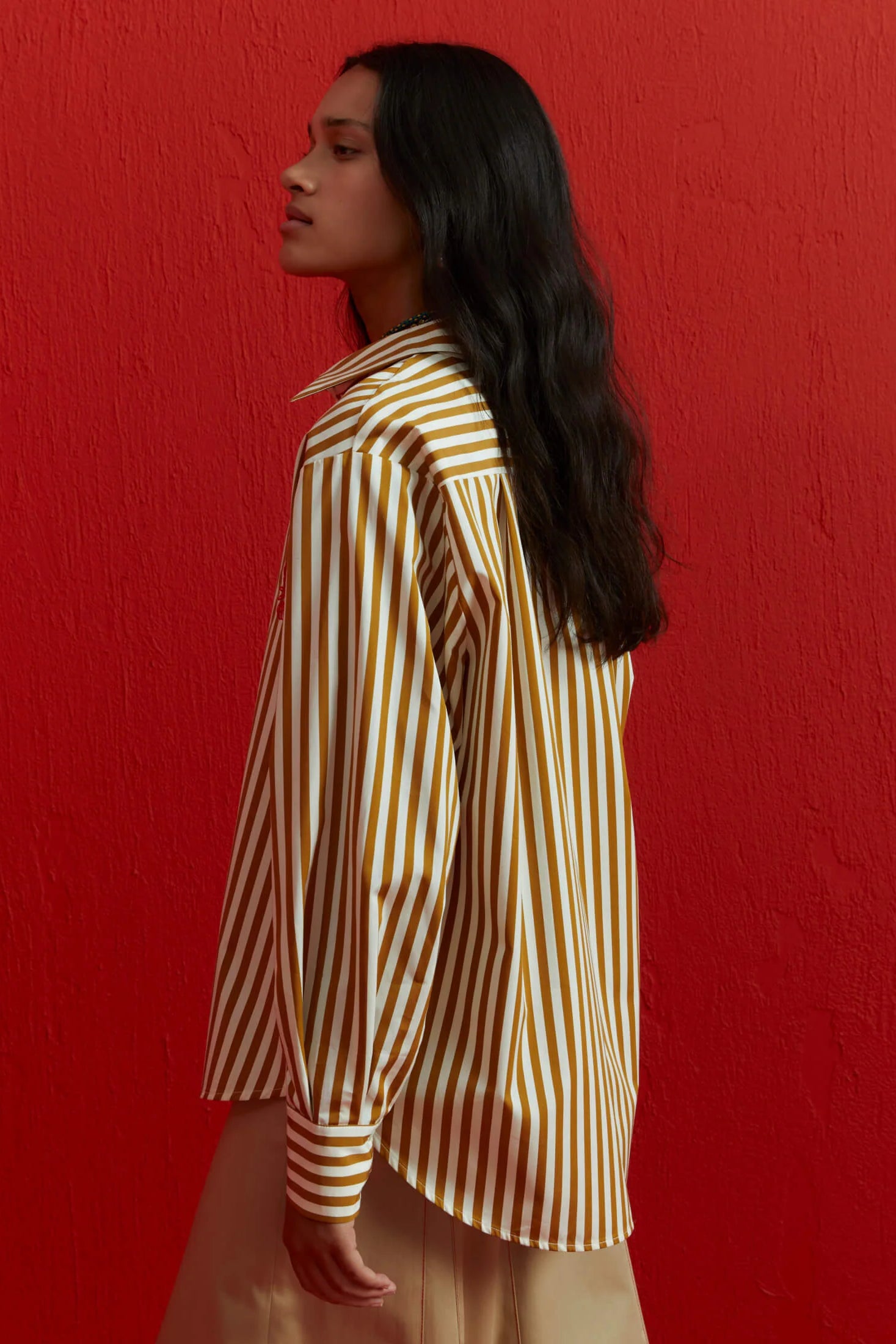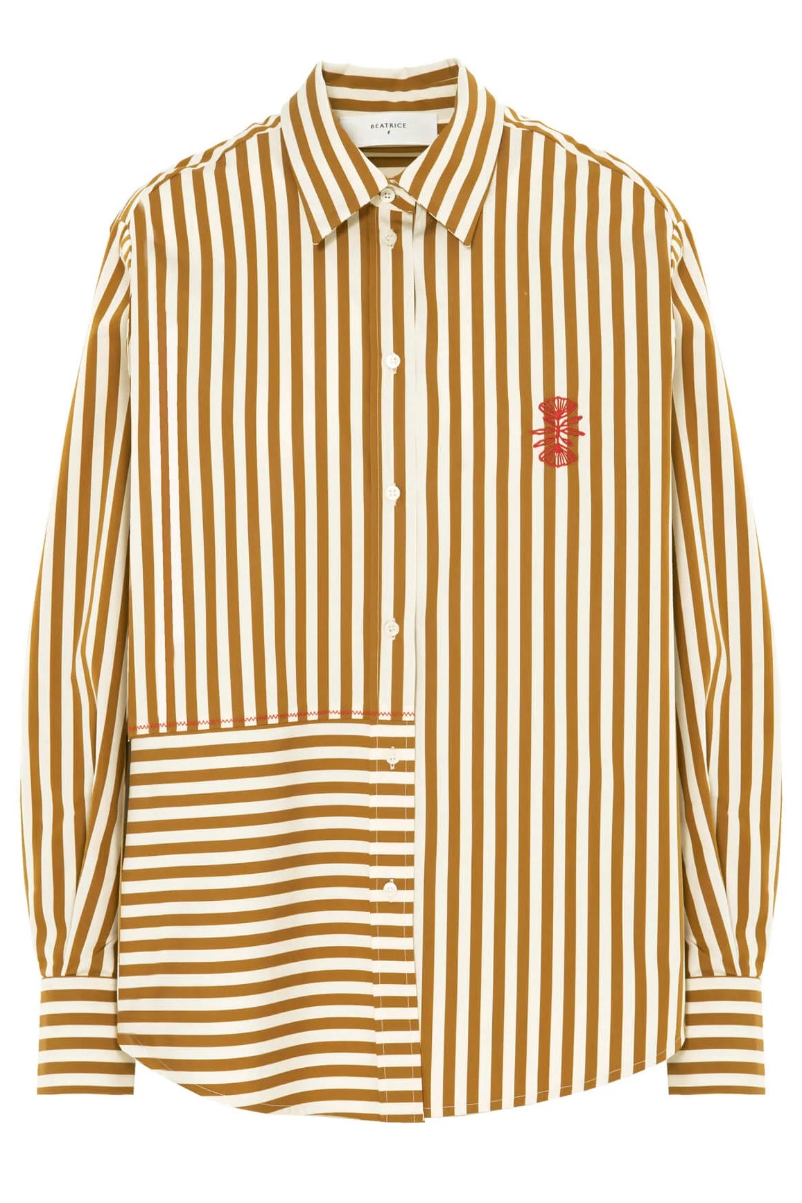 This striped poplin shirt takes the volumes of men's shirts and it becomes a feminine garment in its particularity, with the game of placements and contrasting embroidery motifs. It features a traditional collar with visible buttoning, sleeves with cuffs at the bottom. Made in Italy.