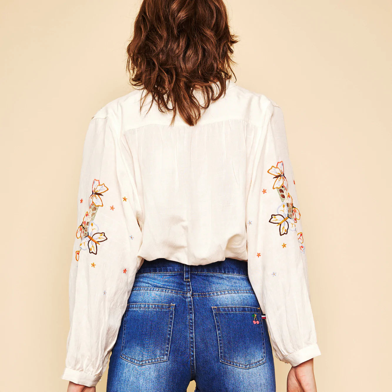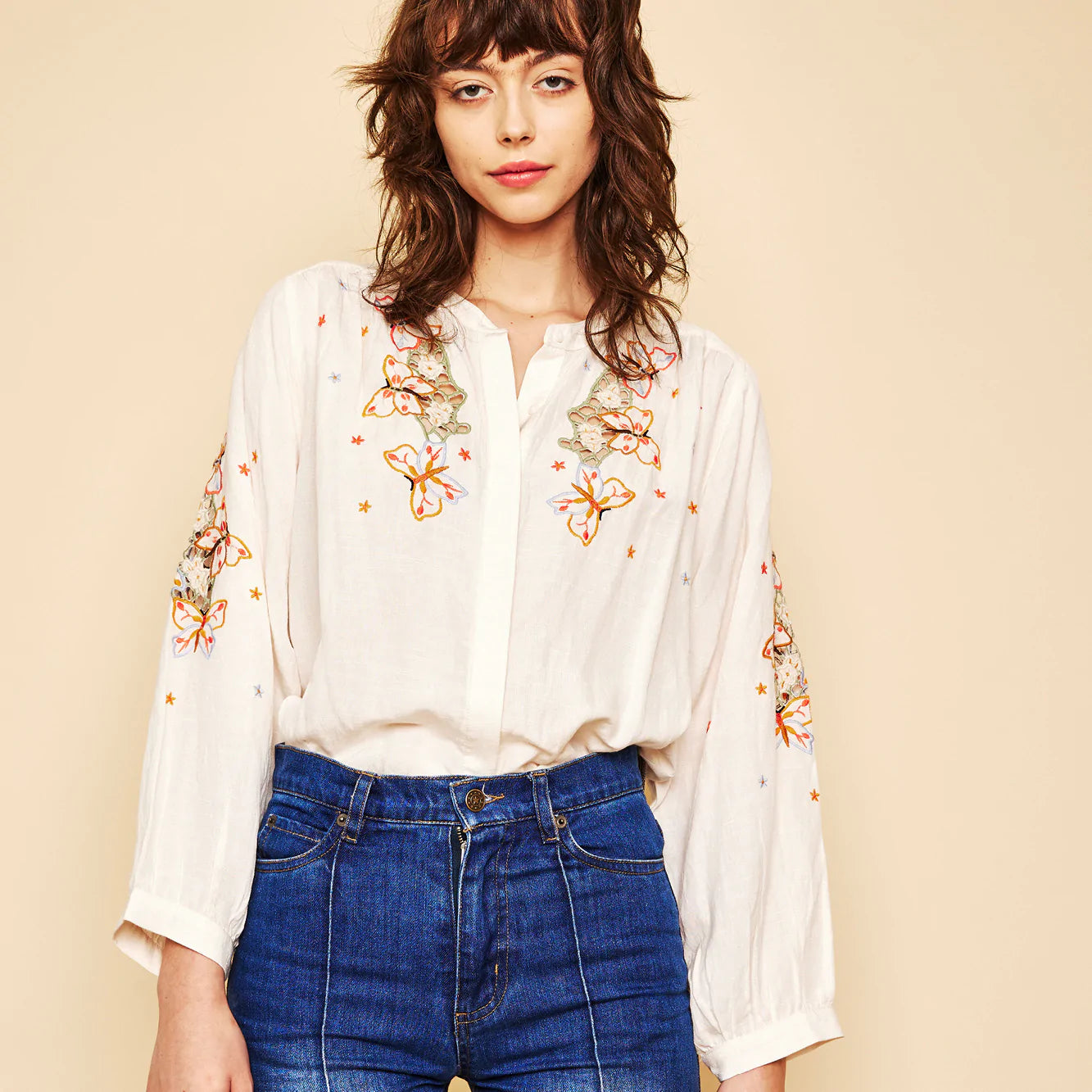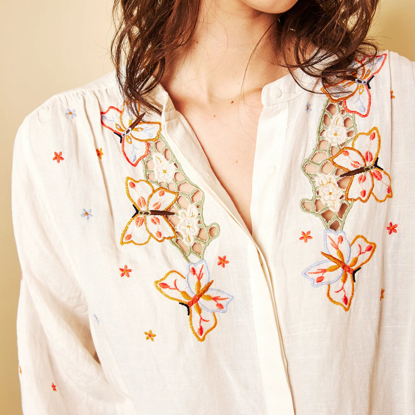 Romantic & pretty, this blouse was inspired by vintage French napery and is made with traditional Battenberg lace technique. Little butterflies swarm over a lace net and daisies are dotted all over. Gives a beautifully bohemian look top your Summer wardrobe.