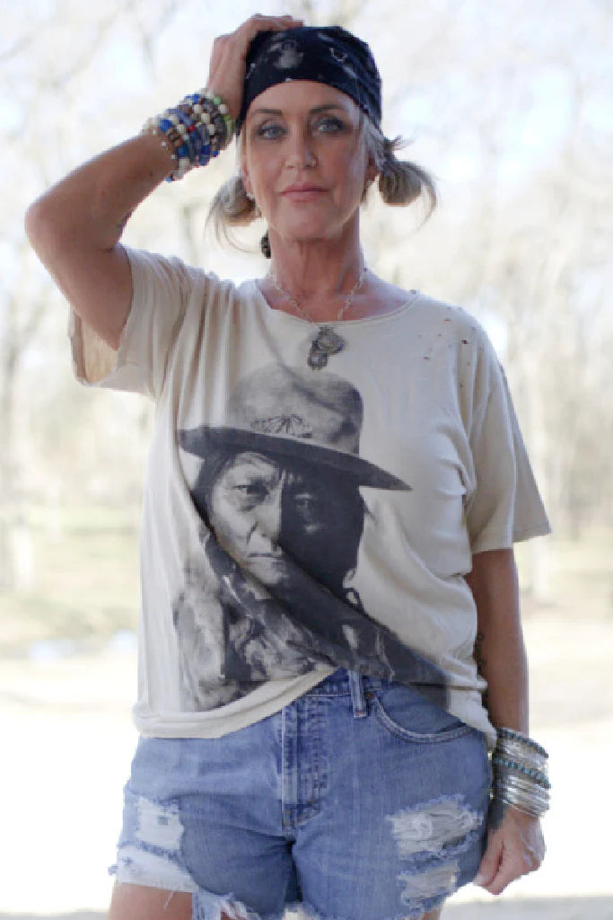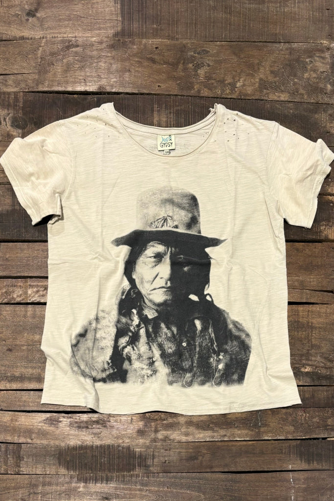 Another one of our gorgeous tees. Vintage looking distressed details around neckline. Iconic Indian Chief Imagery.