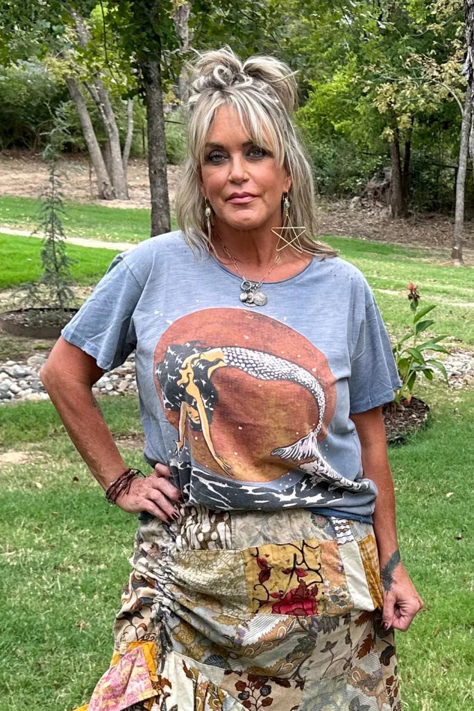 Vintage Looking Distressed Tee with gorgeous depiction of a mermaid in muted colours designed to go back with everything. Vintage looking tee with distressed neckline and edges that are an Intentional treatment and is a work of art with screen printed image in beautiful colours that blend back beautifully with the rest of the Jaded Gypsy range.