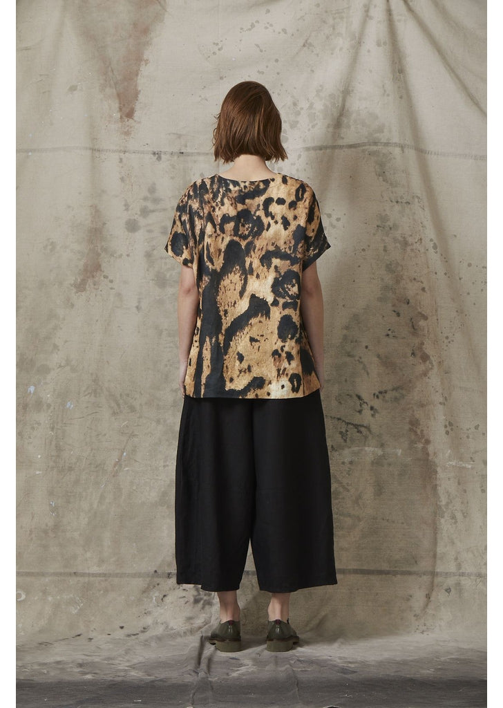 This top features a short sleeve with soft v-neck. The Print Linen Top by Valia is a stand out leopard print and looks gorgeous back with the Bell Culotte in Black as featured.
