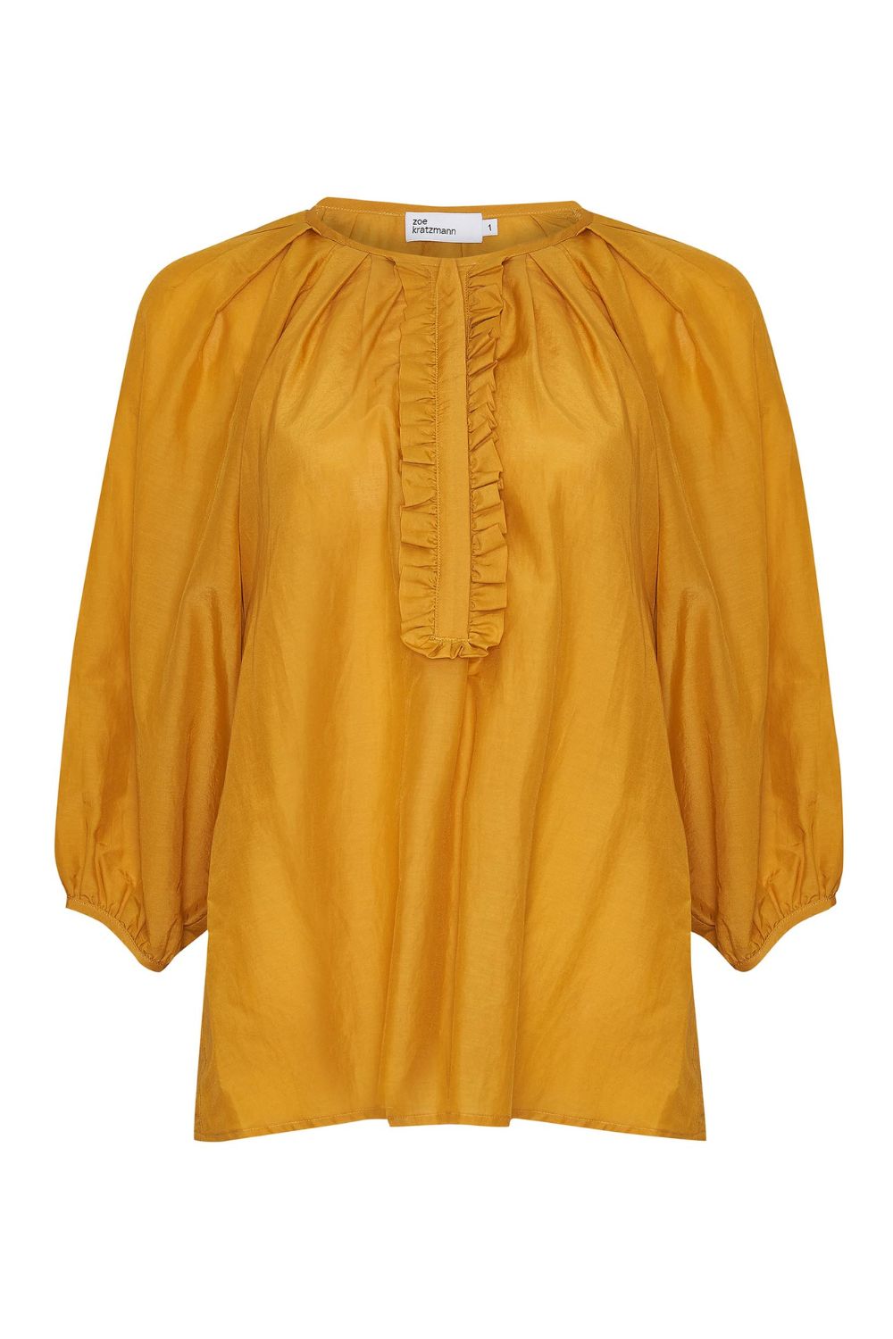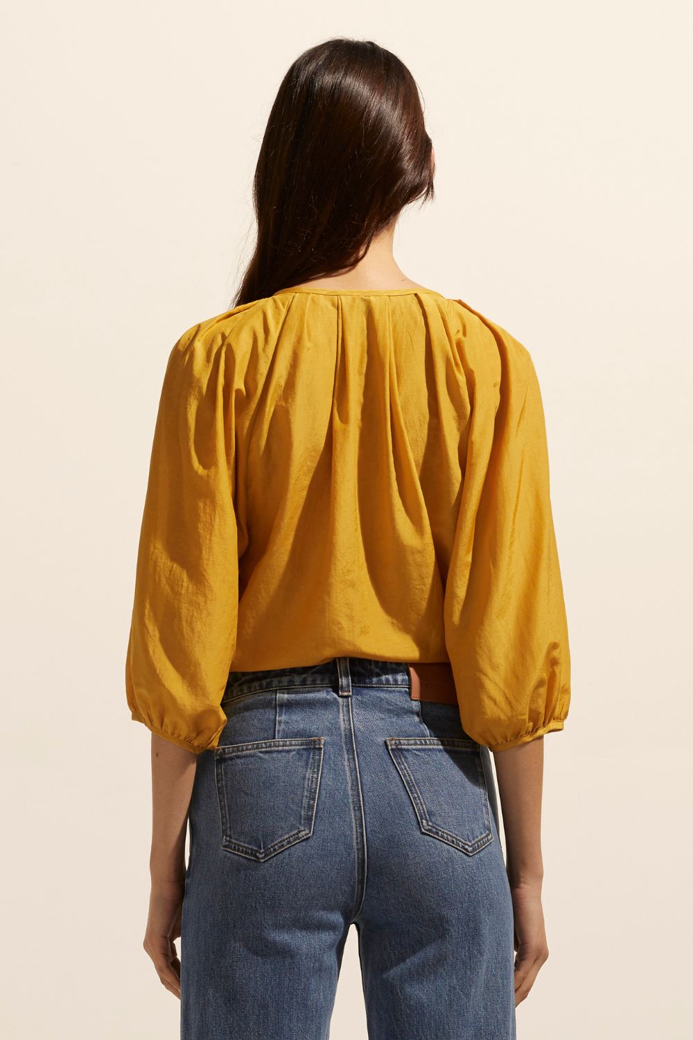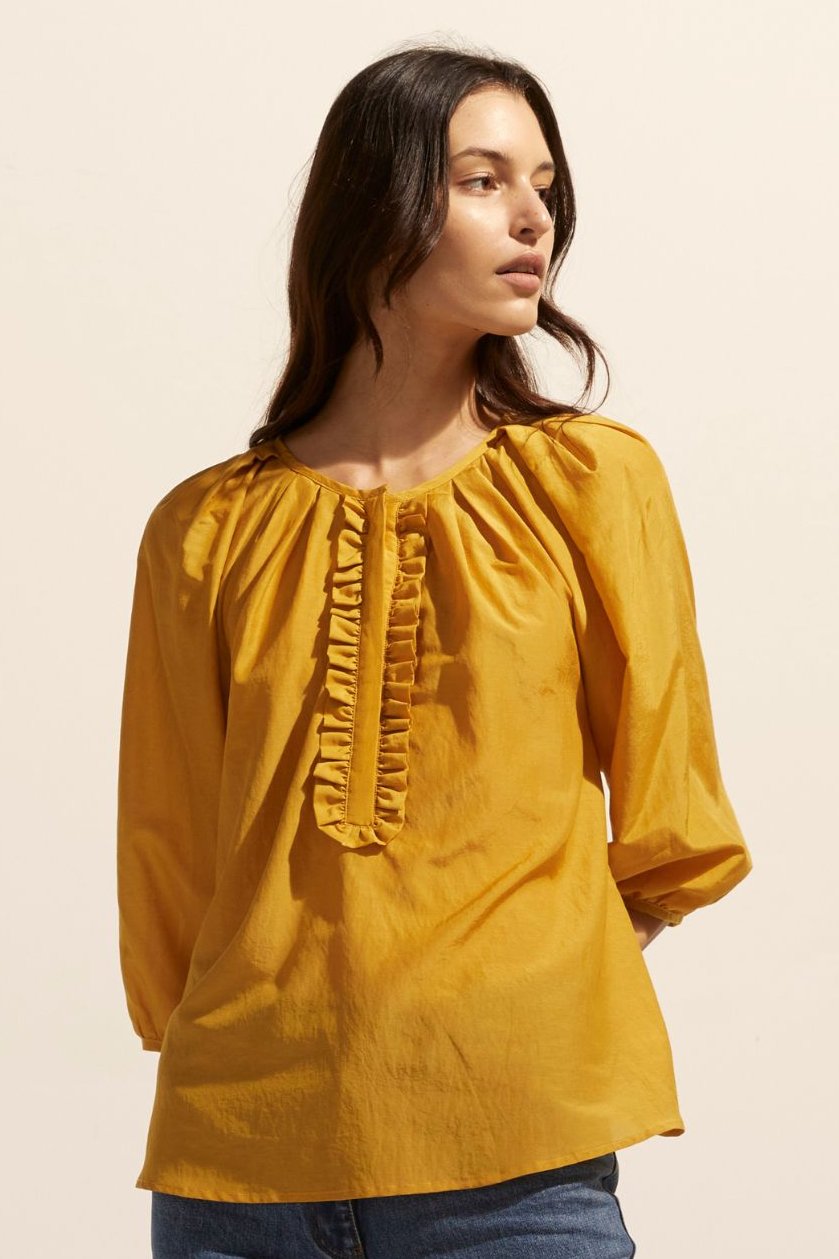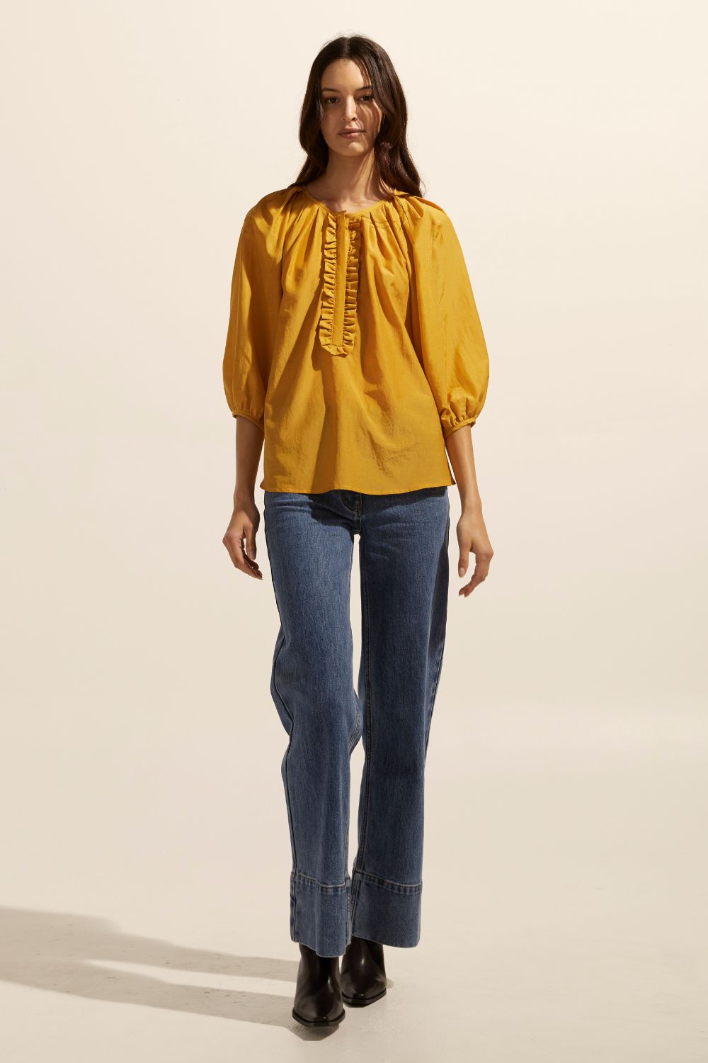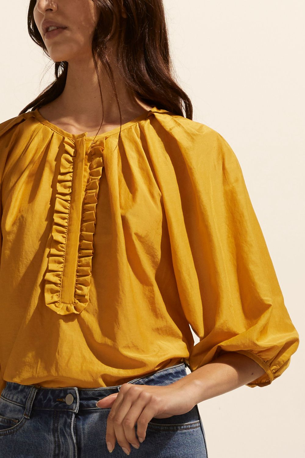 Soft gathering off the neckline creates a curved and feminine aesthetic in this piece. Neat ruffles frame the ¾ placket providing poise and polish. A three-quarter length sleeve lends volume and drama and finishes in a loose fitting gathered cuff. The gently curved hemline provides a harmonious balance in volume. A three-quarter length sleeve lends volume and drama and finishes in a loose-fitting gathered cuff. the gently curved hemline provides a harmonious balance in volume.