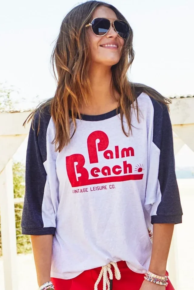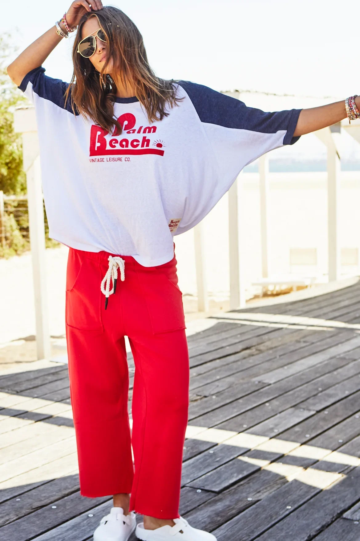 Wide and slouchy drop sleeve raglan tee with white body with navy sleeves. Featuring our new Palm Beach print in red on the front. This tee looks great worn back with our new white distressed carpenter jeans, carpenter shorts and carpenter skirt.