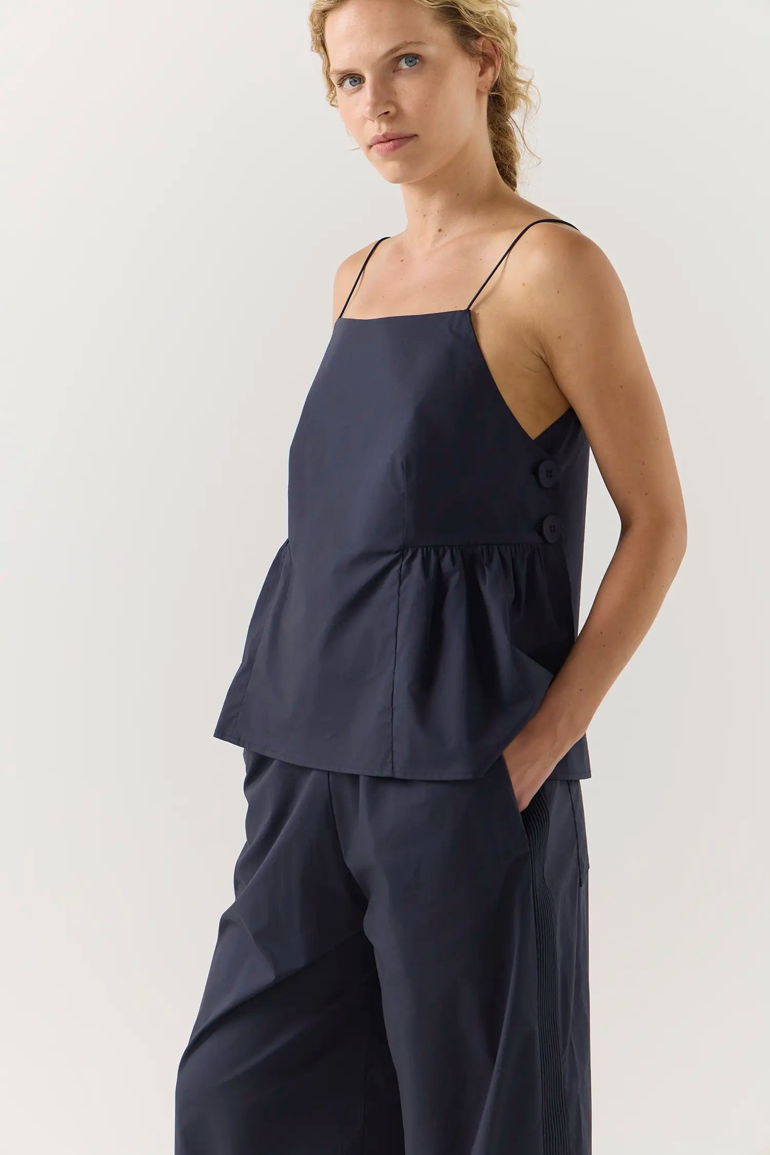 The River Top speaks to Foemina’s appreciation for architectural silhouettes and thoughtful detail. Featuring a clean square neckline and slender elastic shoulder straps, it is defined by gentle gathers at the waist and oversized buttons that punctuate the side seam. A modern essential that invites easy layering and considered styling.