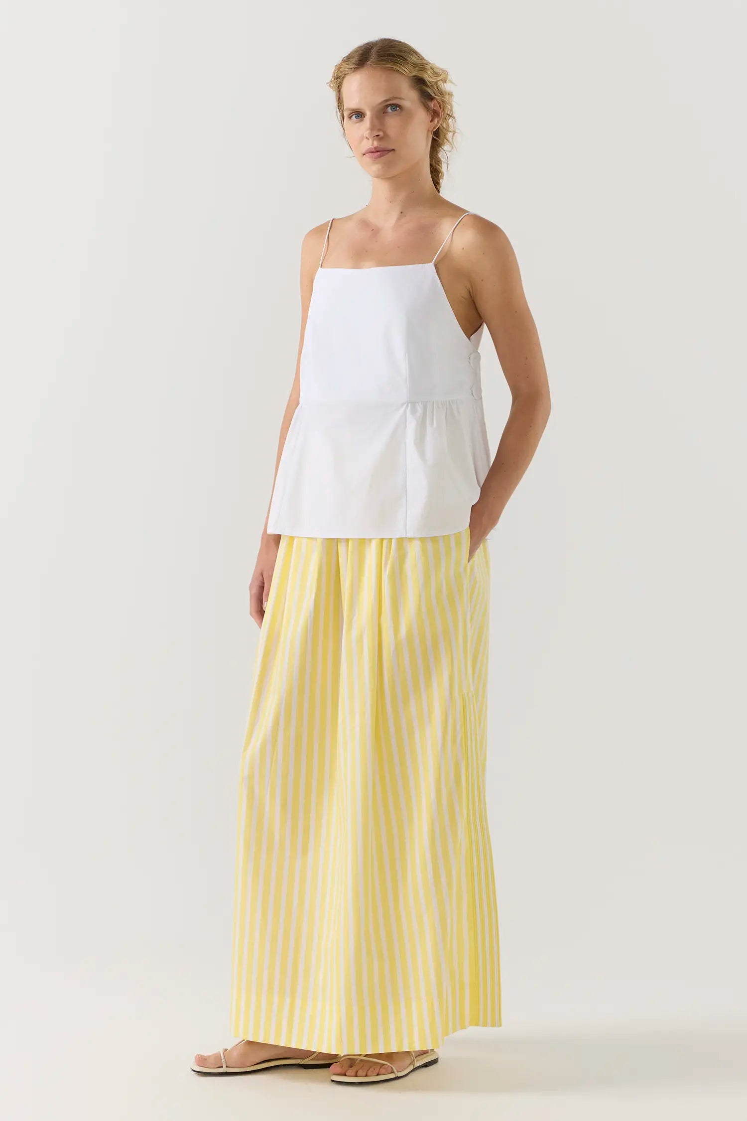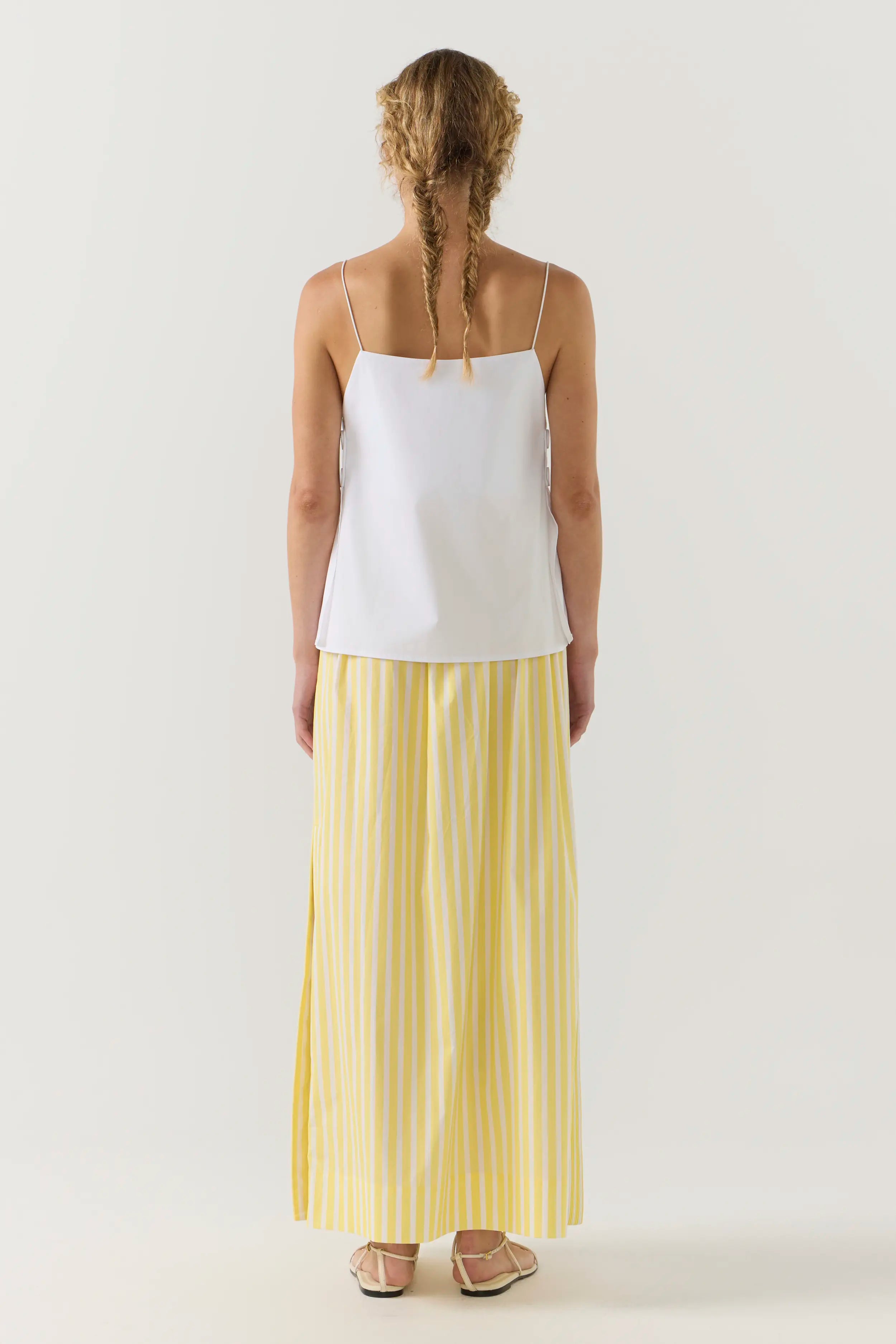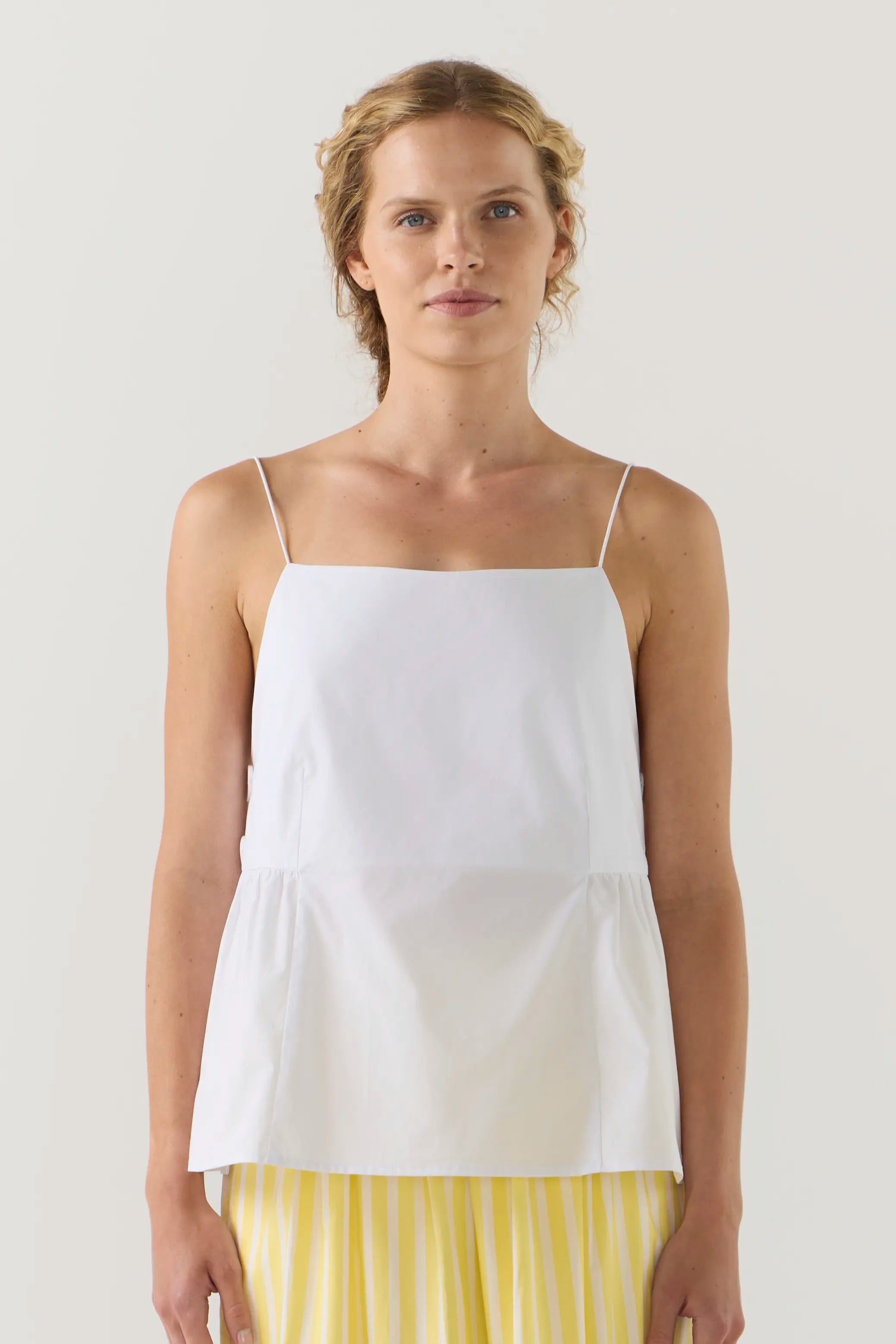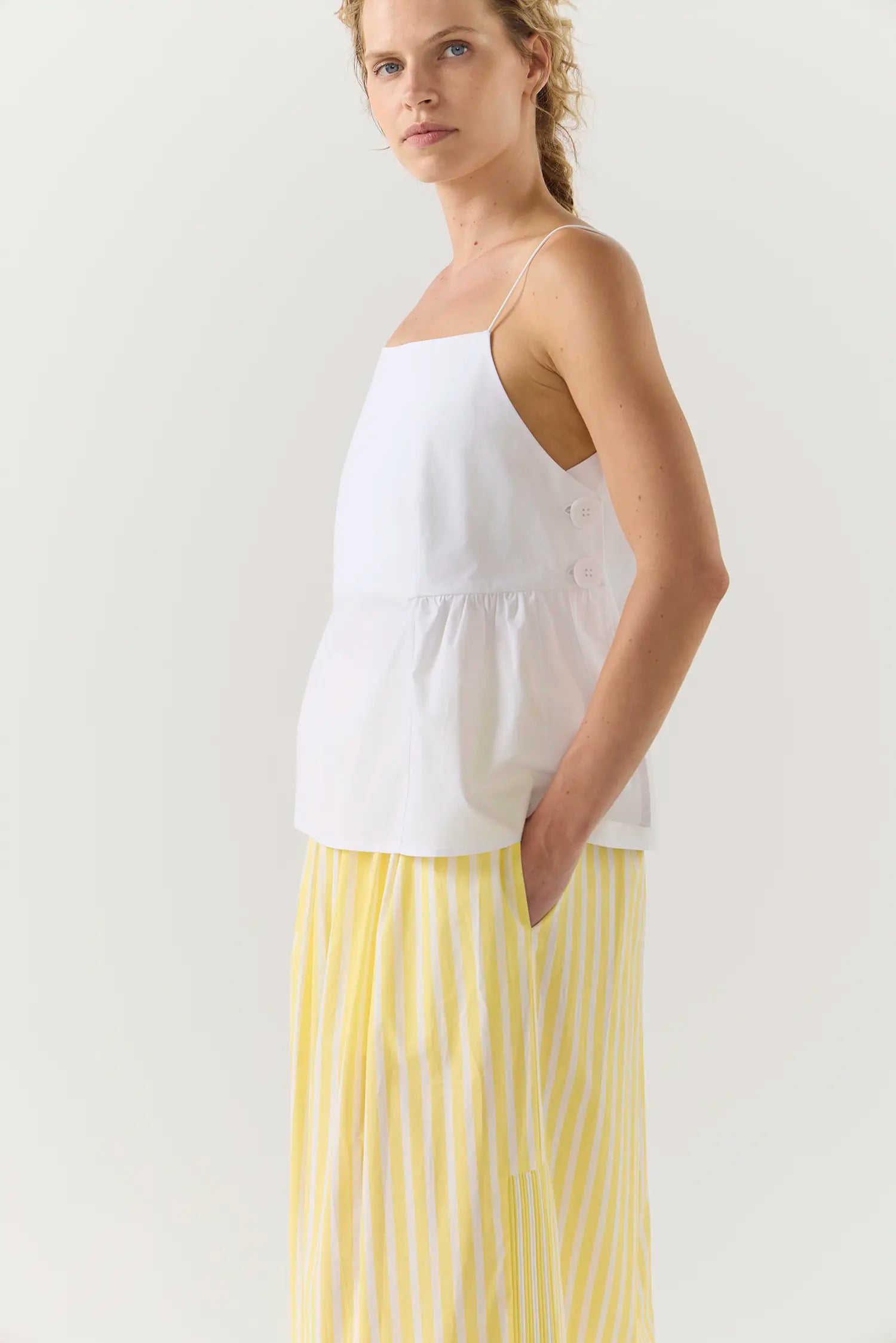 The River Top speaks to Foemina’s appreciation for architectural silhouettes and thoughtful detail. Featuring a clean square neckline and slender elastic shoulder straps, it is defined by gentle gathers at the waist and oversized buttons that punctuate the side seam. A modern essential that invites easy layering and considered styling.