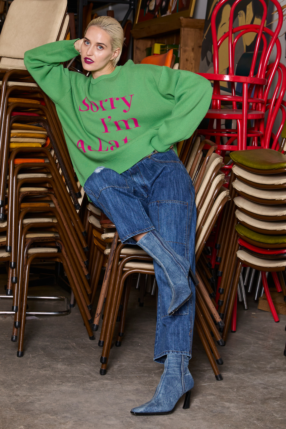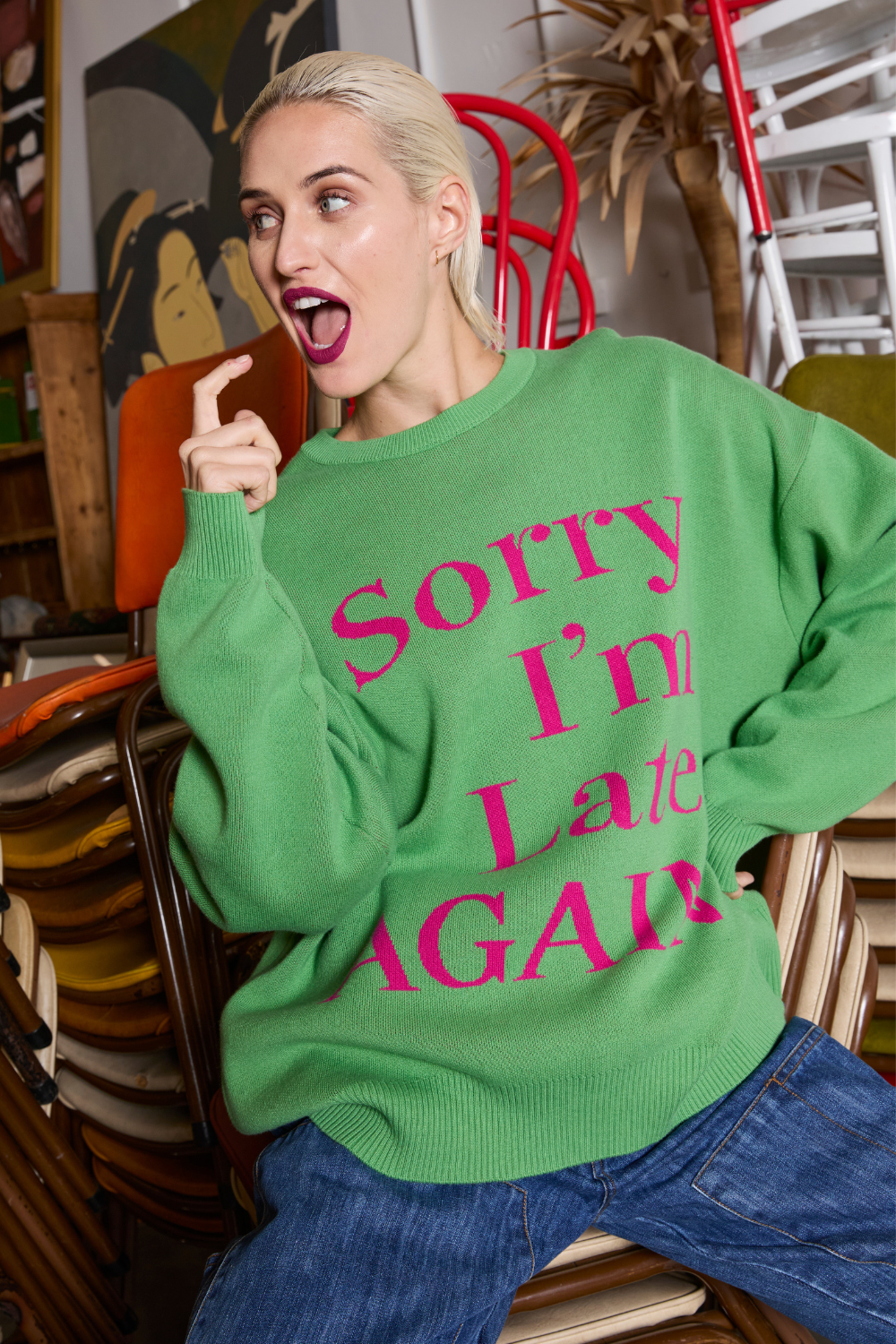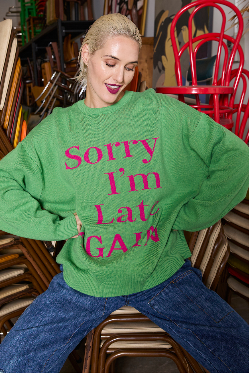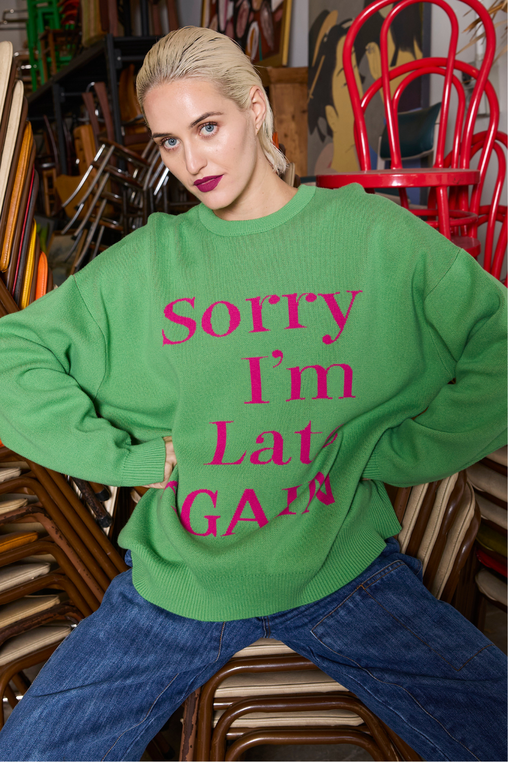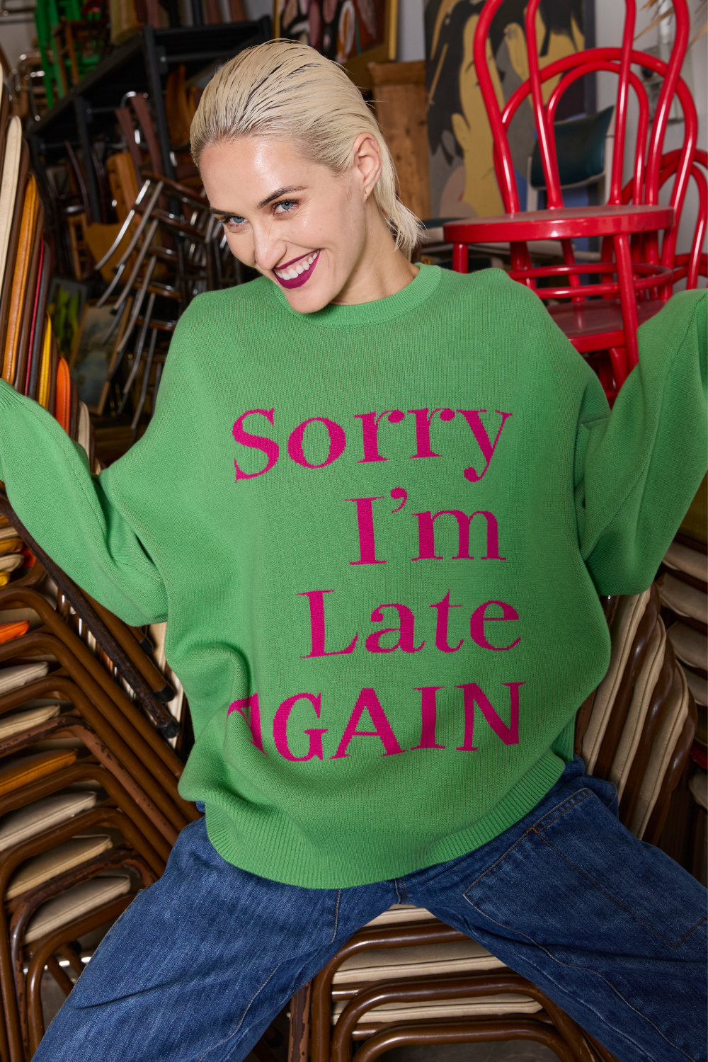 Back by popular demand, the Sorry Knit by M.A.Dainty returns this season in a bold new colourway: vibrant green with magenta text that reads "Sorry I'm Late AGAIN". Crafted from 100% cotton, this oversized knit is as comfortable as it is fun - a statement piece that adds personality to any winter wardrobe. With a relaxed fit, classic crew neckline, and ribbed edges, it’s perfect for throwing on with denim and boots for an effortlessly cool, casual look.