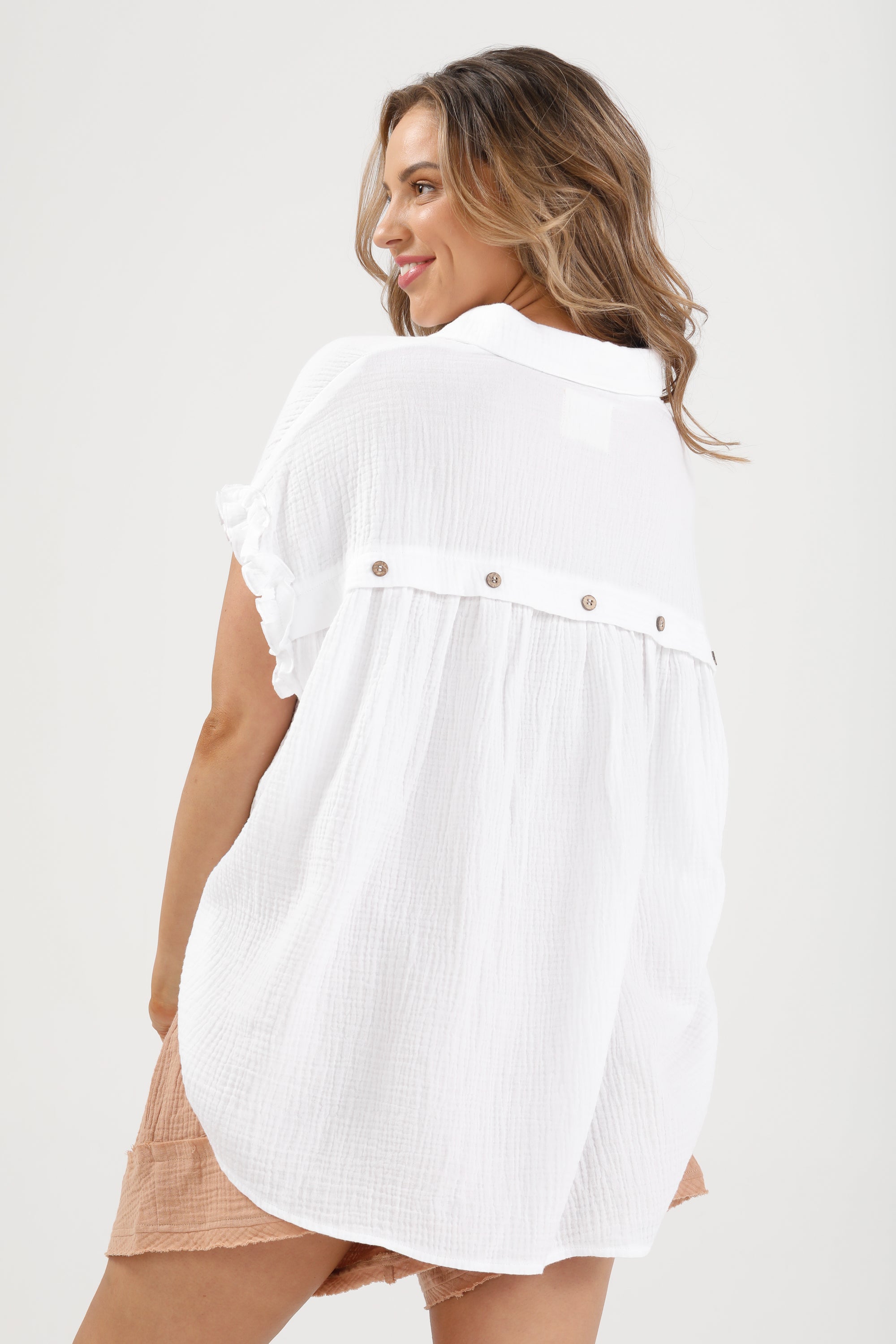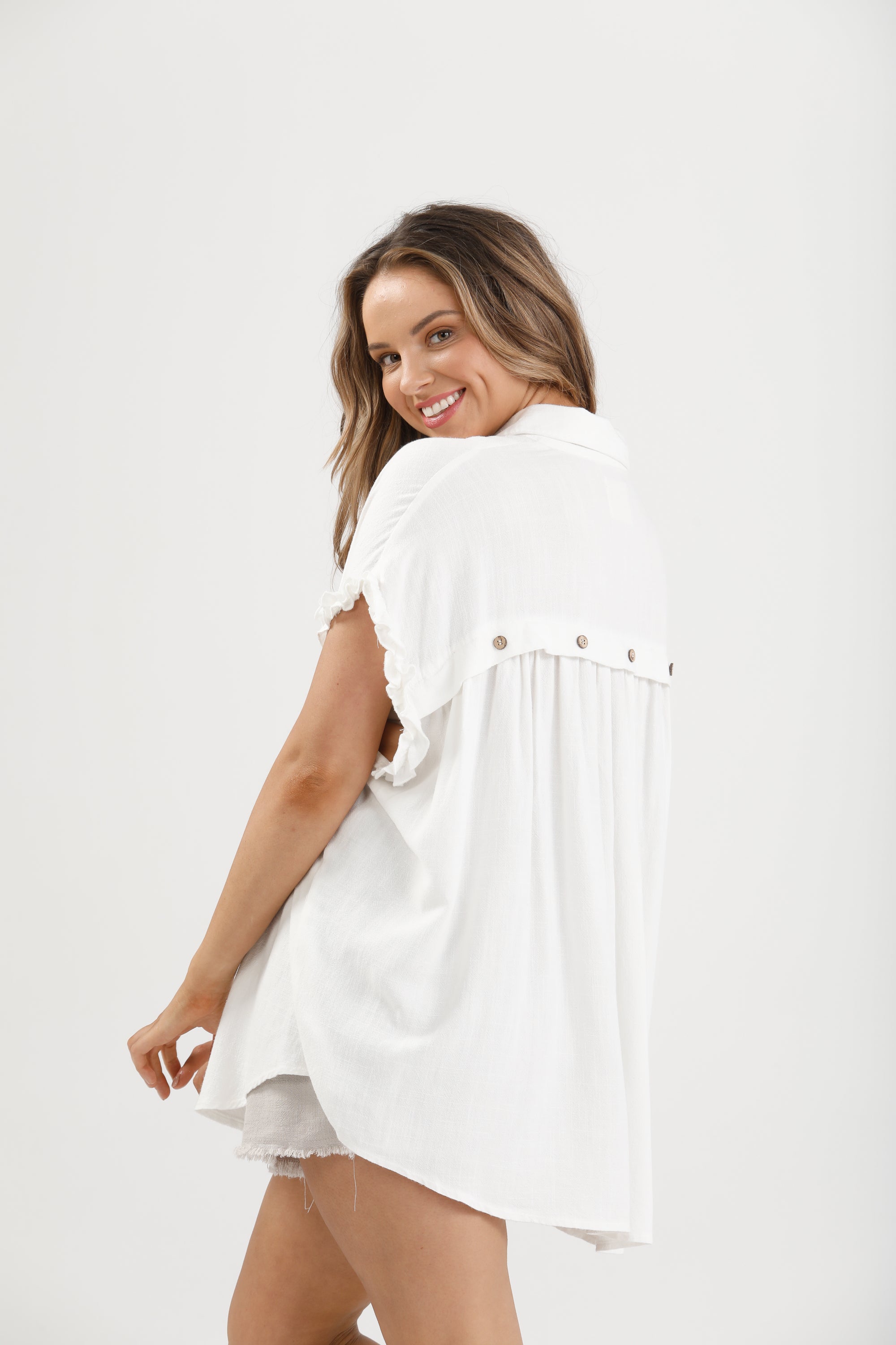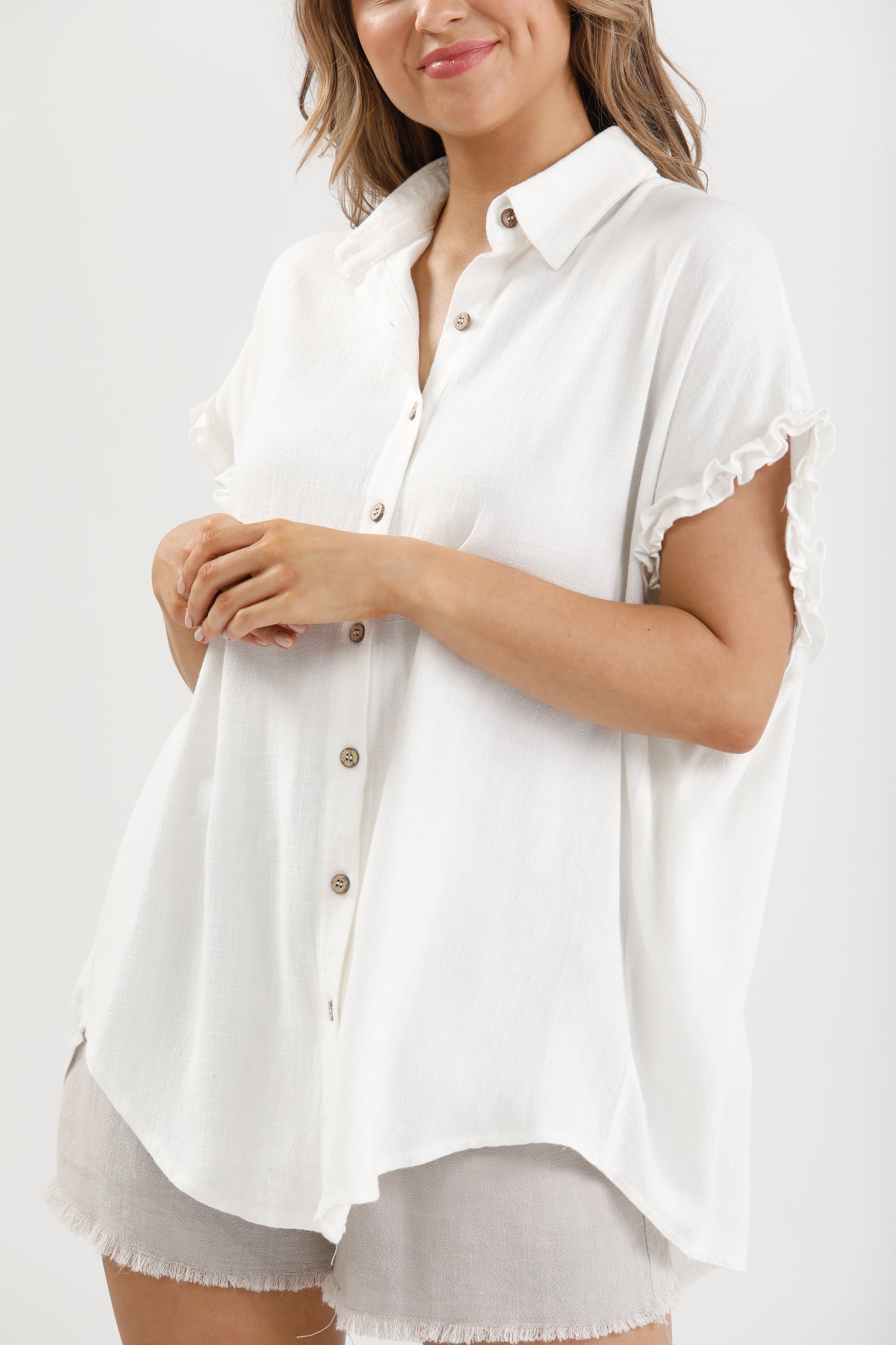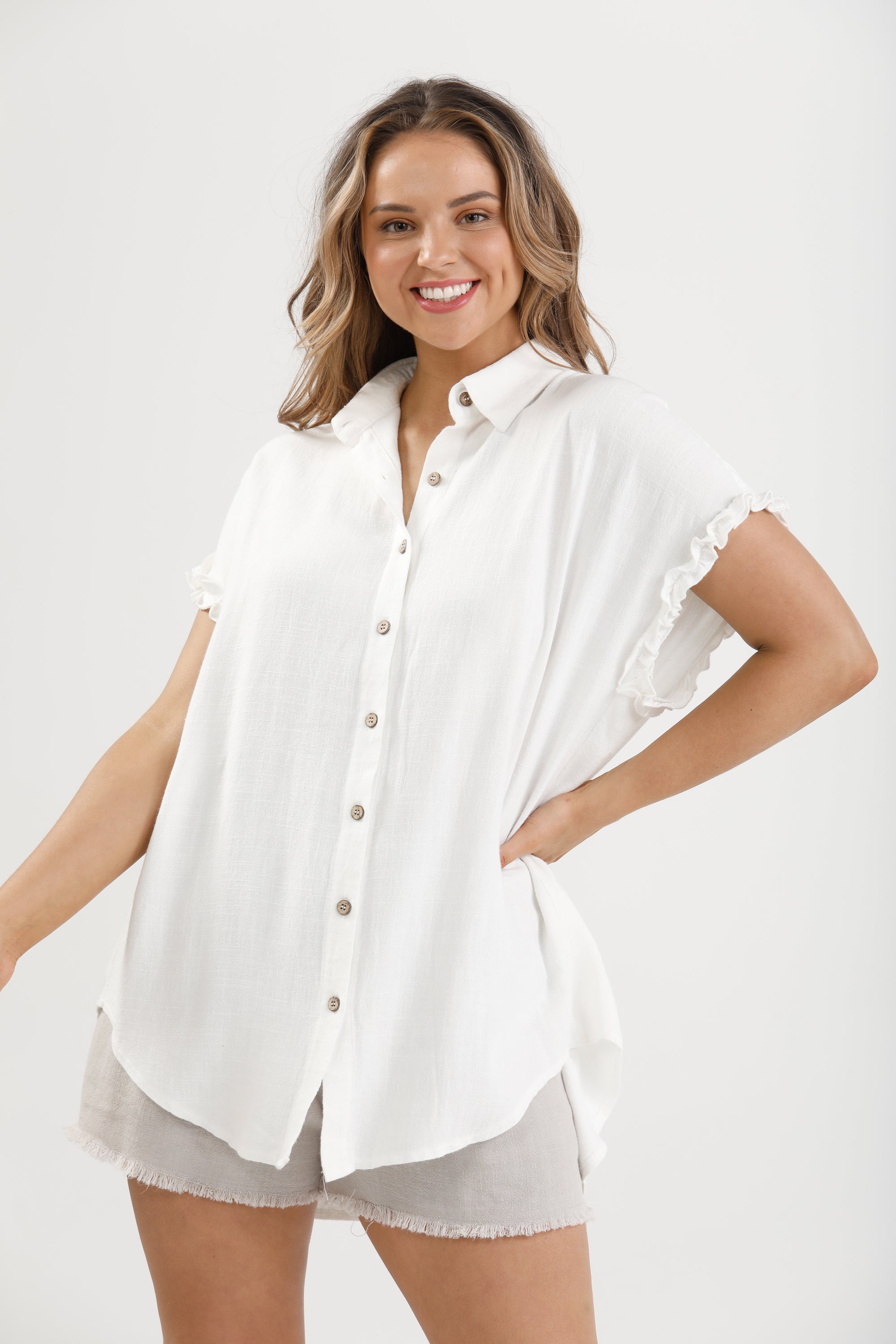 A playful take on the classic button-down, the Sunshine Shirt is a sweet summer staple featuring a flirty ruffle sleeve detail and relaxed collared fit.