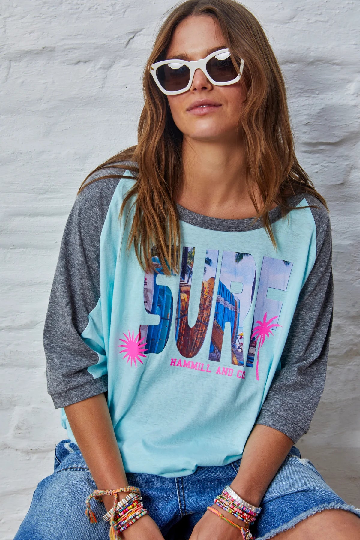 This cool tee is featured in our new oversized, slouchy fit with dropped batwing sleeves. Wide and slouchy drop sleeve tee in blue marle body with char batwing sleeves. Featuring our new Surf print.