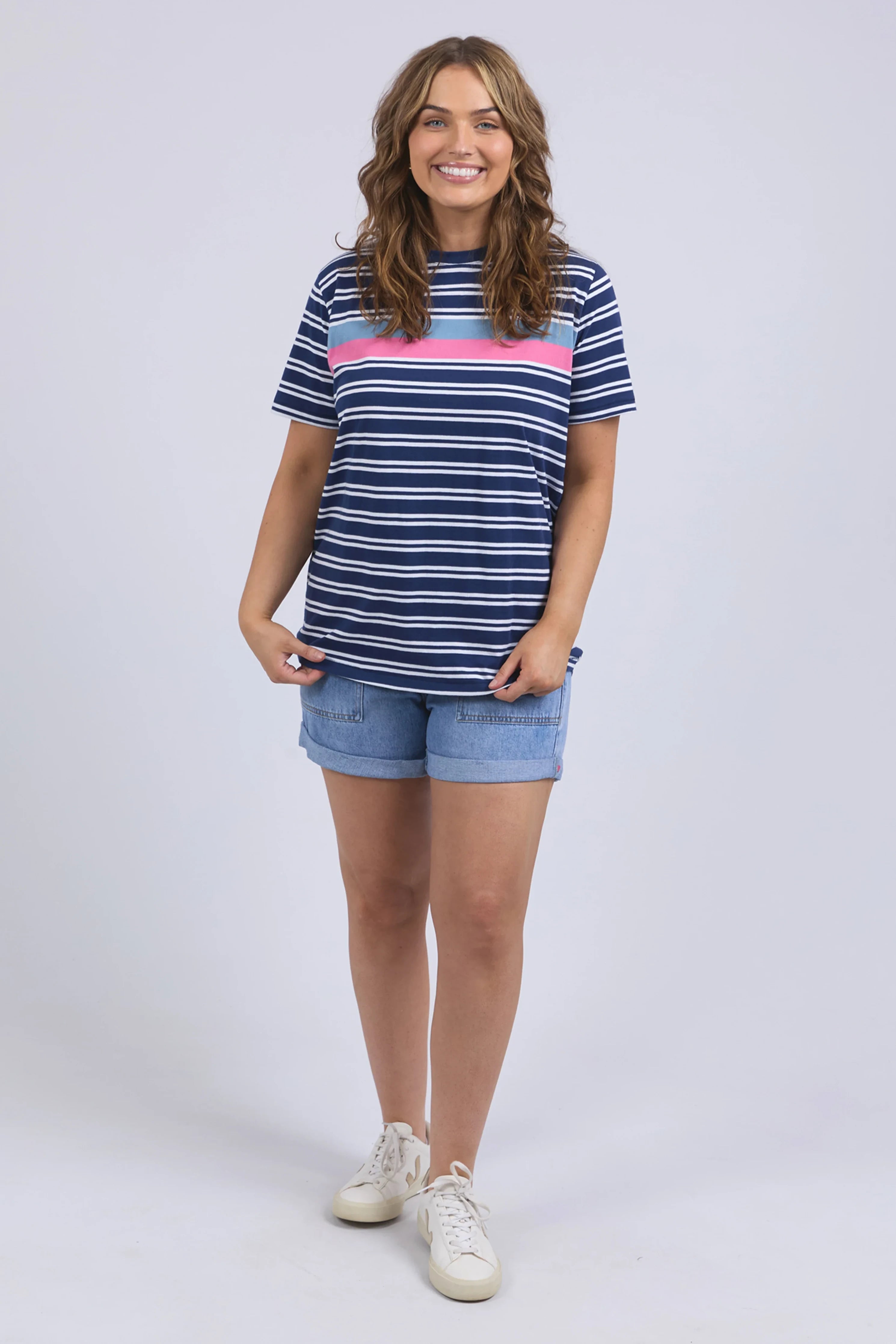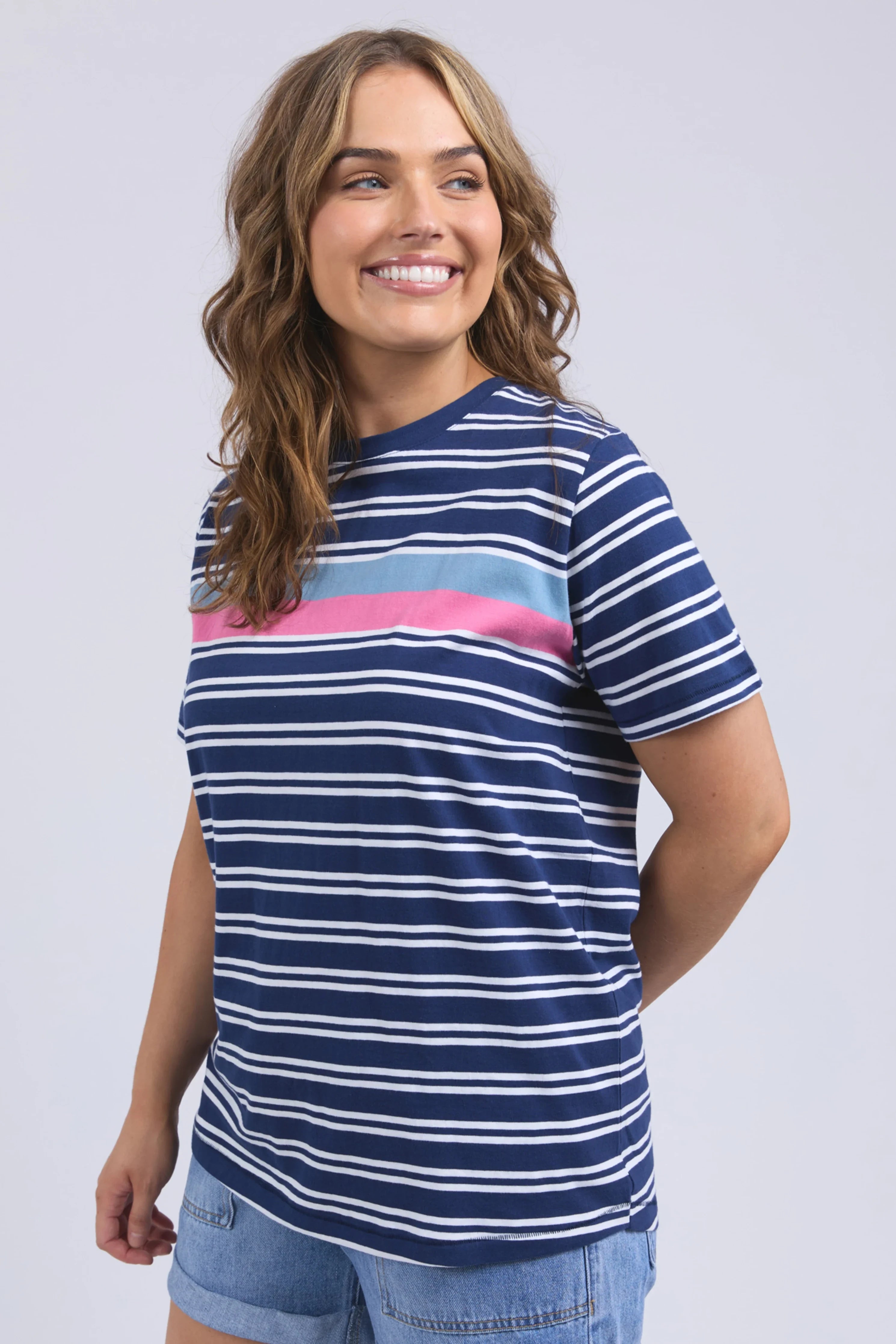 Quintessential Elm Tee featuring colourful stripes in all the hues of the season.