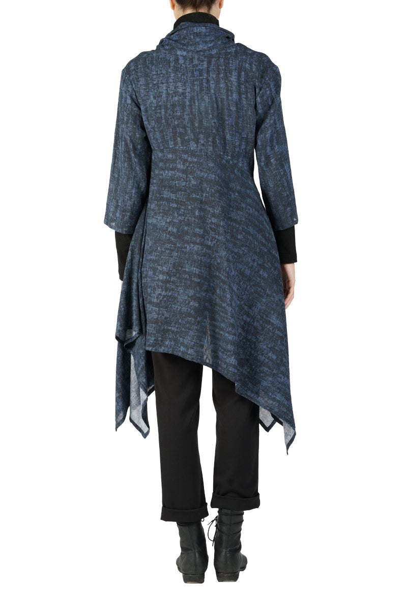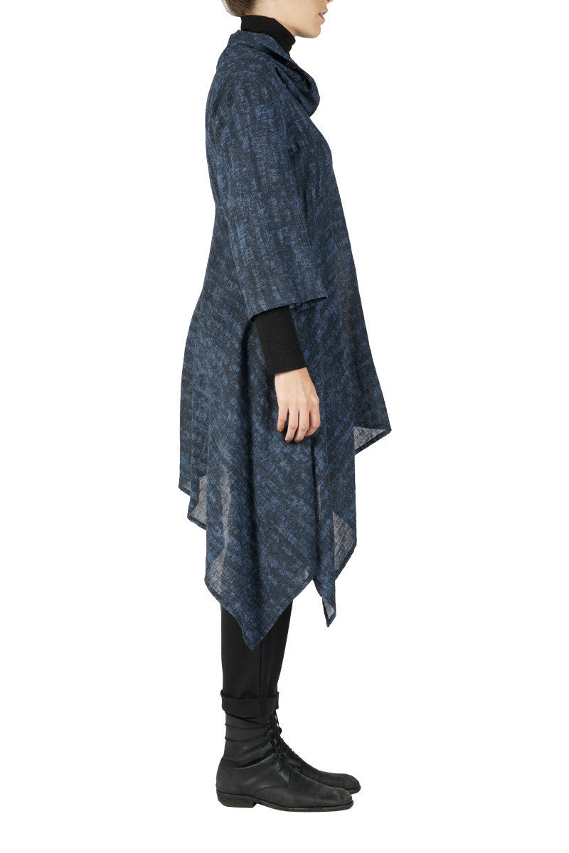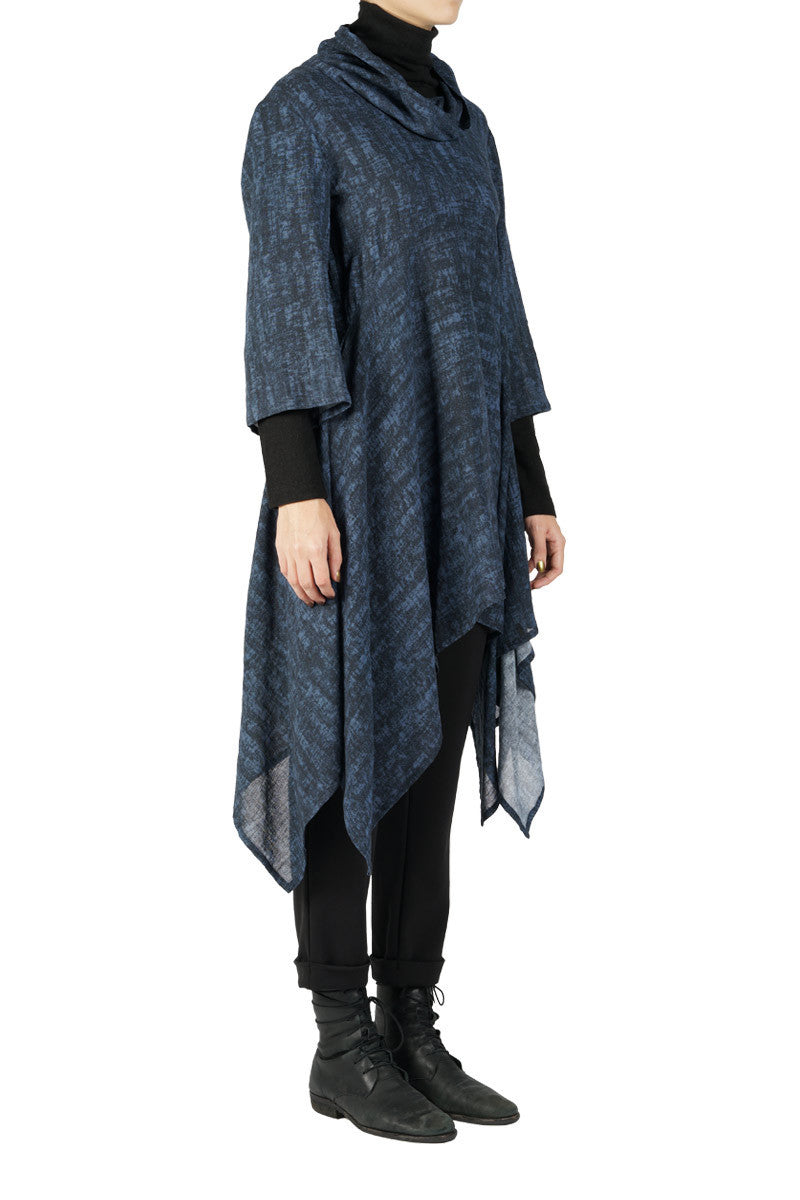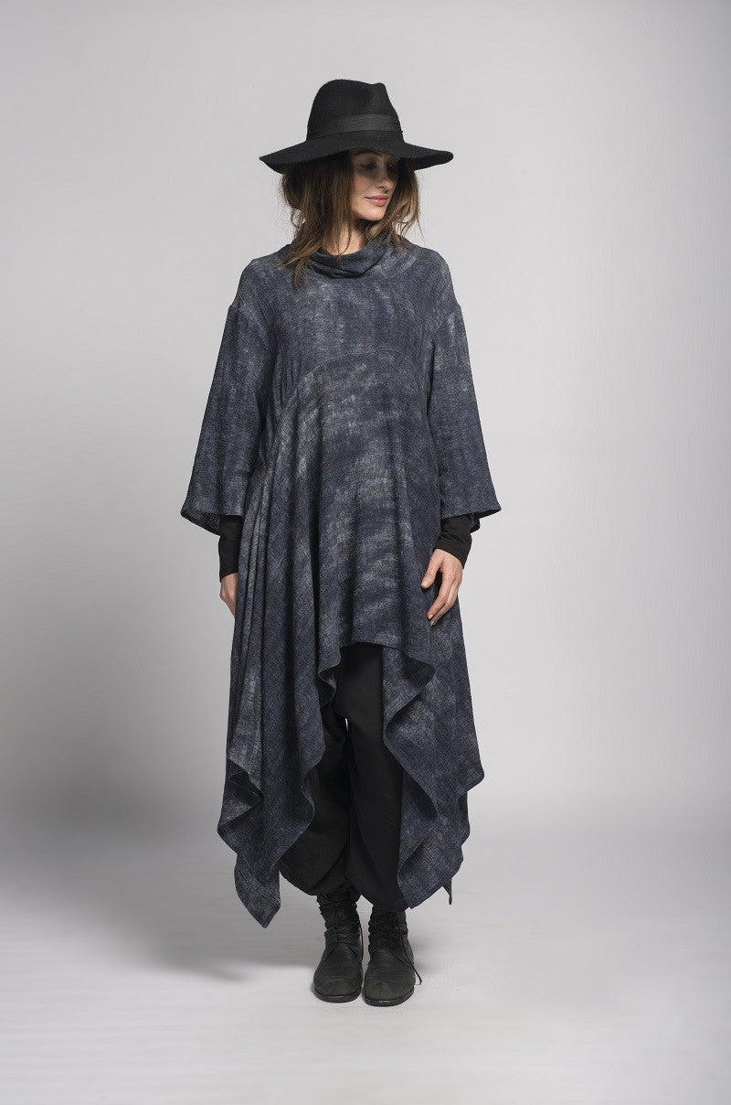 Tarvos Tunic is a high neck tunic with wide sleeves that finish above the wrist. The hem at the front starts mid thigh and falls to the ankle in folds of fabric.