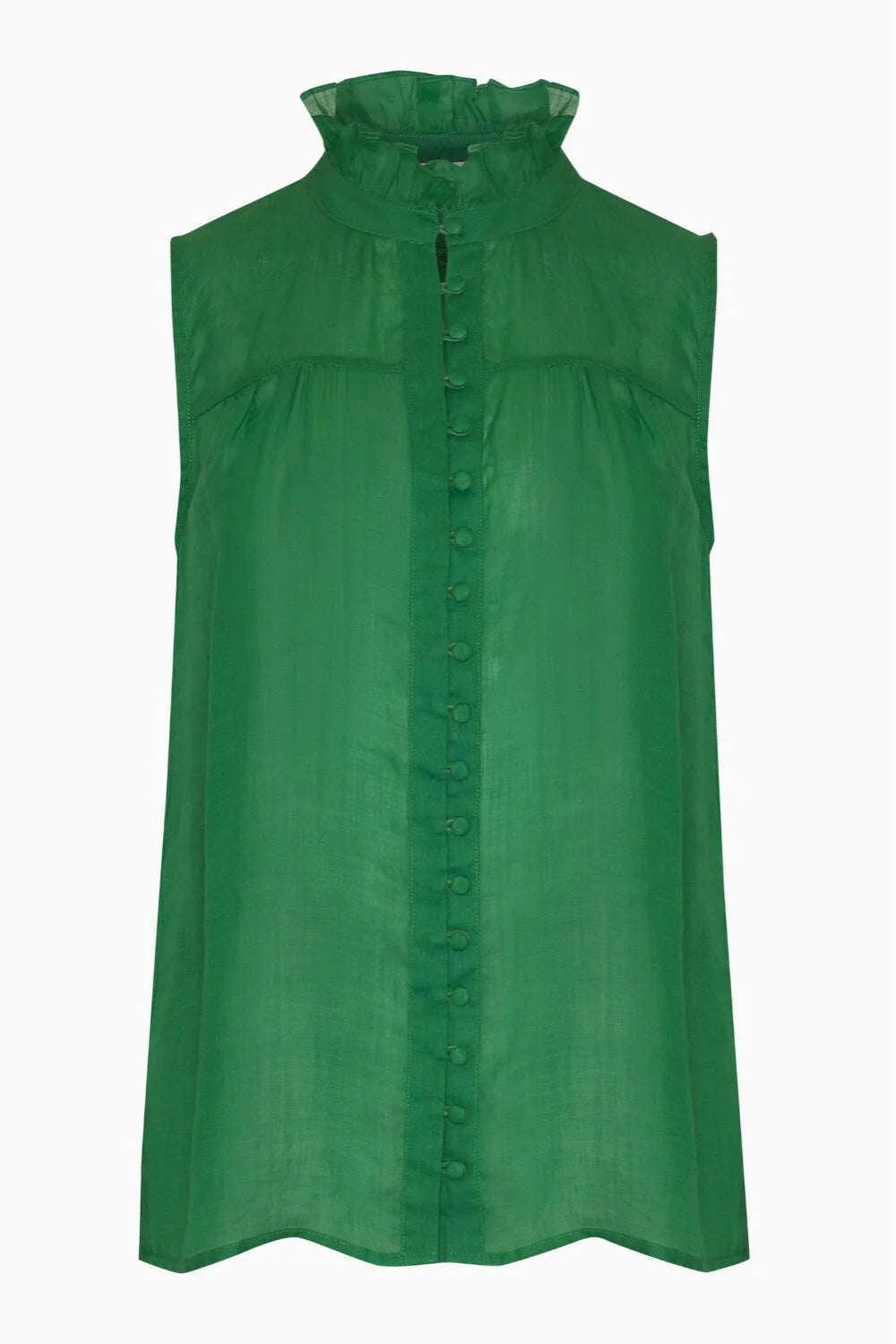 - A ruffled neckline is balanced by a sleeveless silhouette for fresh summer style