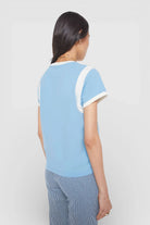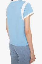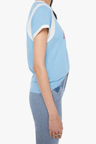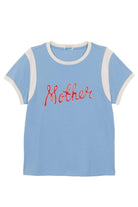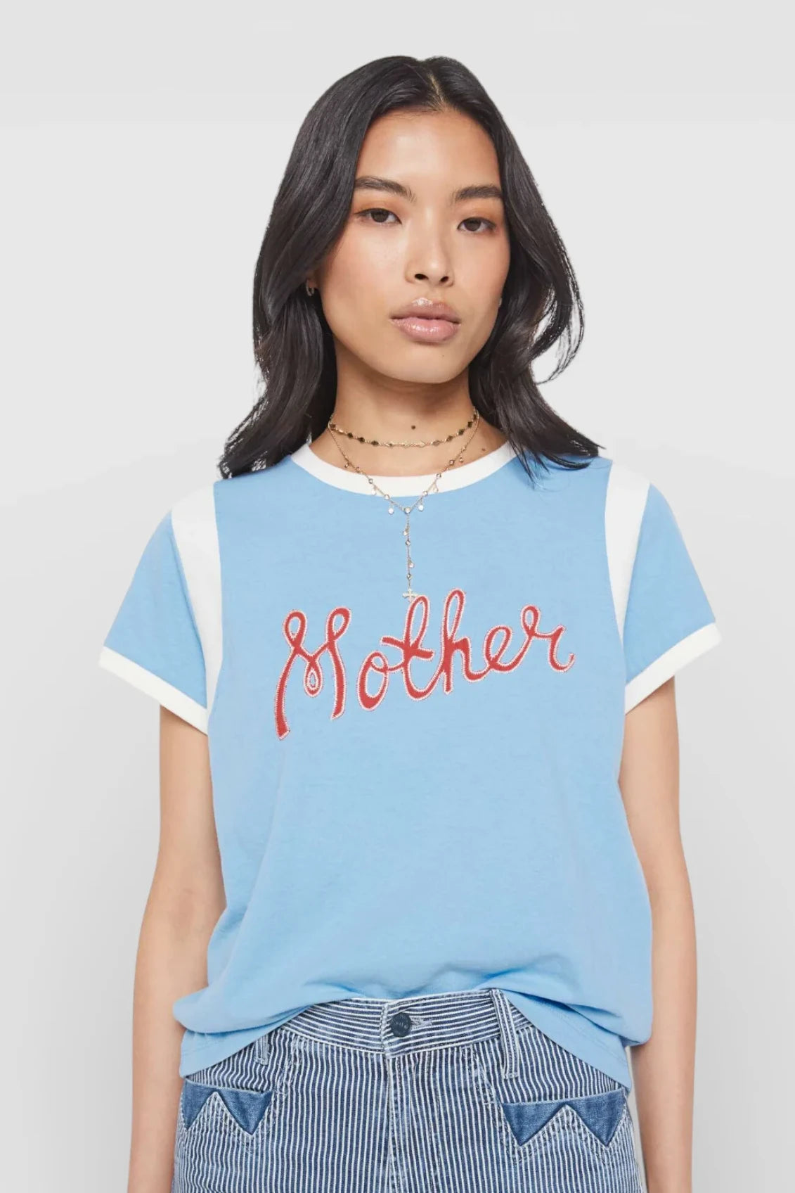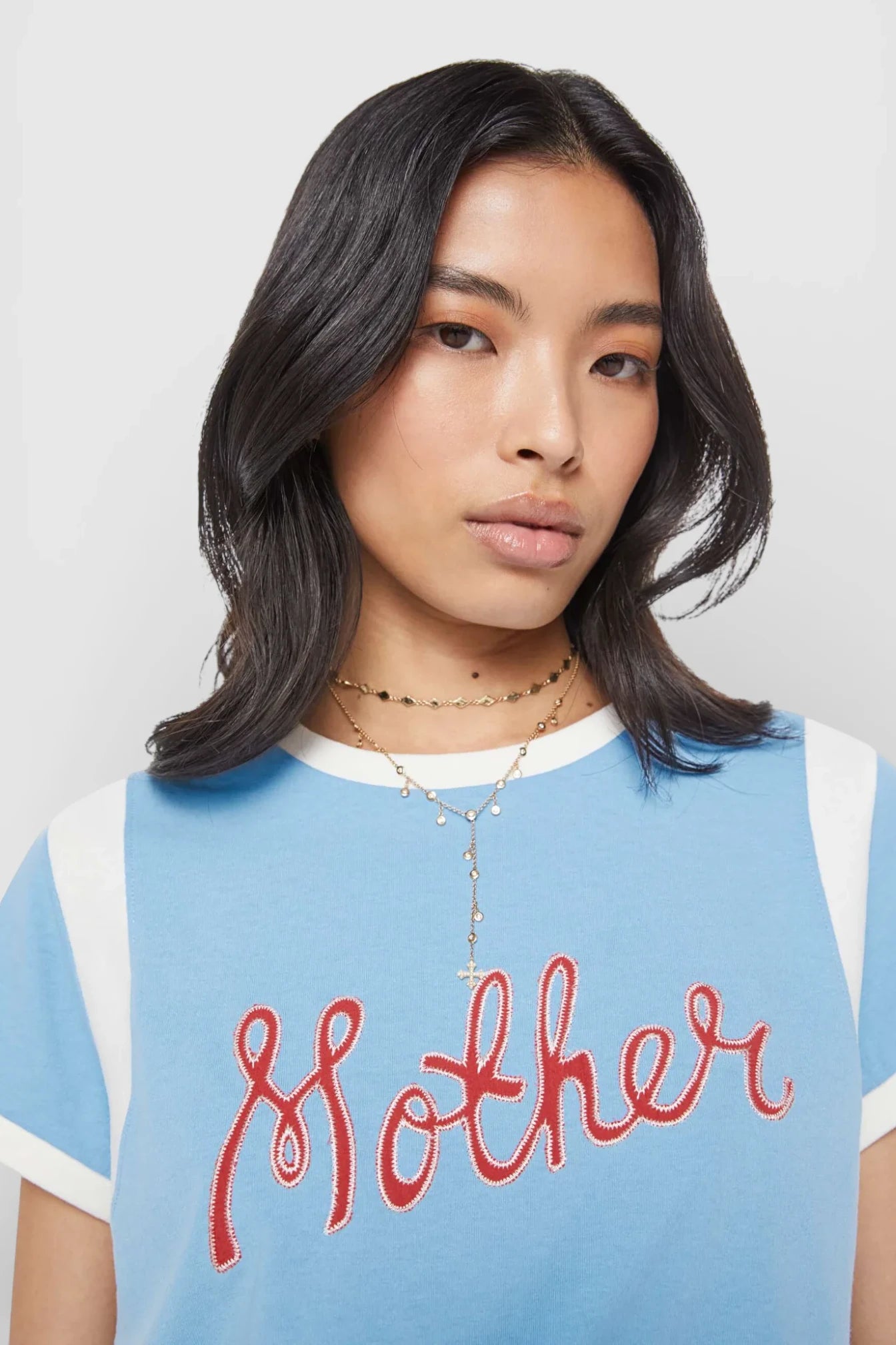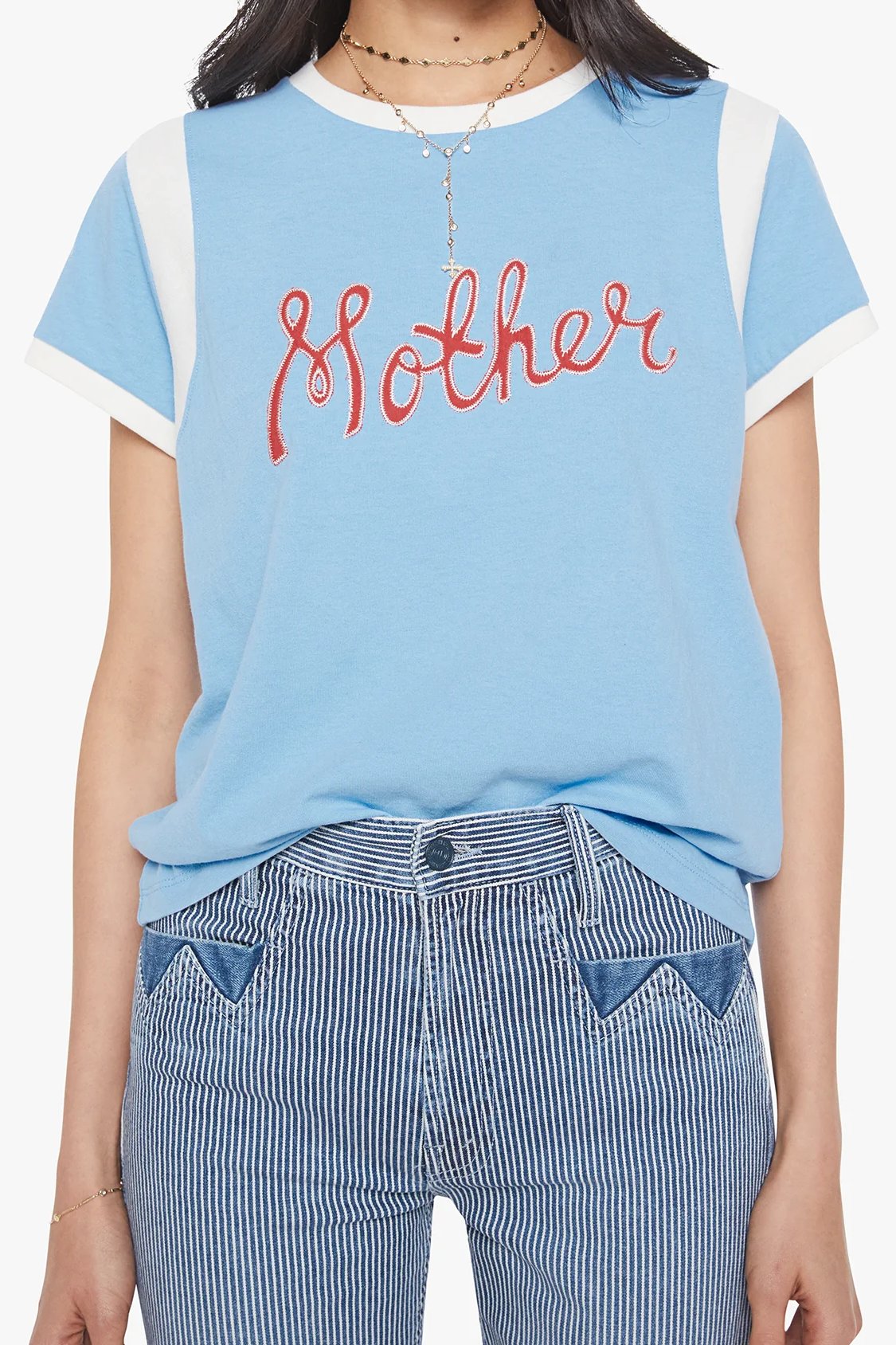 Write on. A crewneck tee with extra-short sleeves, inset details at the shoulders and a loose, boxy fit. Made from 100% cotton in baby blue with white trim, the tee features MOTHER's name in red cursive patched on the front.