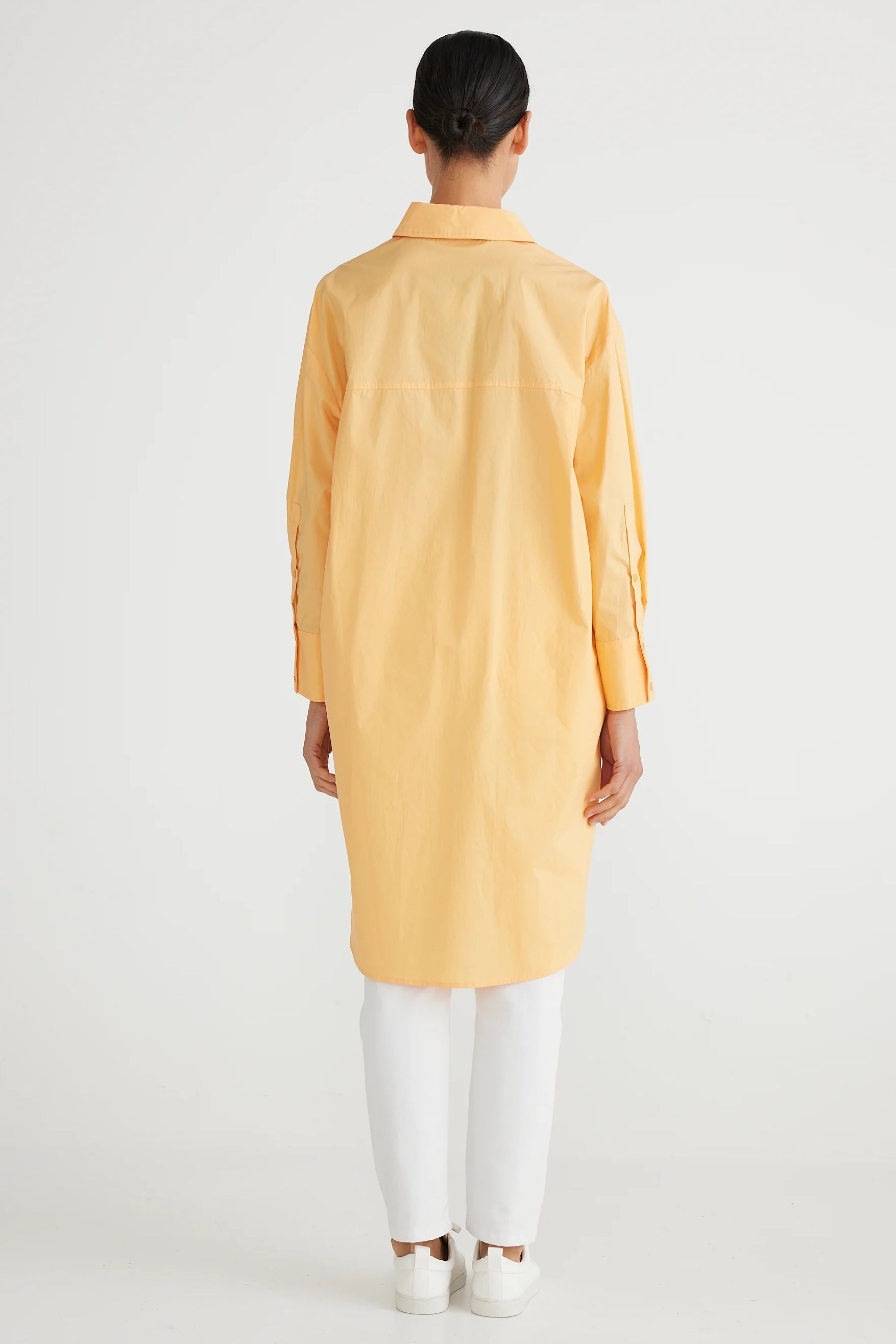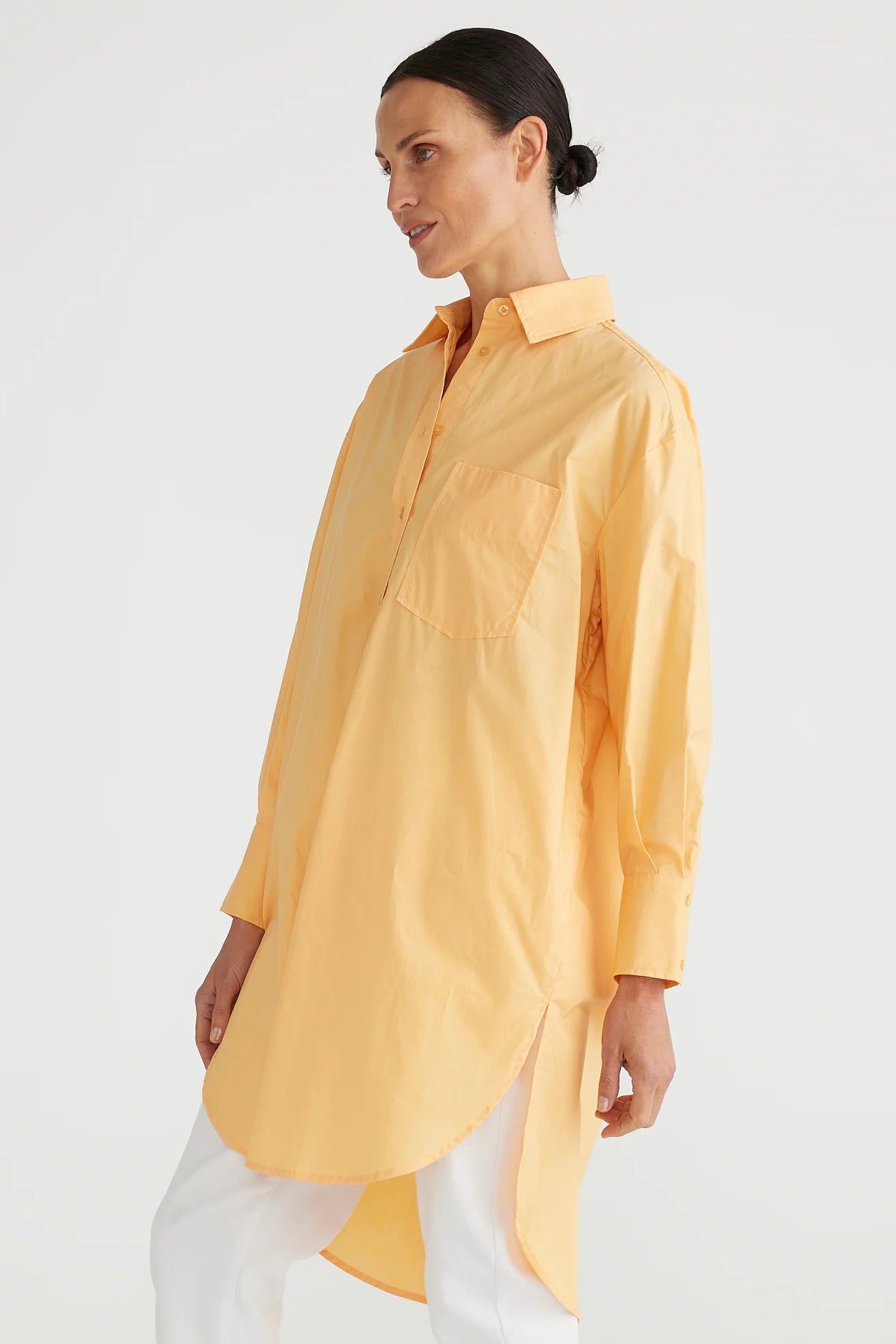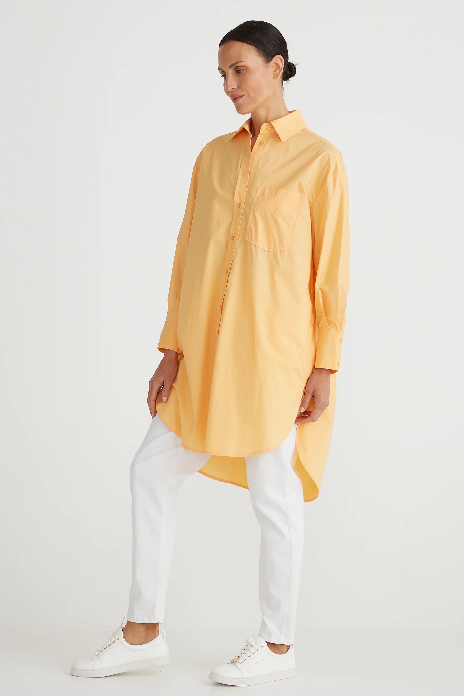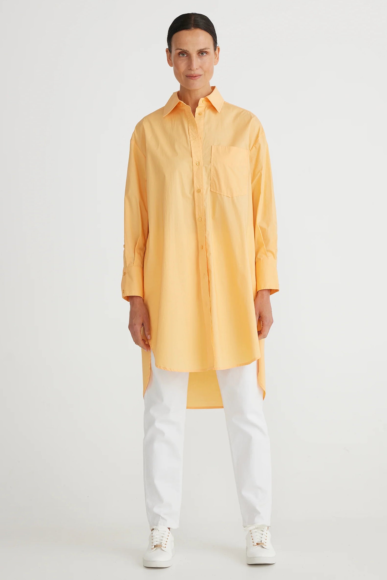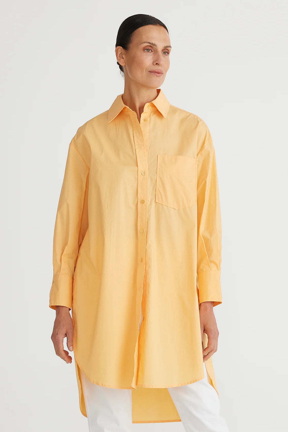 The General Shirt in Melon is a long line tunic. Also Available in White and Black.