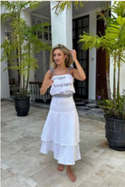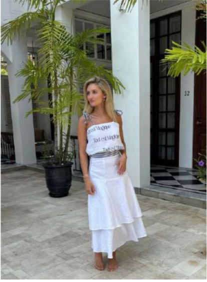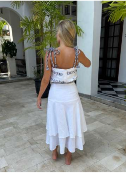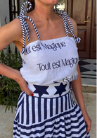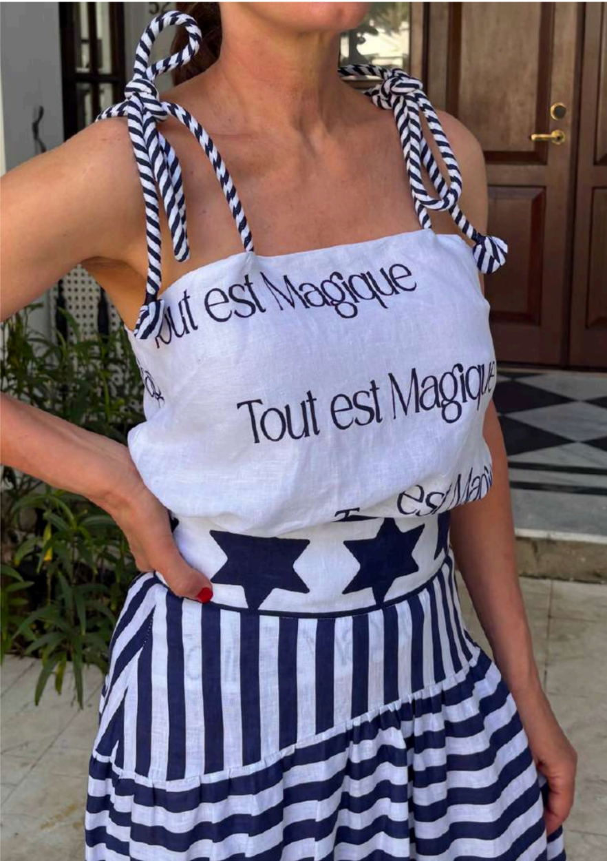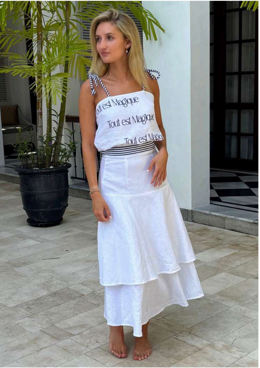 A modern linen cami with Parisian flair. The Tia features a chic bias cut with candy-stripe