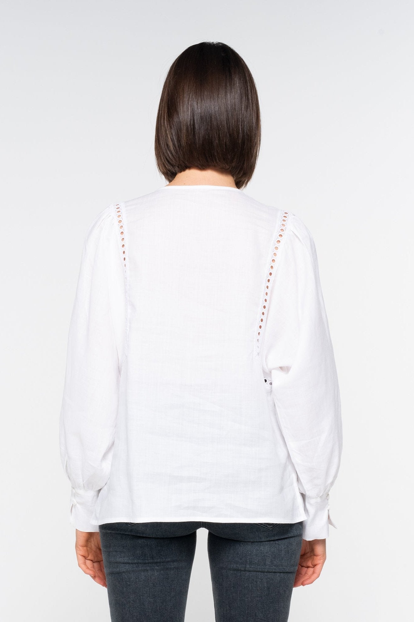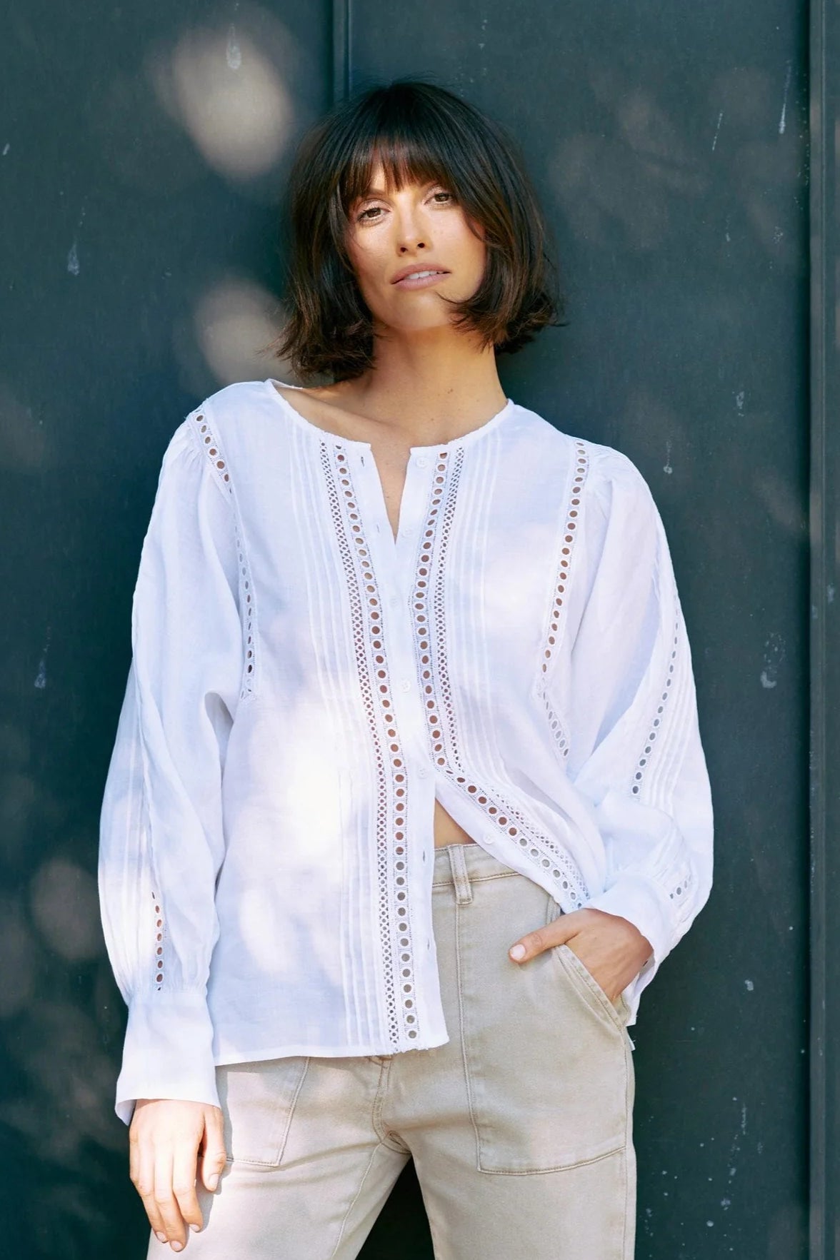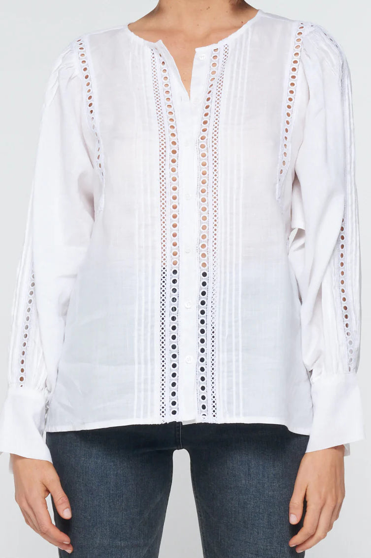 This lace-trimmed romantic piece lightens the mood for trans-seasonal dressing. Circular lace trim offers a finished yet relaxed aesthetic. The perfect partner with denim for now and when the weather begins to cool.