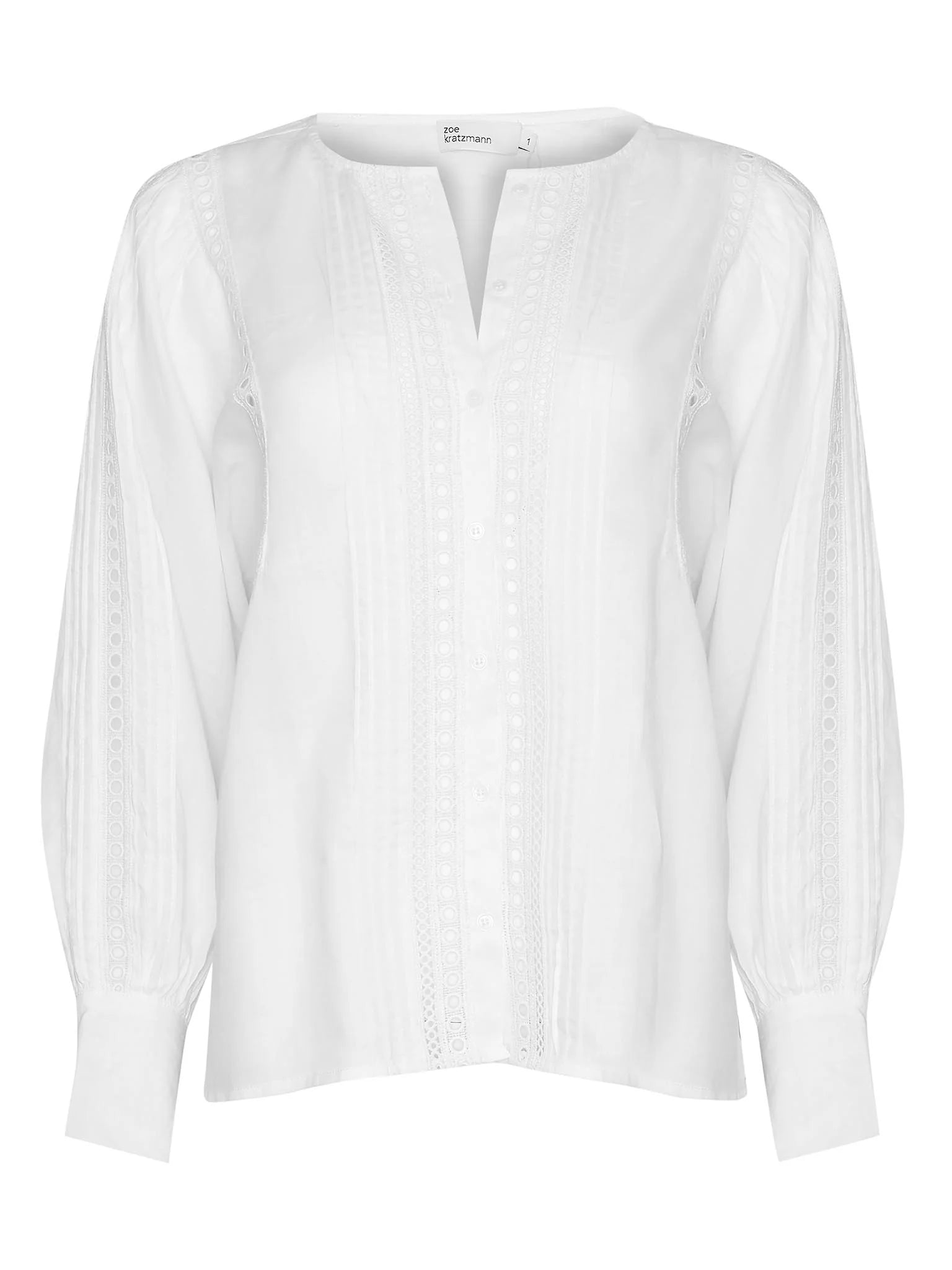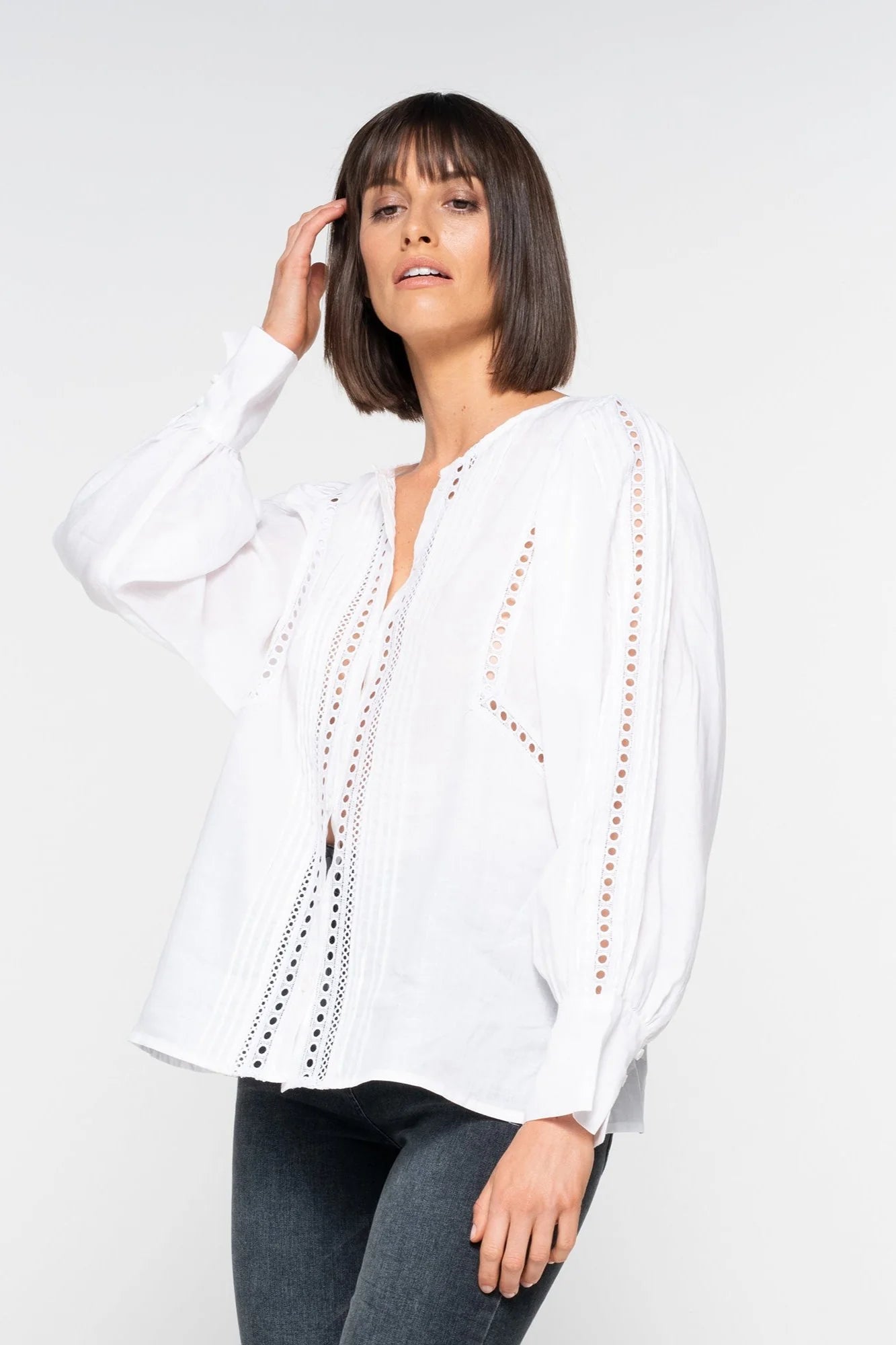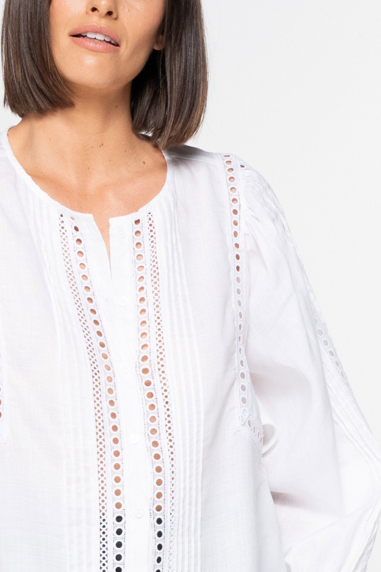 This lace-trimmed romantic piece lightens the mood for trans-seasonal dressing. Circular lace trim offers a finished yet relaxed aesthetic. The perfect partner with denim for now and when the weather begins to cool.