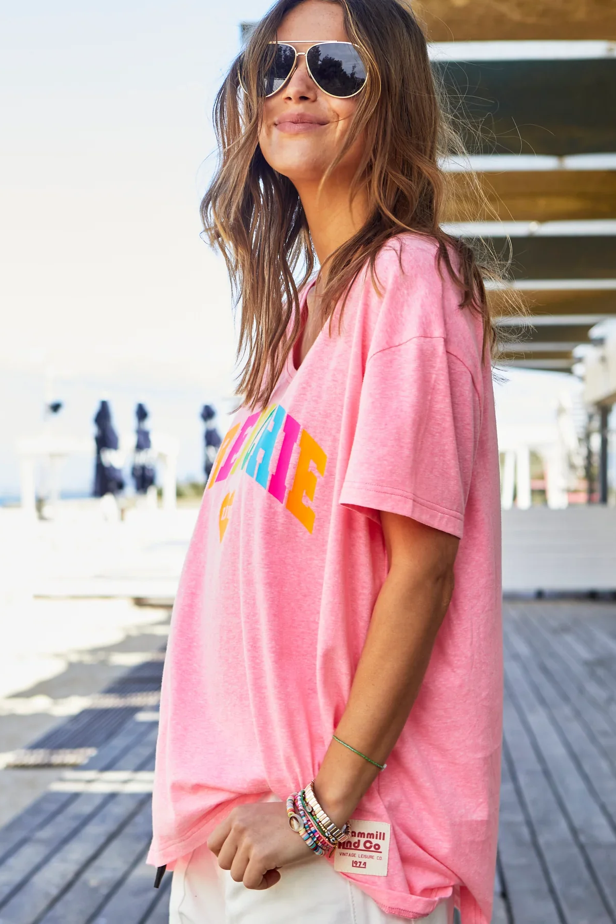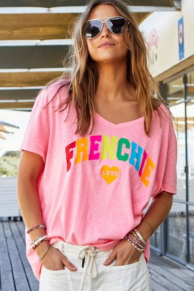 Slouchy V neck tee in hot pink marle jersey with multi coloured Frenchie print on the front.