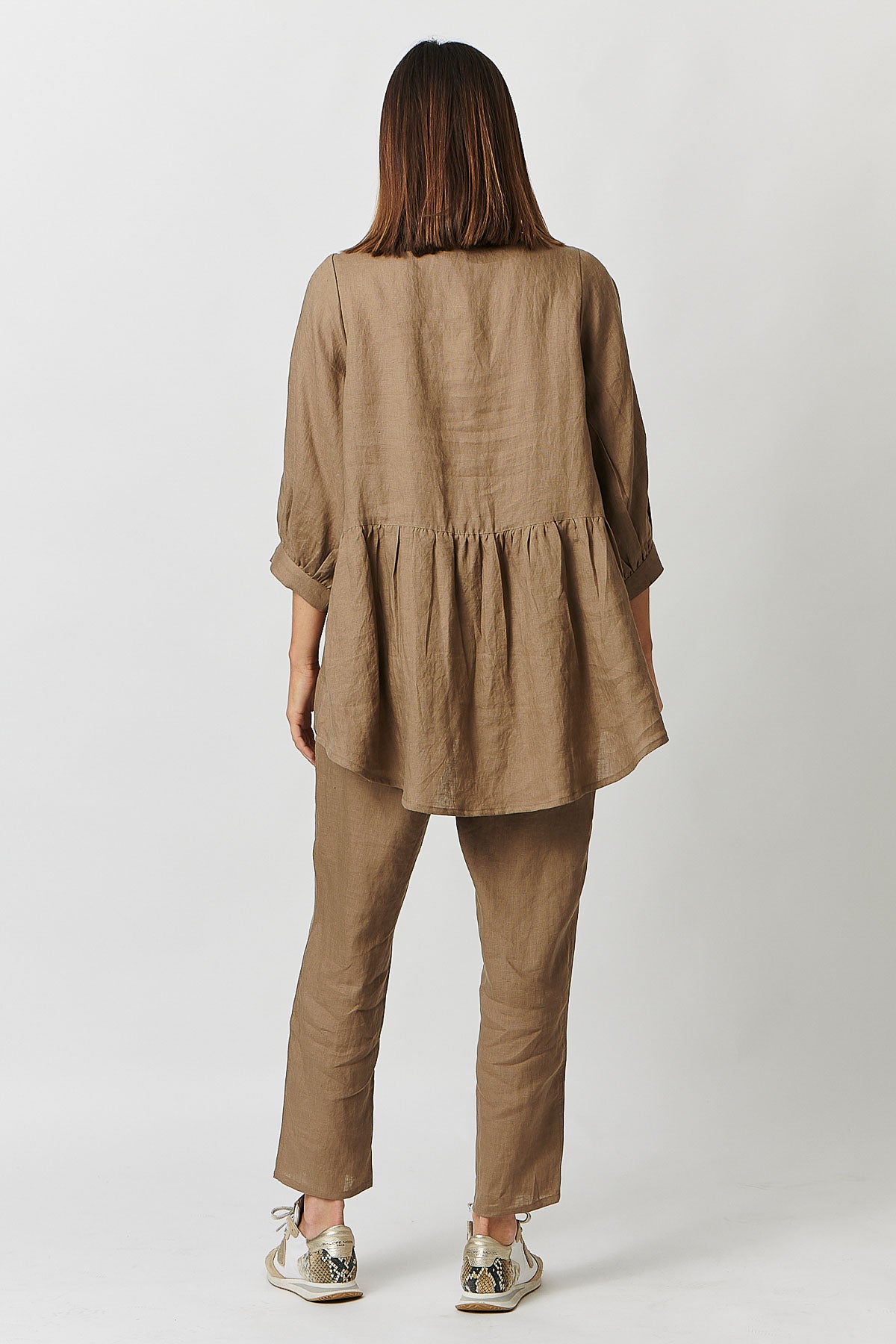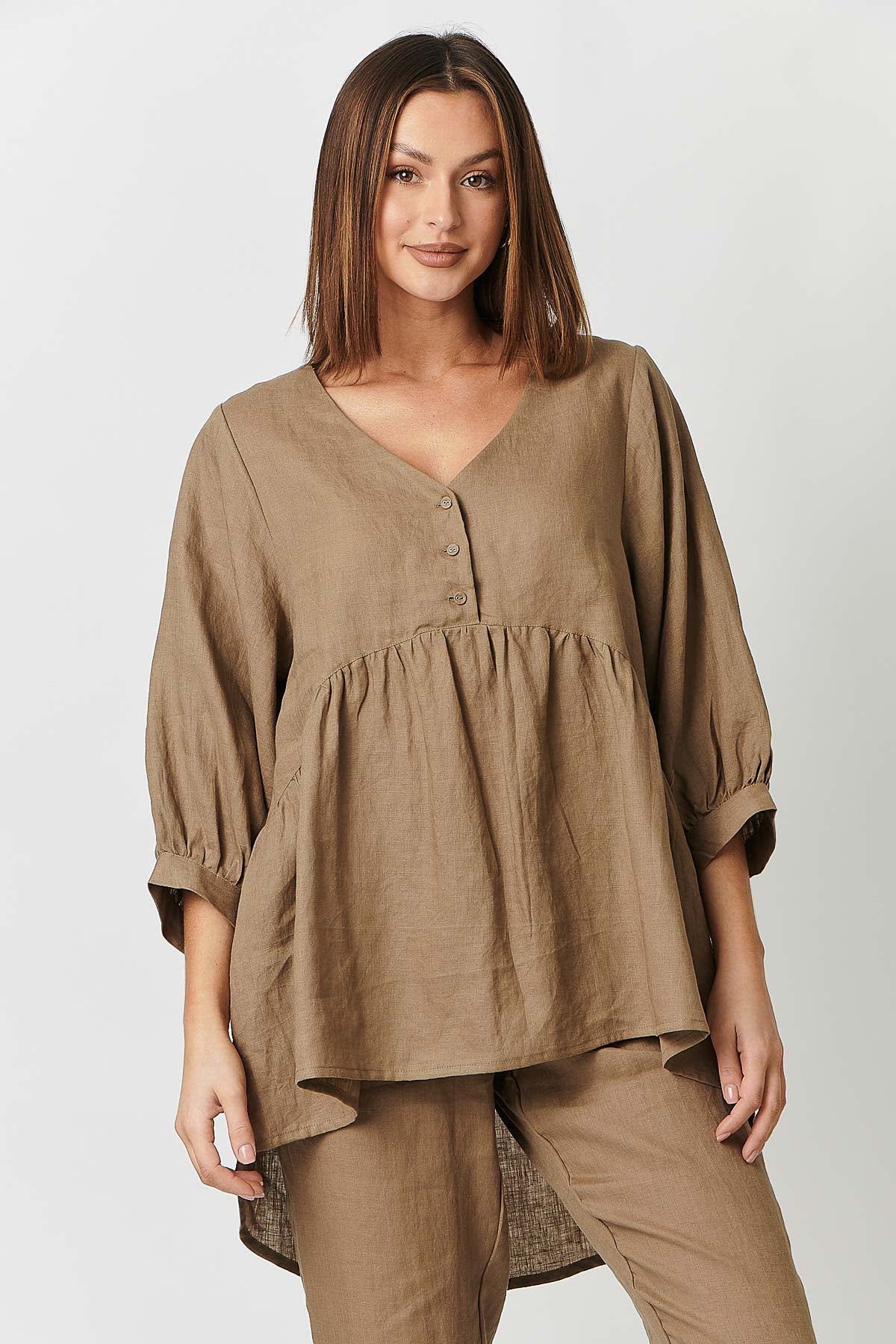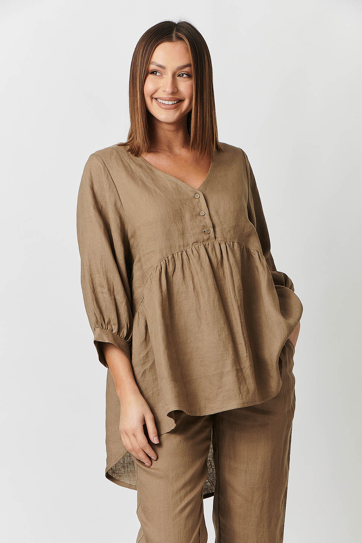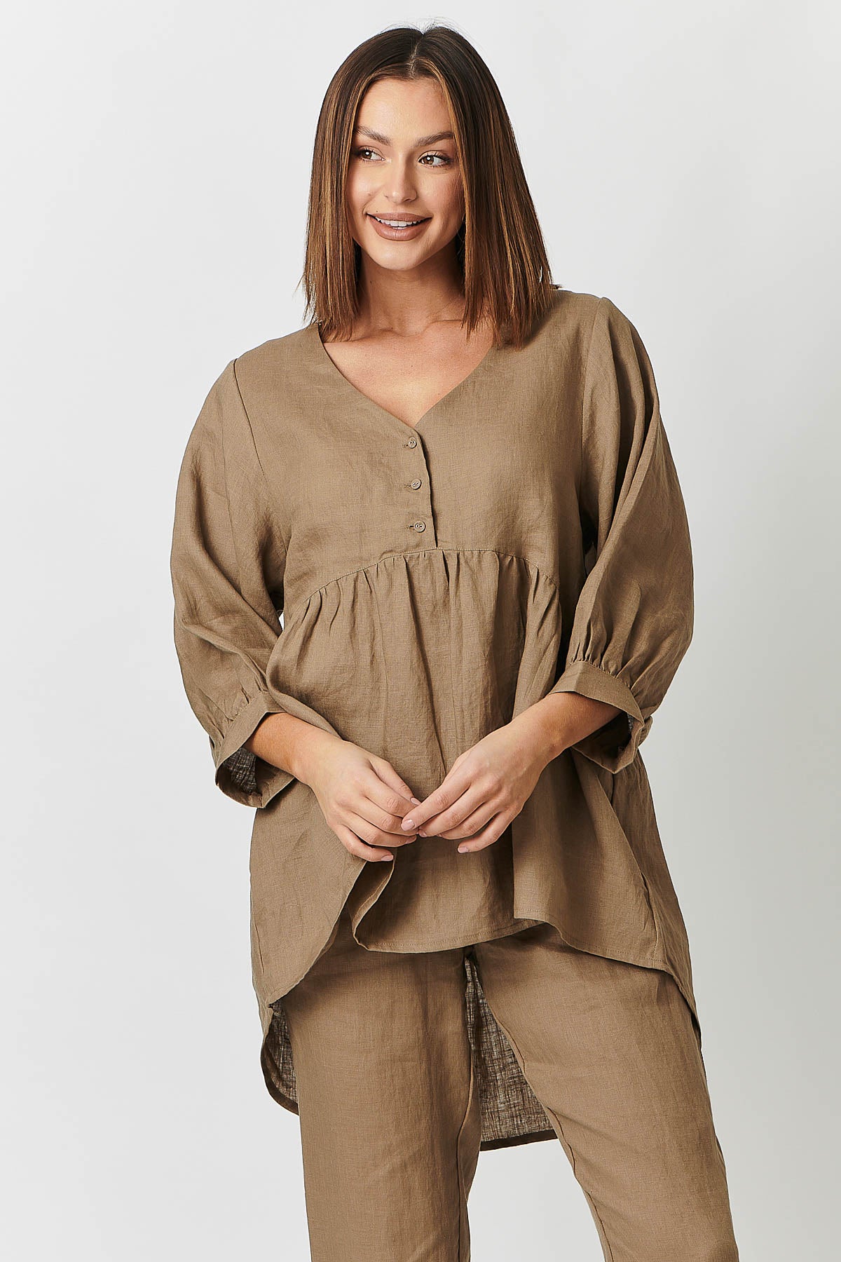 The V Neck Swing Tunic by Naturals by O&J is a fun and versatile style. Featuring a v neck, subtle flounce 7/8 sleeve with a high-low hem.