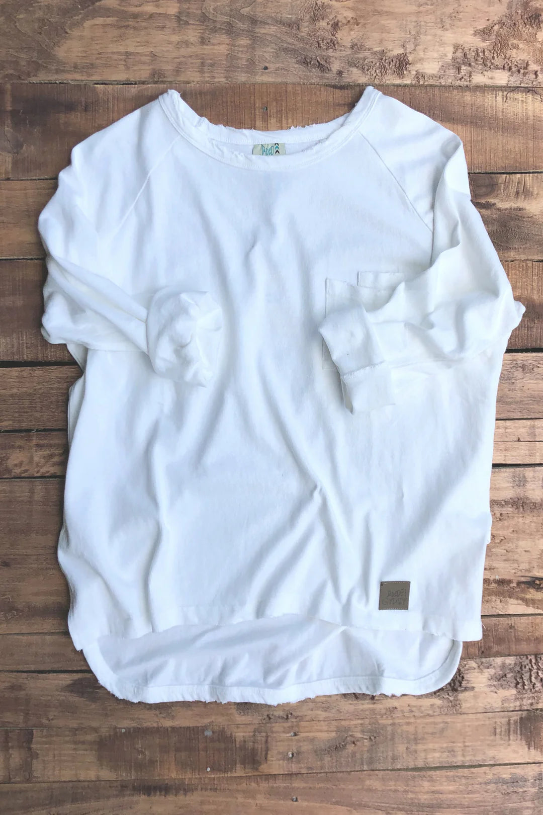 Cool vintage vibe sweat with distressed hem lines around edging that is not considered a fault. Crew neck and great length for tucking anyway you prefer. This long sleeve tee is only going to get better with each wear. A good basic that will pair back with any of our amazing layering items in Jaded Gypsy. Try our Early Morning Walks Flannel Shirts over the top for an easy flattering style with jeans and sneakers.