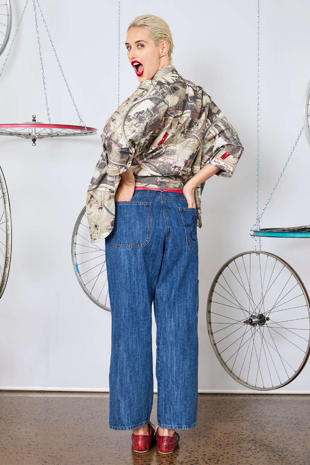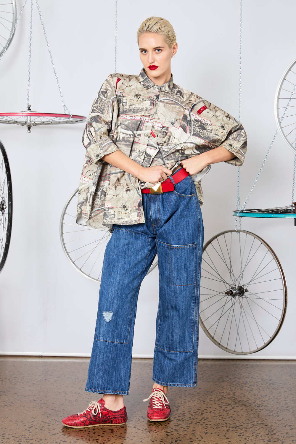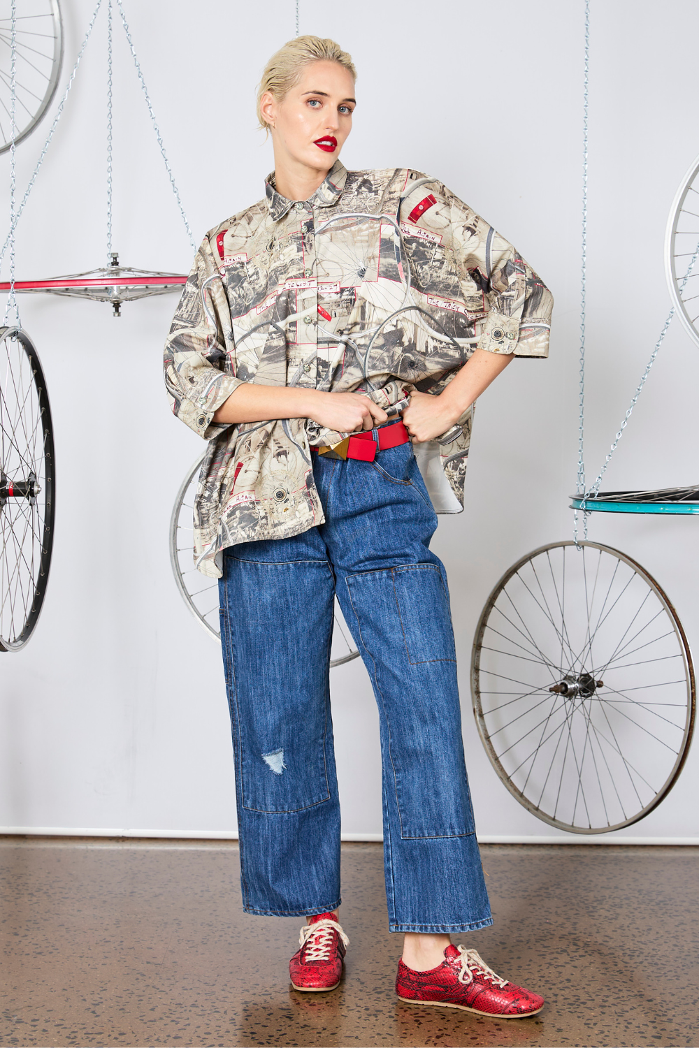 This 100% cotton shirt blends timeless tailoring with distinctive design. Featuring an all-over print of vintage bicycle photographs and subtle pops of red, it adds character to a classic button-up style. Designed with an oversized, boxy fit and 3/4-length sleeves, the Wheelie Shirt offers a relaxed yet put-together look. Signature Maud portrait buttons adorn the front placket and cuffs, while a curved hem with subtle side splits adds a touch of movement and shape.