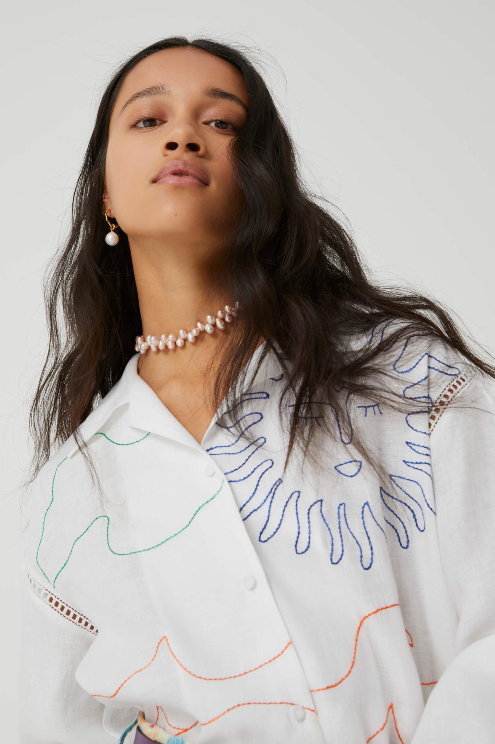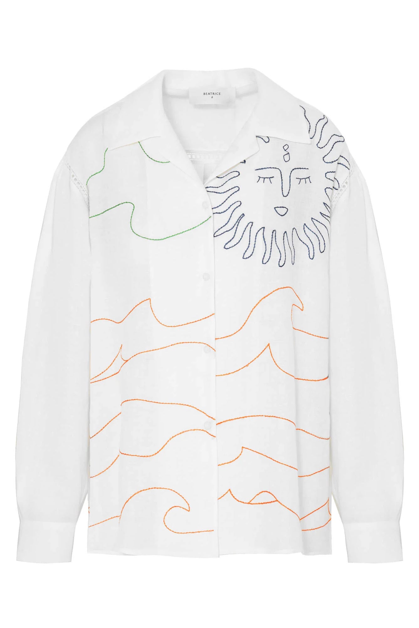 Summery, fresh and ironic, this shirt carries a free and vacation mood. Made of hemp, it features bowling collar with button arrangement on sight, long sleeves with cuff at the bottom and maxi multicolour embroidery on the front. Made in Italy.
