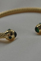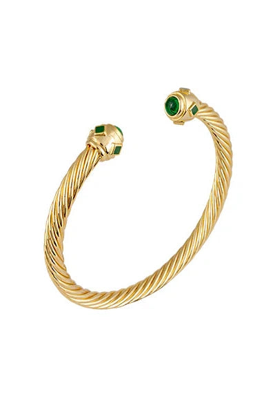 The Adeline Bangle by Zahar features an open style bracelet in 18ct gold plating with a twisted style and finished with a green cabochon stone at each end.