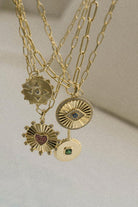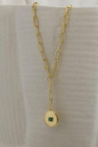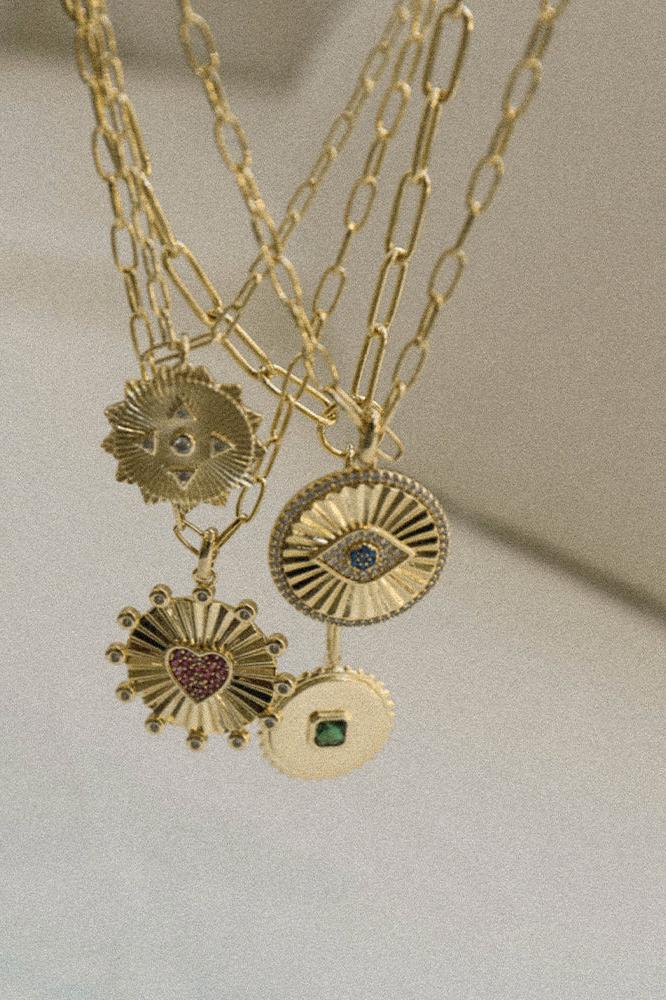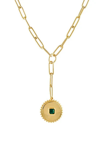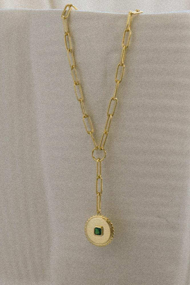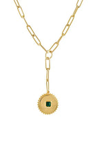 The Alison Necklace by Zahar features a unique circular pendant with a green cubic zirconia stone placed in the centre. The statement chain and pendant both have a high shine gold finish.