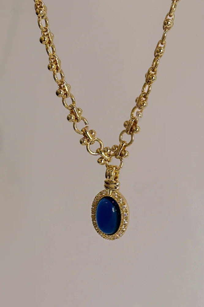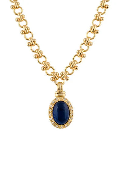 The Belinda Necklace by Zahar features a blue cabochon stone set and suspended from a polished 18k gold chain.