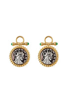 The Delilah Earrings by Zahar feature a coin design with antique silver and gold plating suspended from a bar with green agate gemstones.