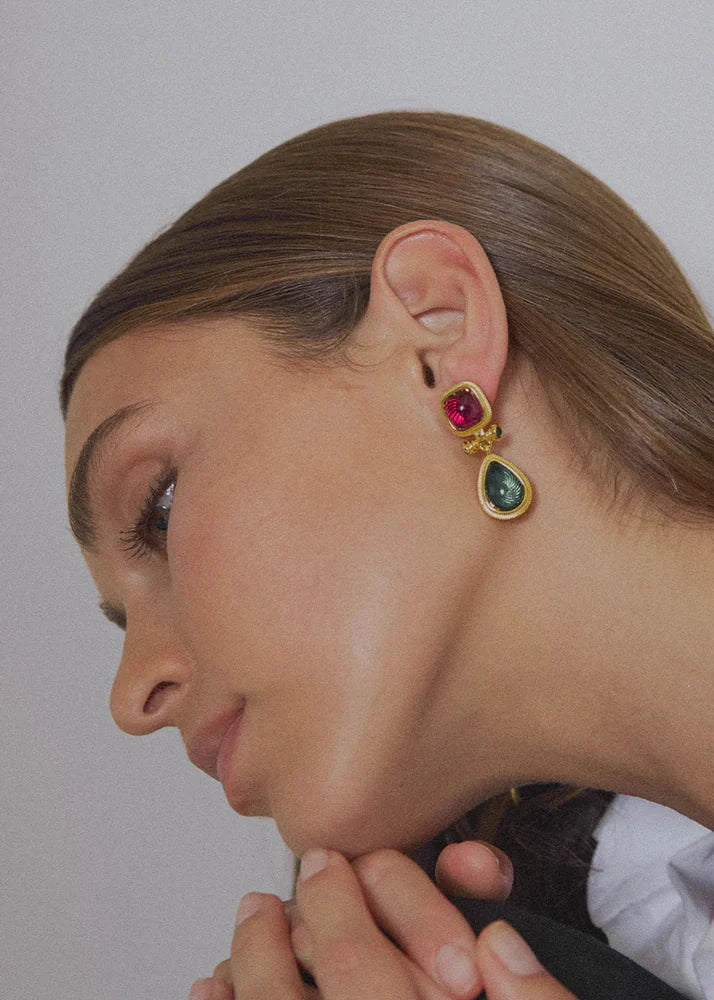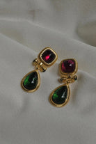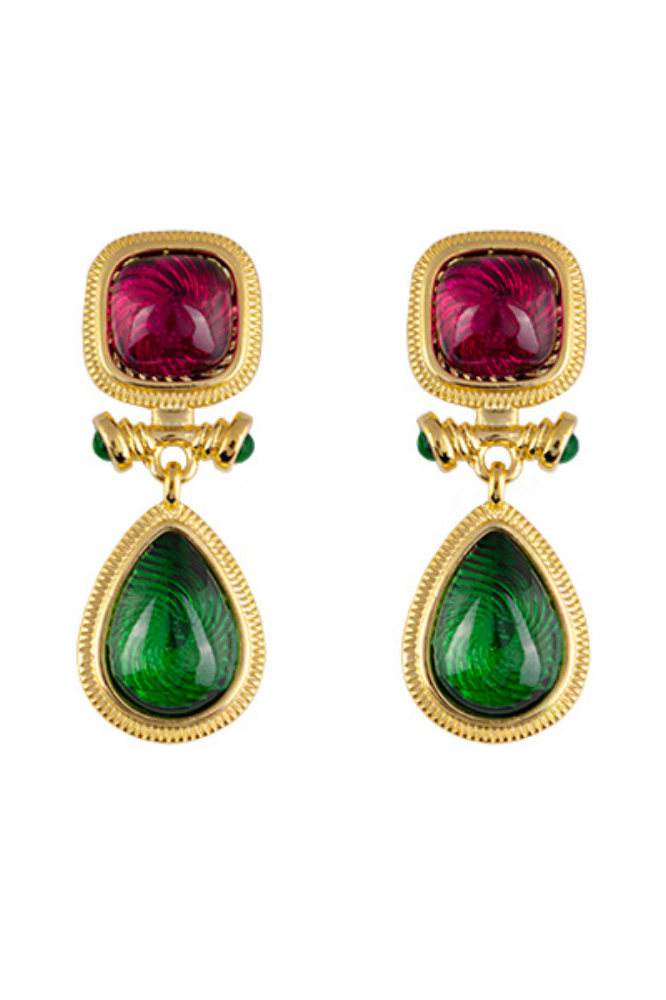 The Helen Earrings by Zahar feature double drop with a fuchsia and green coloured stone encased in 18ct vintage look gold plating.