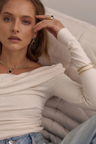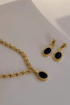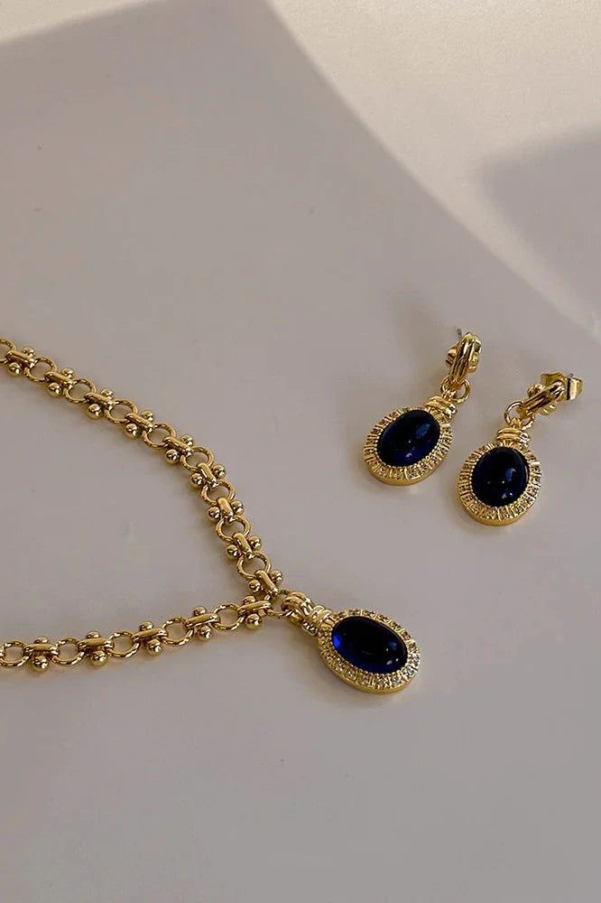 The Joanna Earrings in Blue by Zahar feature a blue cabochon stone suspended and set in 18ct gold plating.
