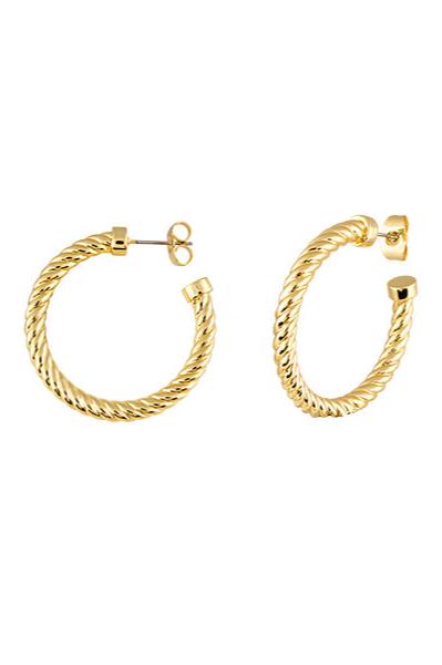 The Wren Earrings feature a large open hoop in 18ct gold plated twisted design.