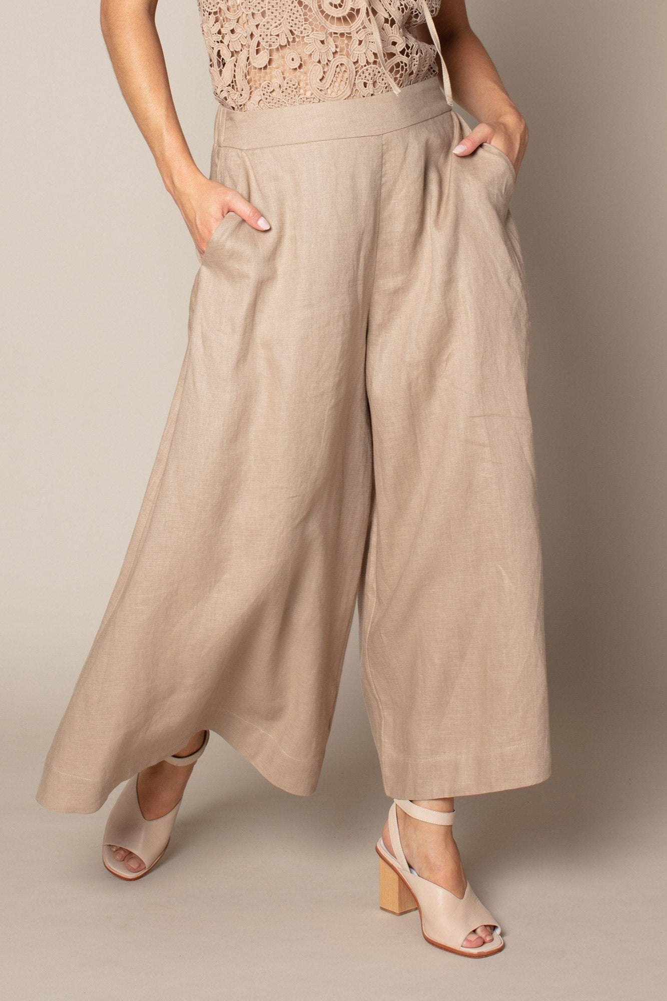The Court Pant by Zoe Kratzmann has clean lines and maximum movement. A flat front and softly elasticated rear waist create a flattering silhouette. The sweeping ¾ leg pushes the boundaries of a wide leg pant. Angled pockets seal the deal on this winning style.