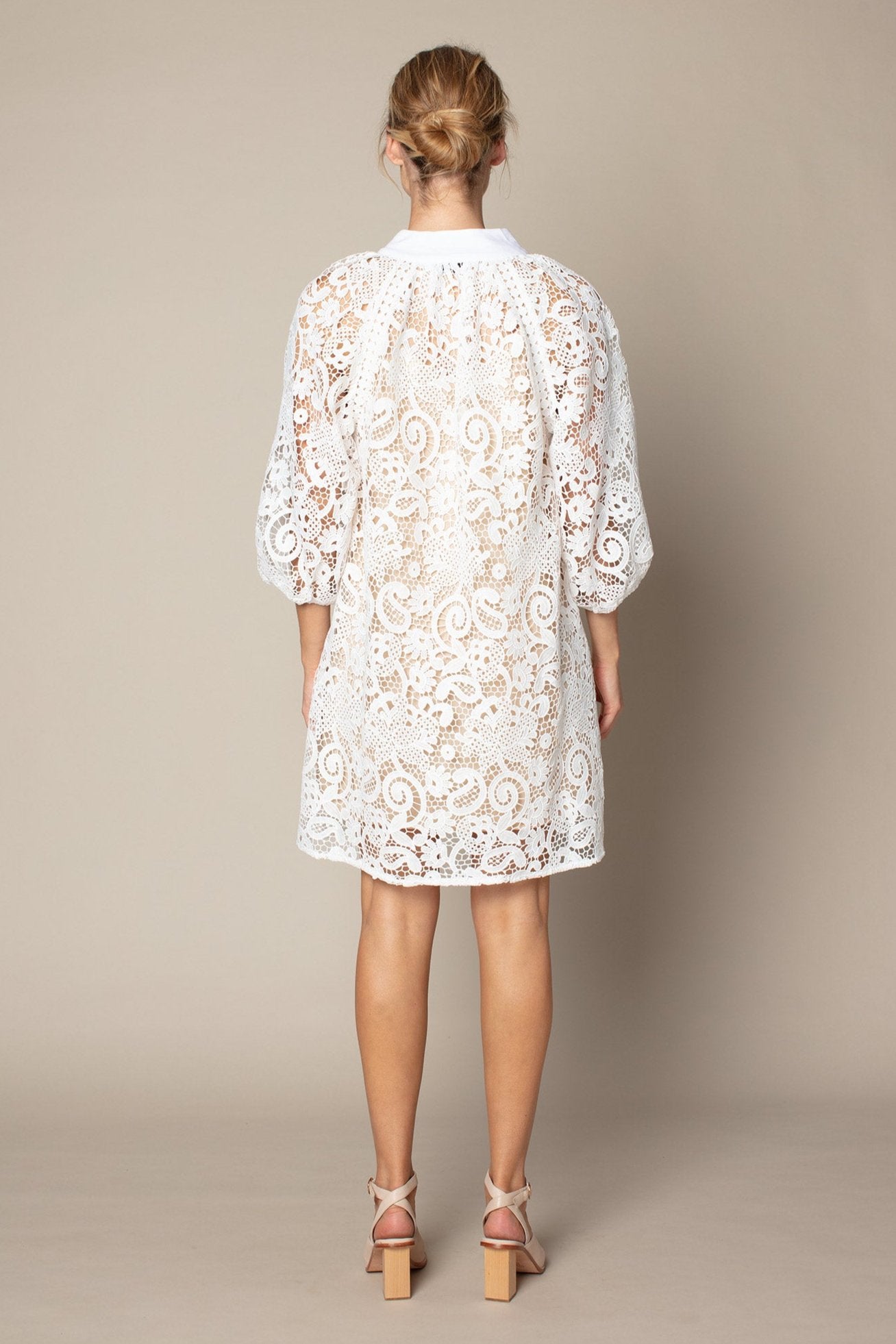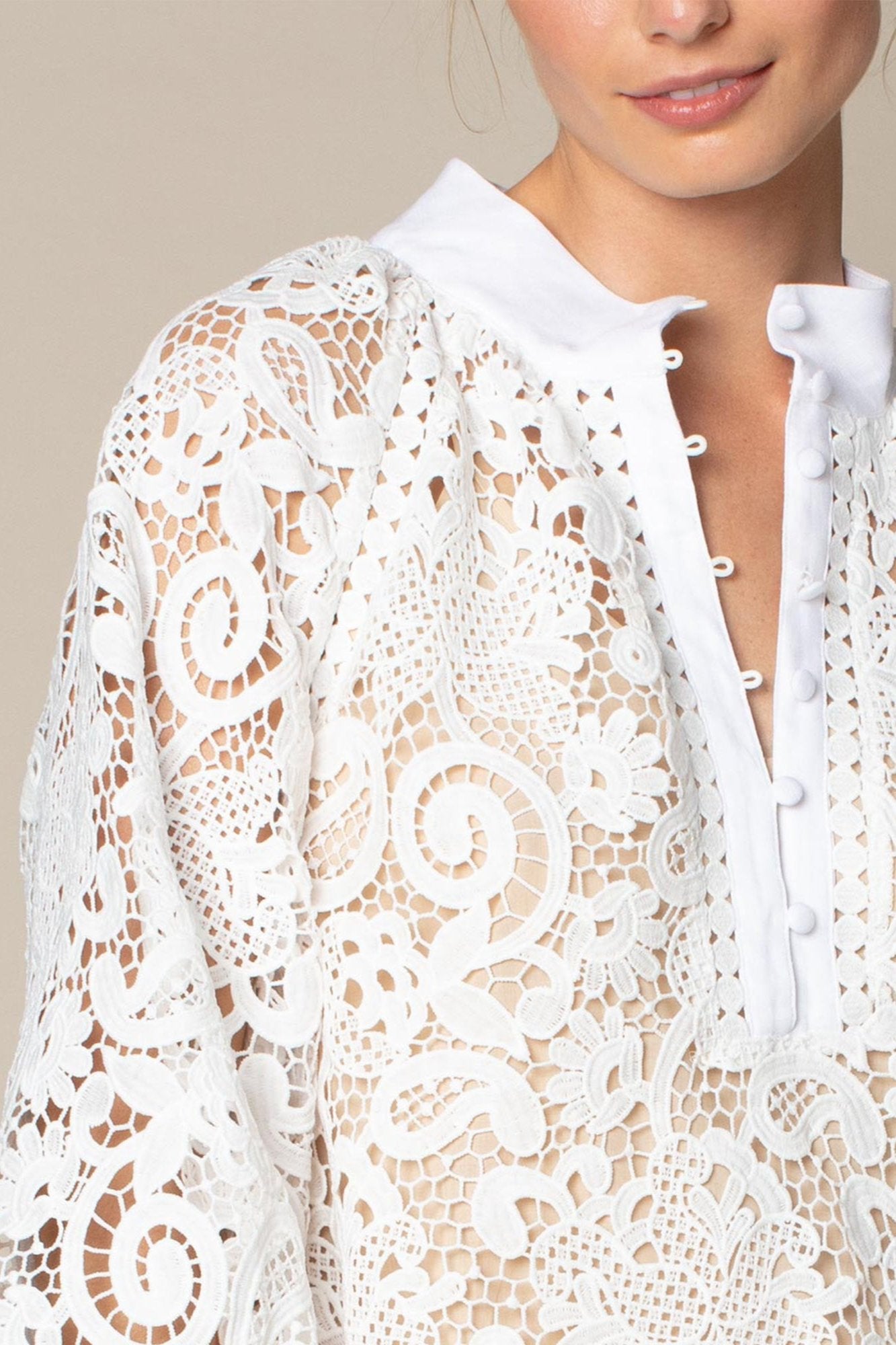 - cut in quality guipure lace with delicate covered buttons and a soft blouson sleeve